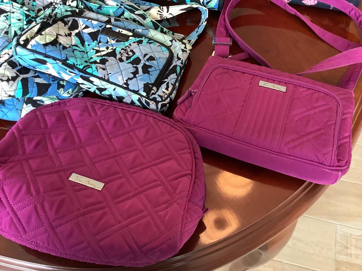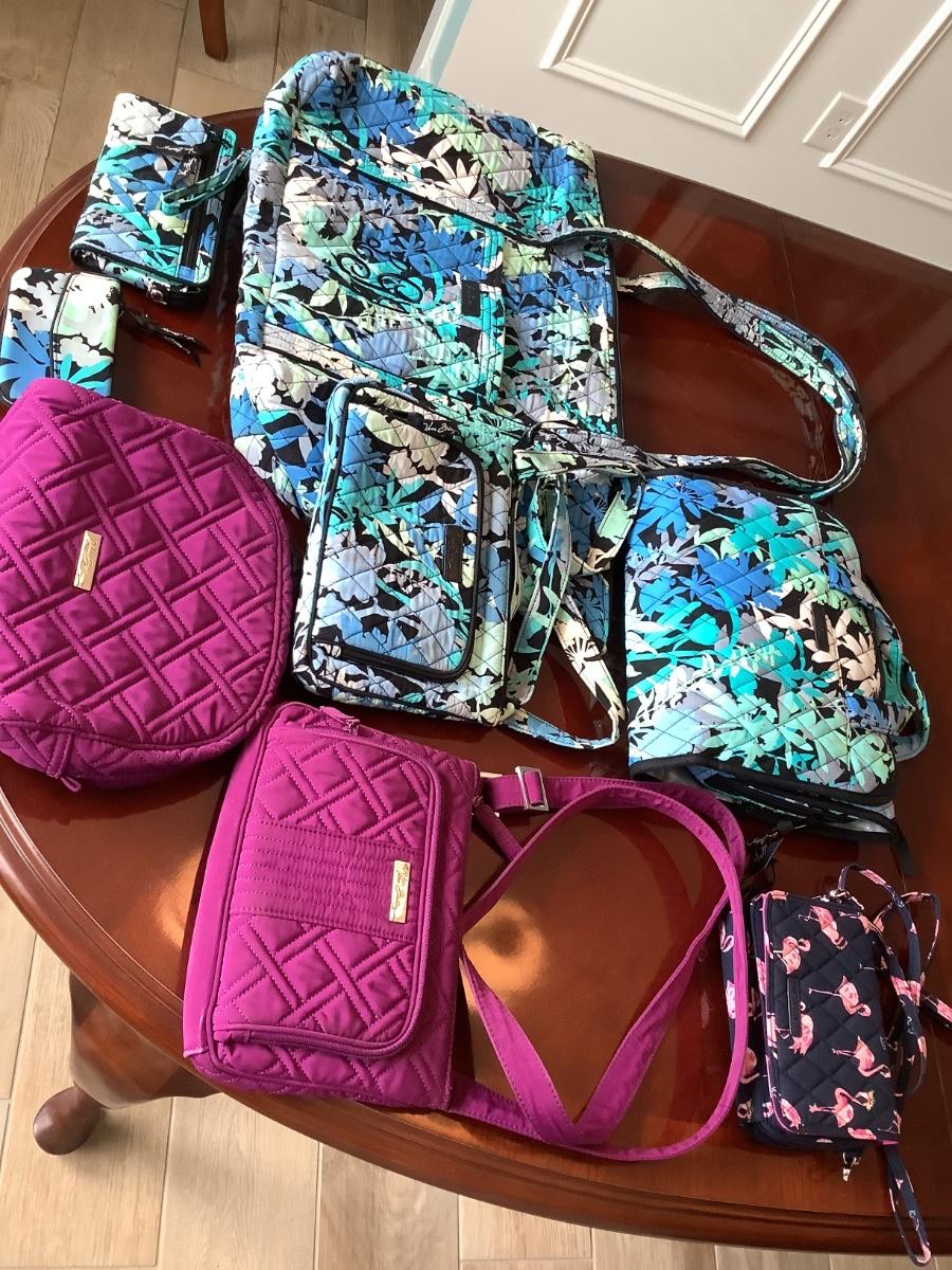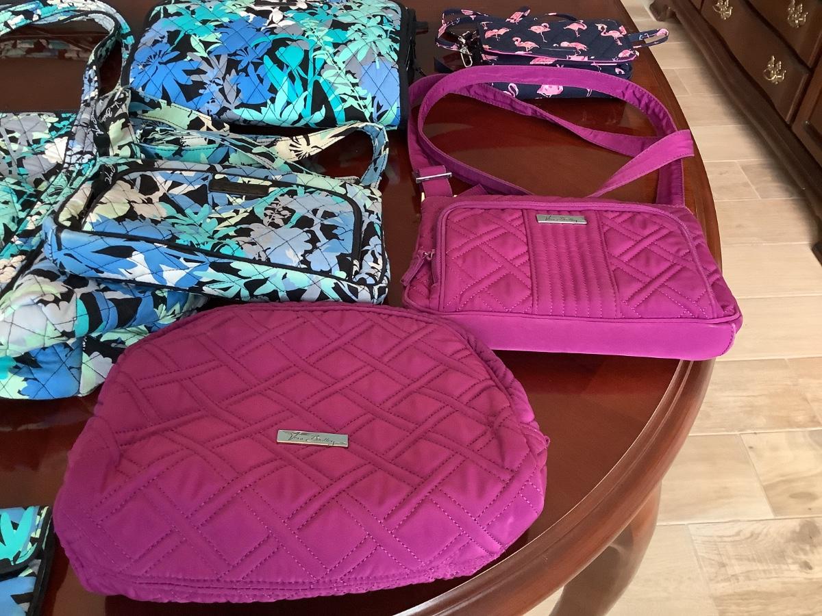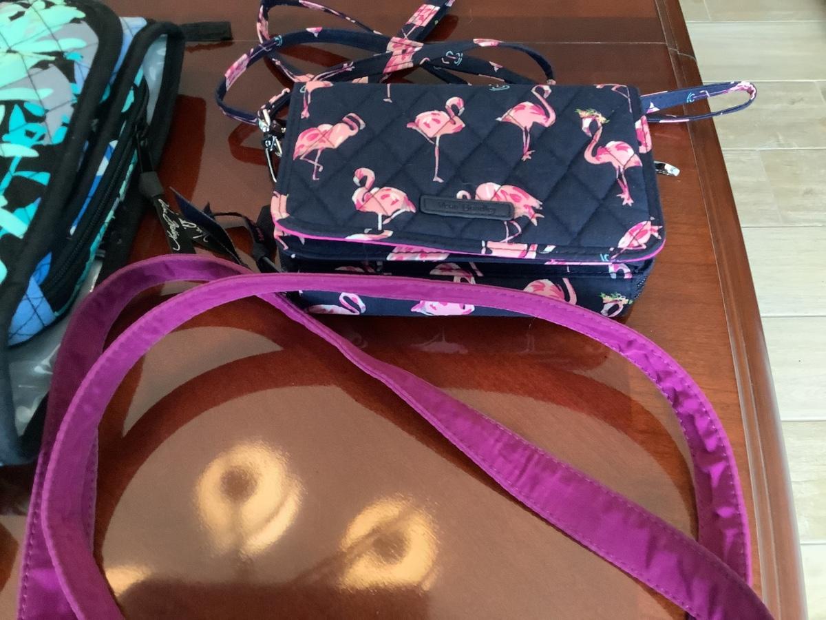 Vera Bradley lot-5 in blue pattern, cosmetic, cross body, wristlet wallets, large bag has monogram, 2 maroon crossbody & cosmetic, 1 flamingo cross body