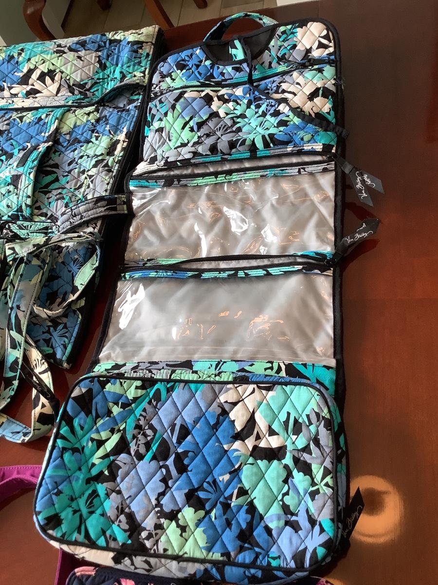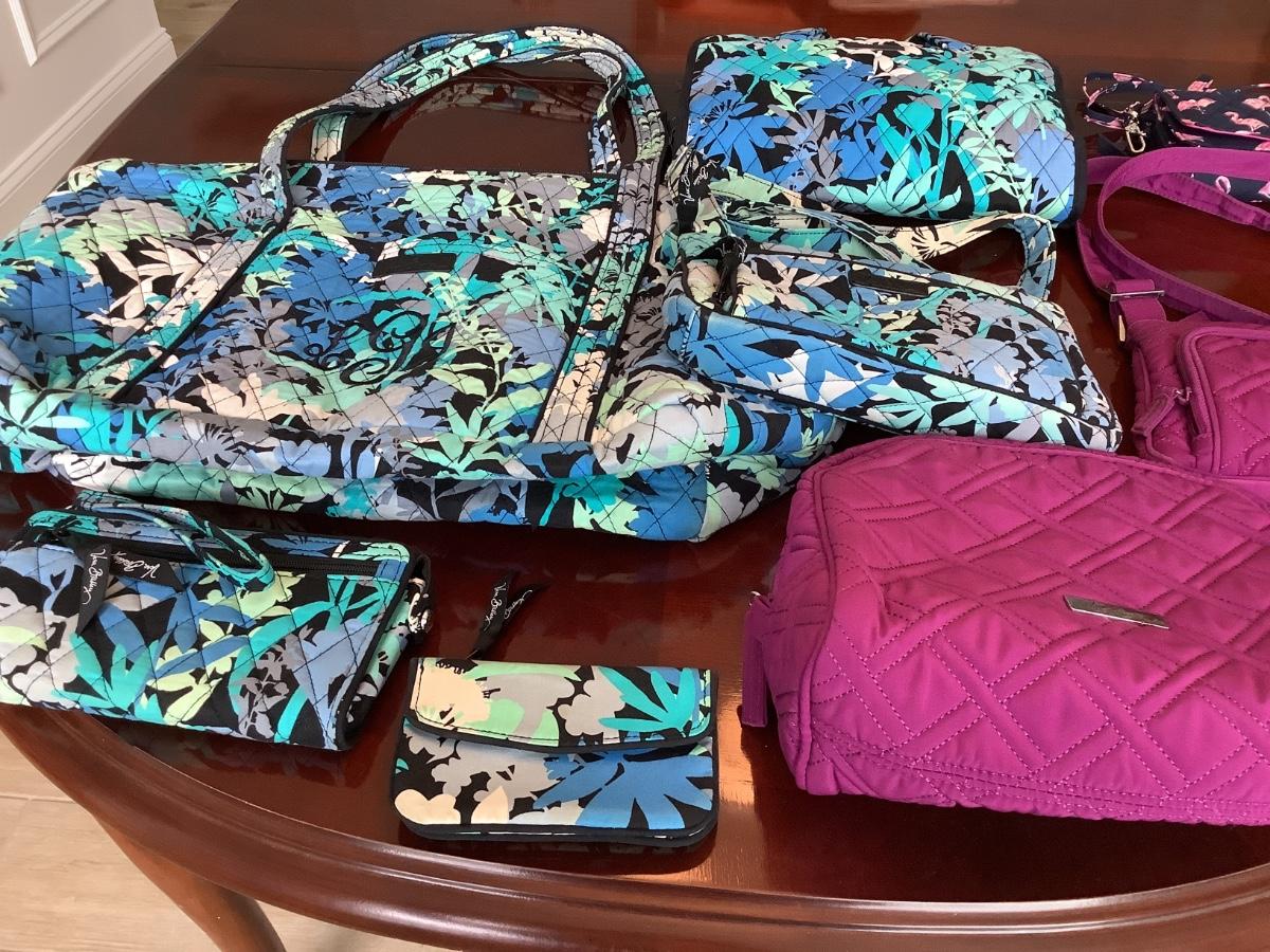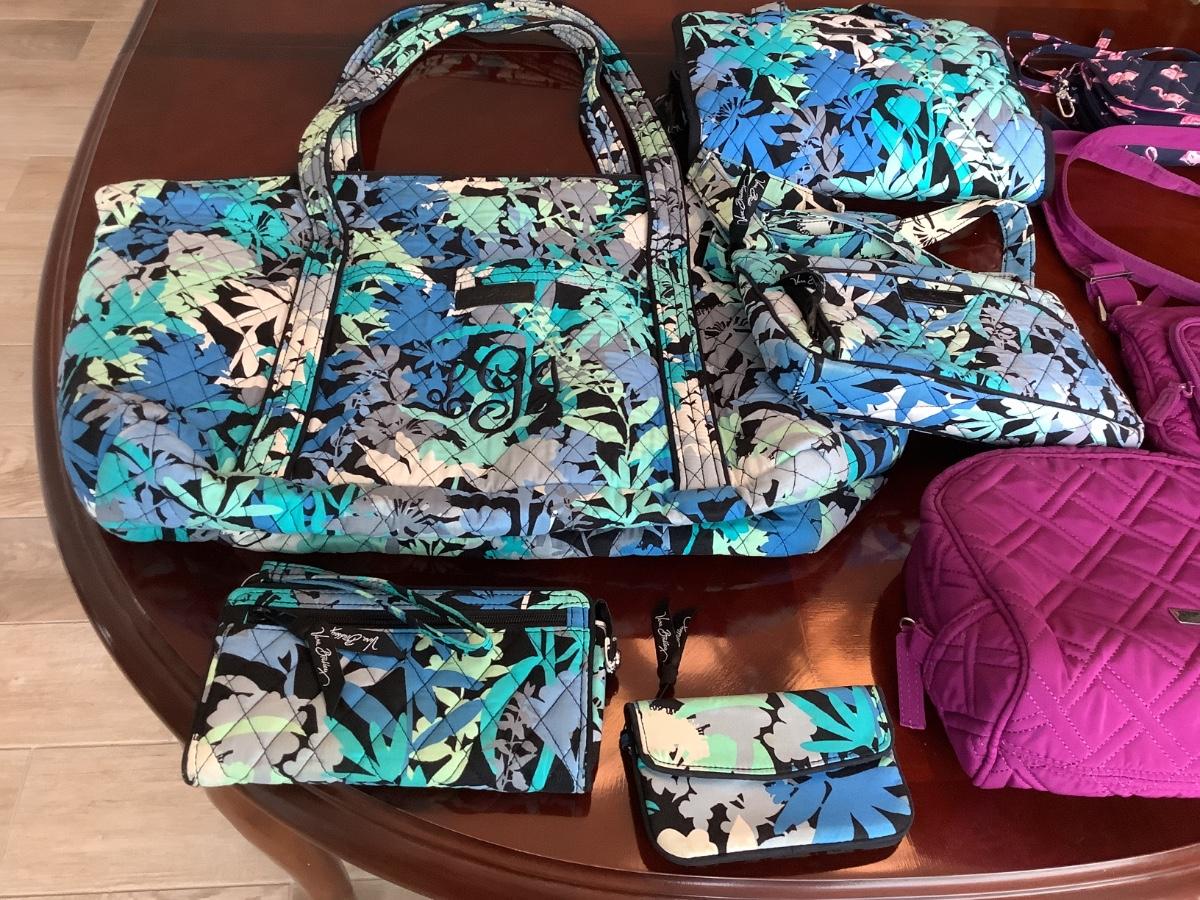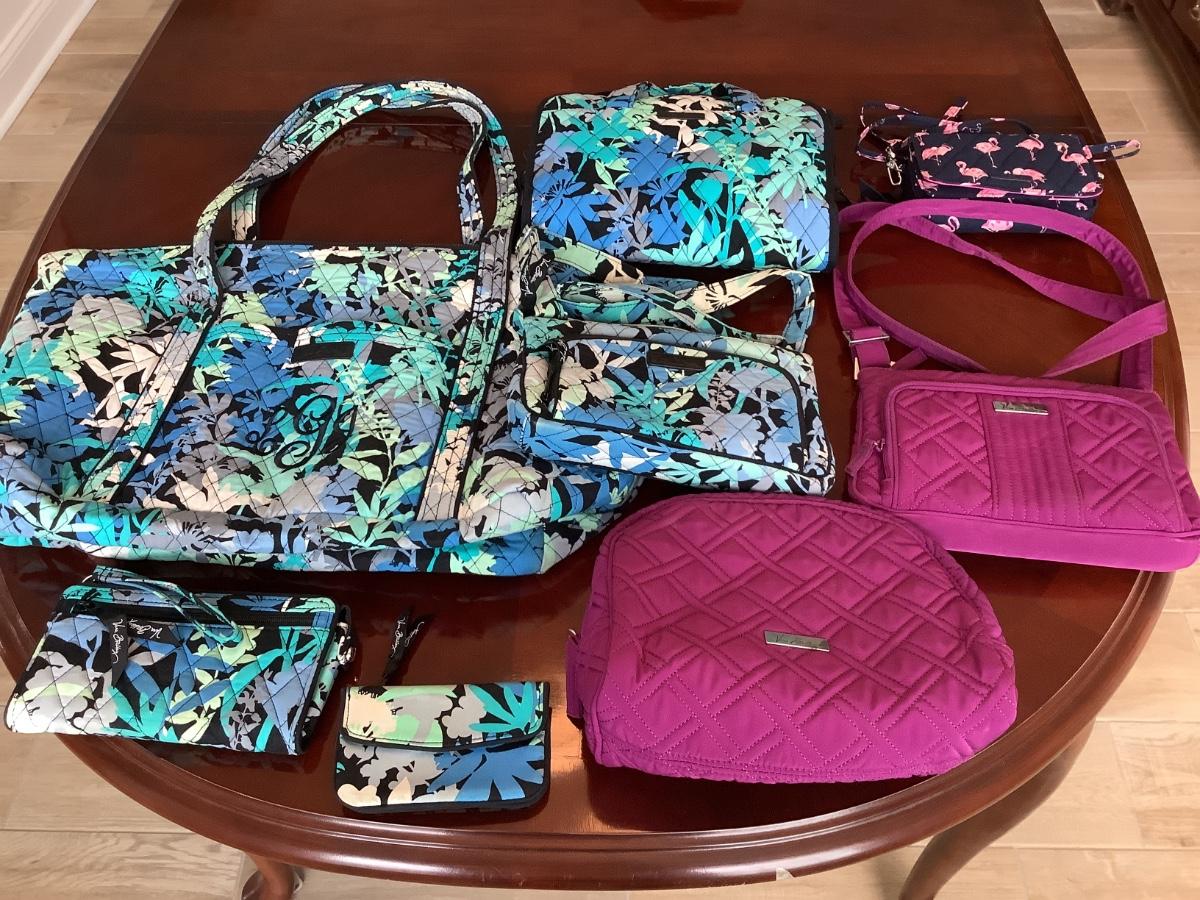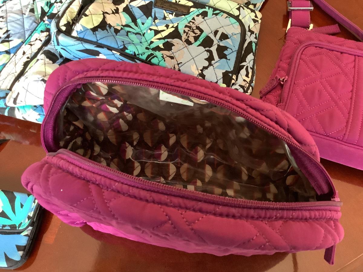 Vera Bradley lot-5 in blue pattern, cosmetic, cross body, wristlet wallets, large bag has monogram, 2 maroon crossbody & cosmetic, 1 flamingo cross body
