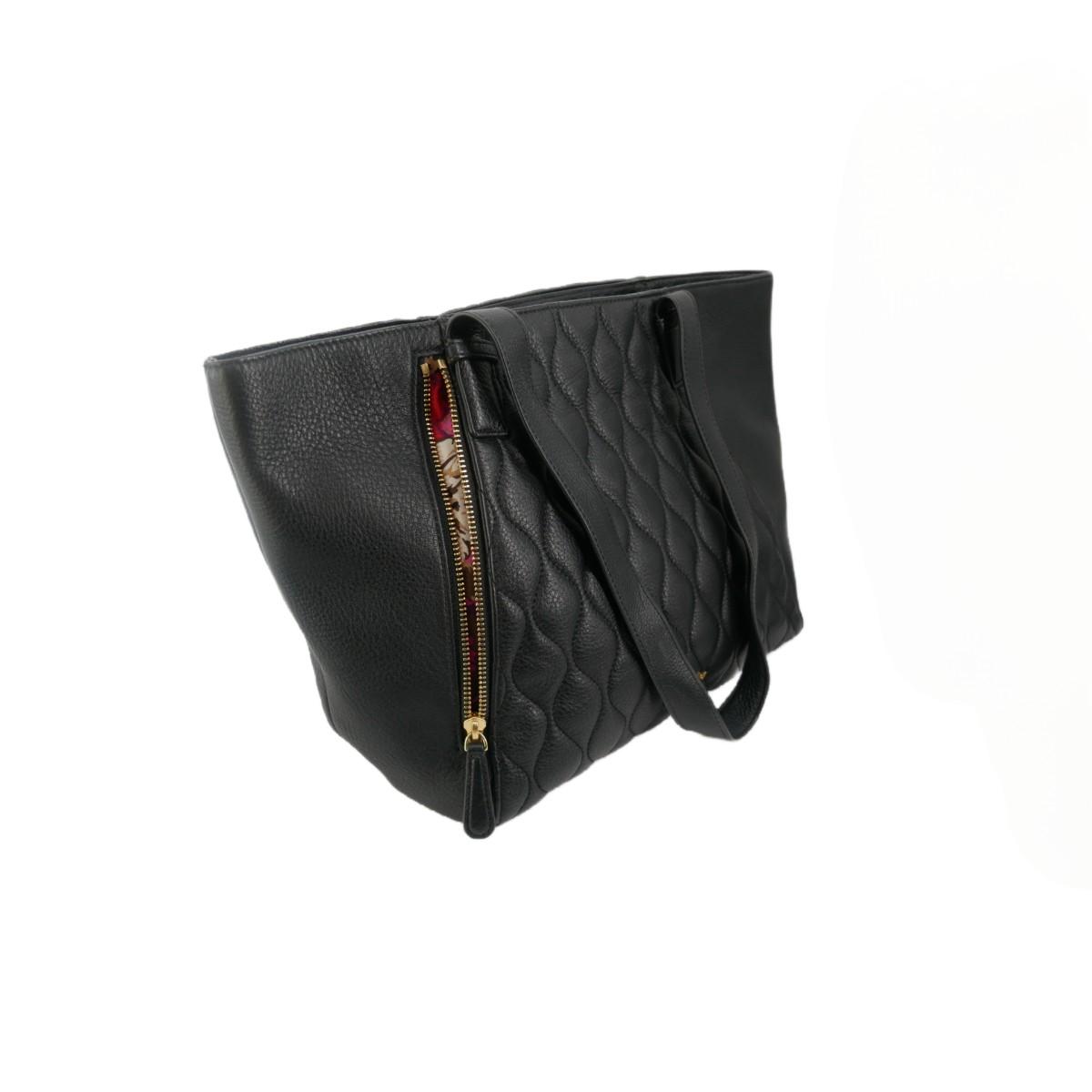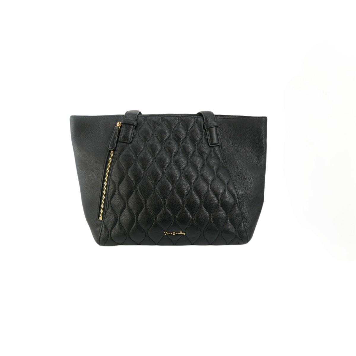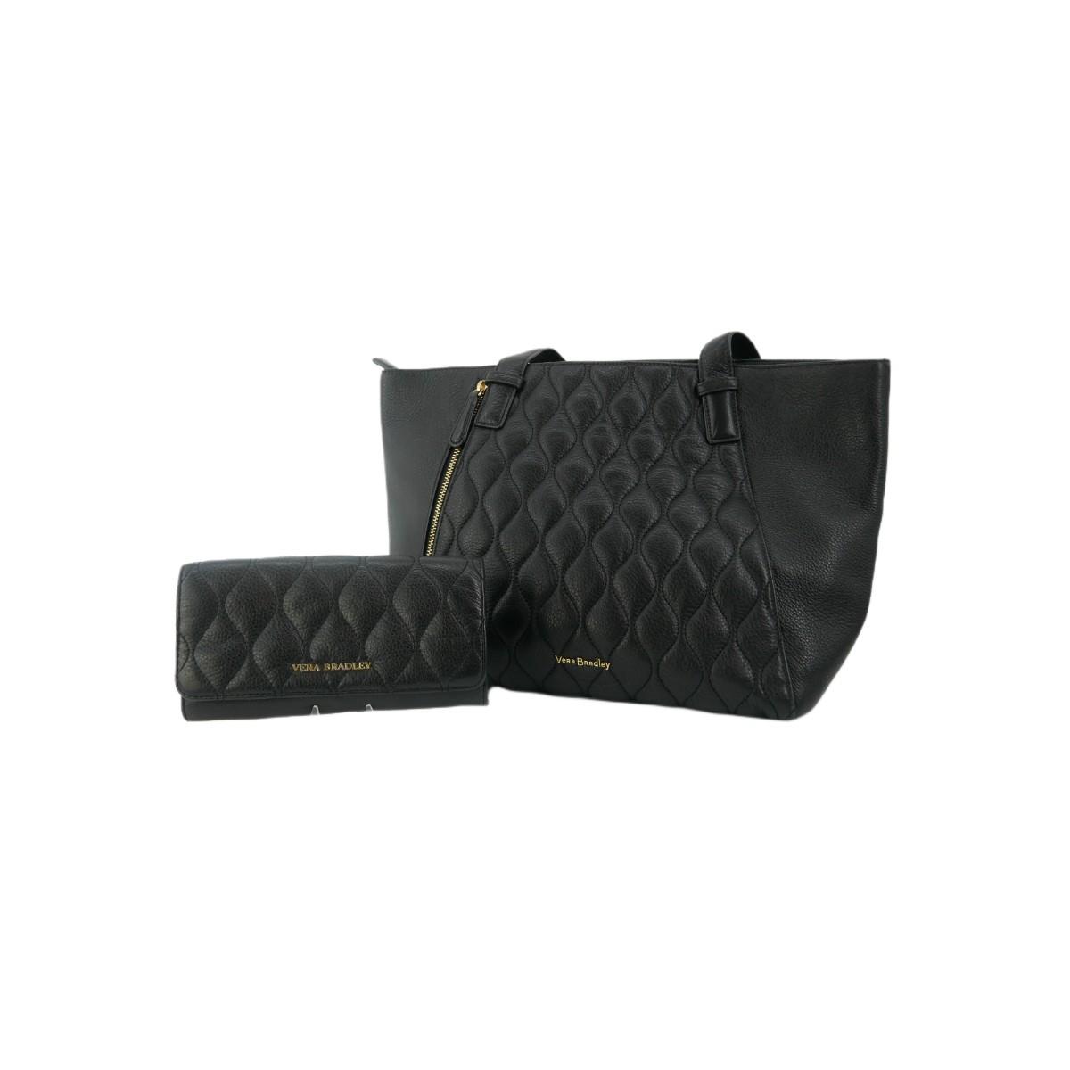 Beautifully made matching purse and wallet by Vera Bradley. Both are black quilted style leather with gorgeous pink, red, and gold floral interior lining. Very chic and modern gold zipper and pull accents. Wallet measures L 8" x H 4" x W 1". Shoulder bag purse has outside hidden compartment that closes with magnet as well as. front zipper pocket with floral interior. Two more compartments and one zipper pocket inside the bag. Purse measures L 16" x H 11" x W 5" with a strap length of approximately 11". Bottom has gold accent feet to sit the purse. Excellent condition! No issues found. Lot weighs 2 lbs. (F10)
