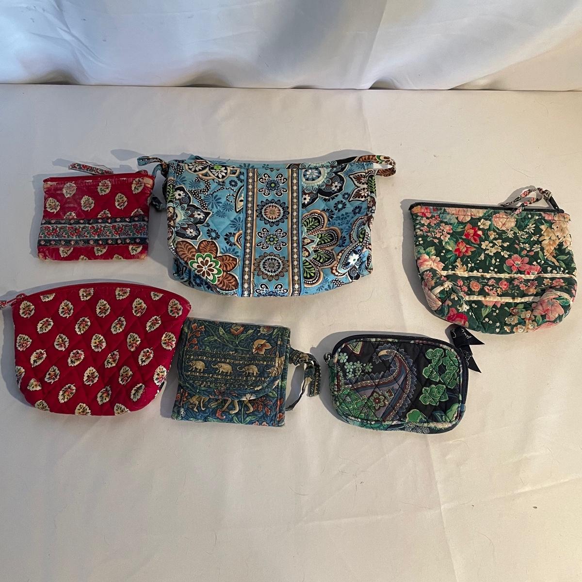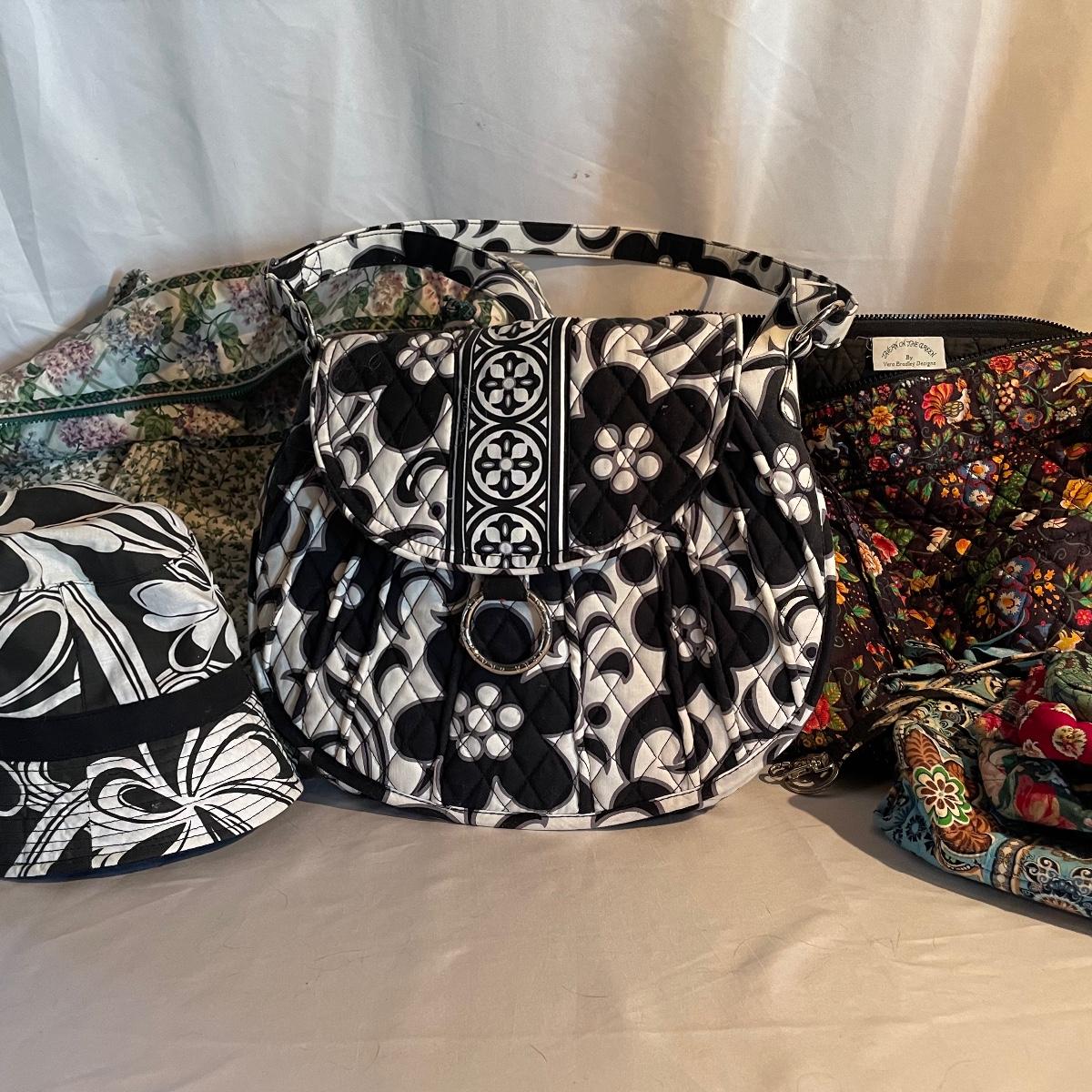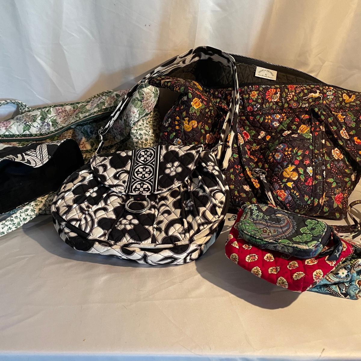 Two large totes, one shoulder bag, a hat, toiletry bag and a handful of smaller pouches make up this Vera Bradley lot. All items are in good condition.