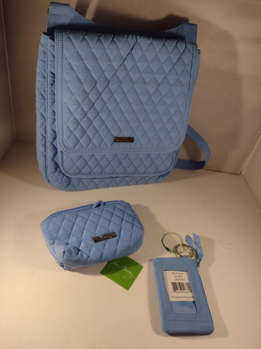 Vera Bradley Quilted Sky Blue Shoulder Bag with ID Case and Cosmetic Bag