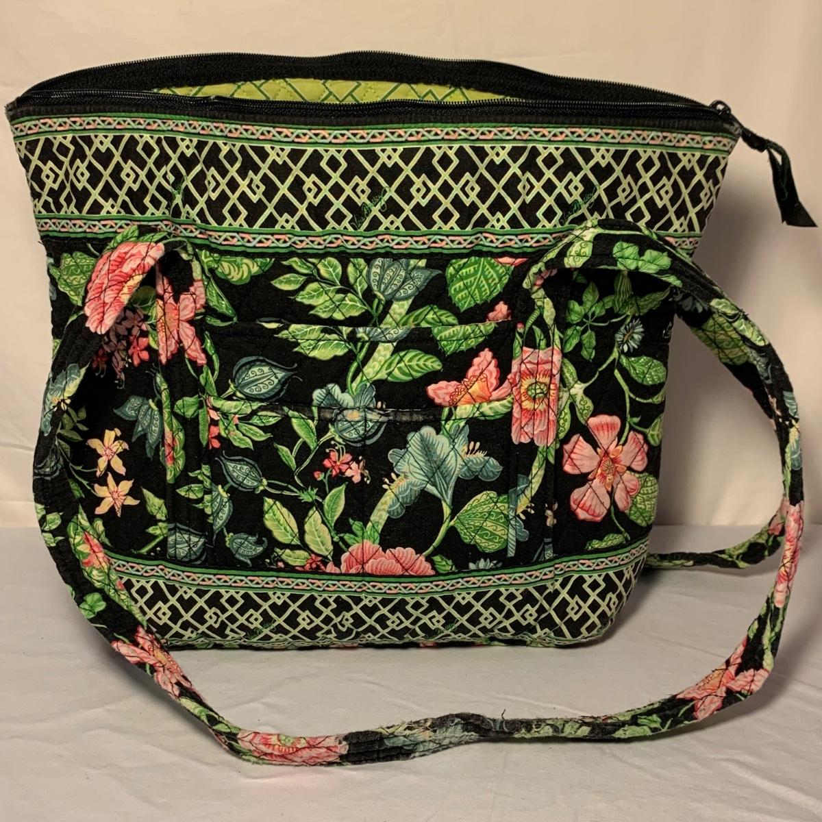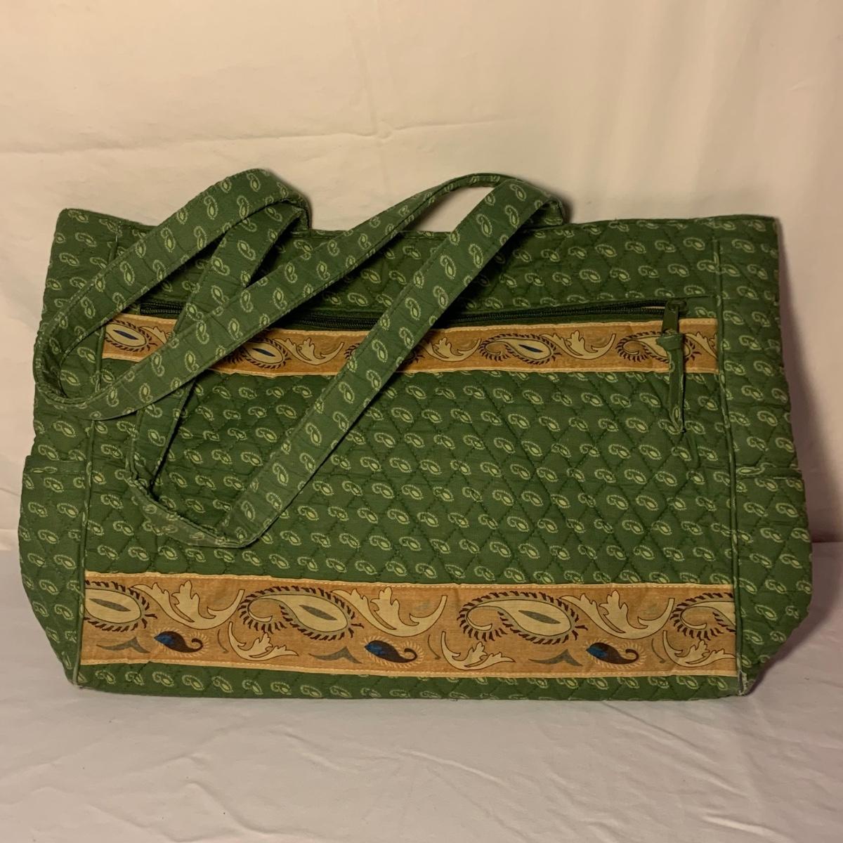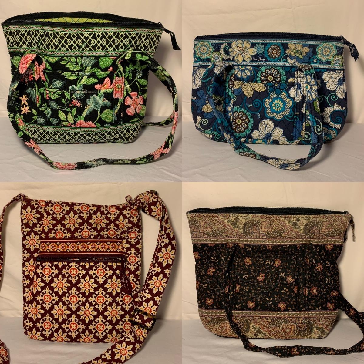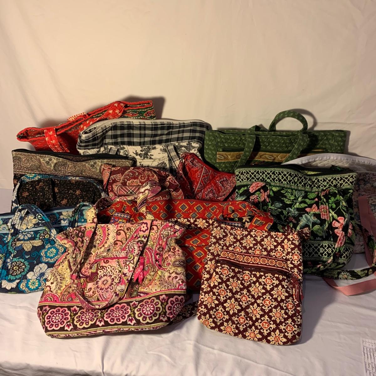 A collection of 12 bags including tote bags, hand bags, and a duffel bag. Eight of the bags are Vera Bradley. The largest item is the red bag with green paisley top border; it measures 18” x 5” x 17”H (not including the handle). Some wear; see photos.