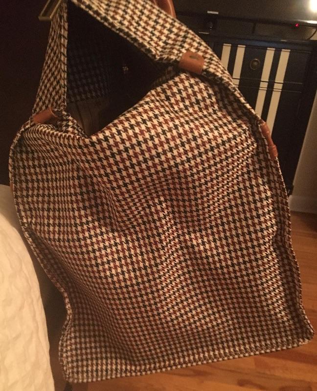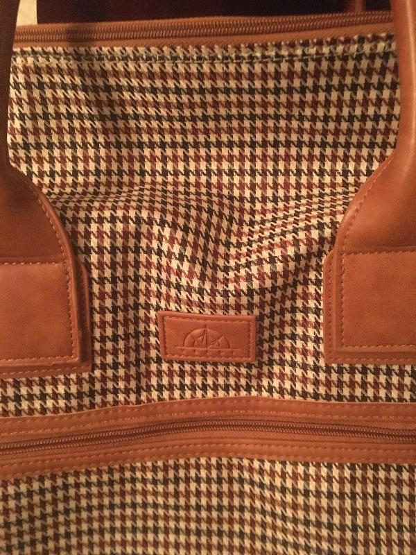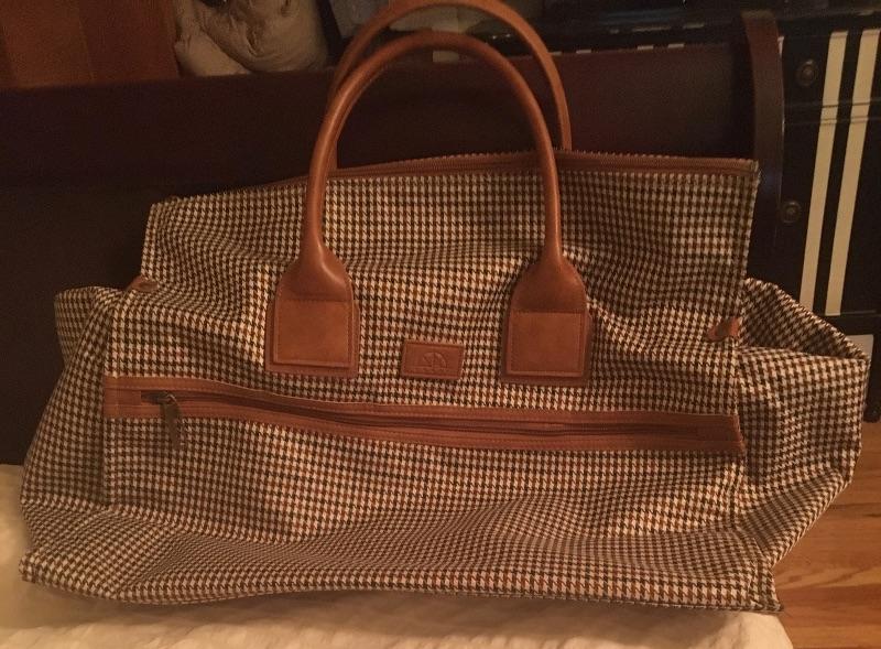 Classy large duffle bag. The fabric is a houndstooth pattern in brown/burgundy and cream.