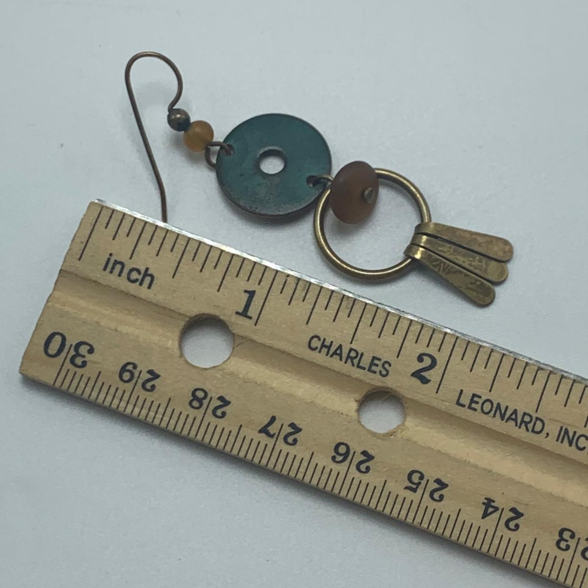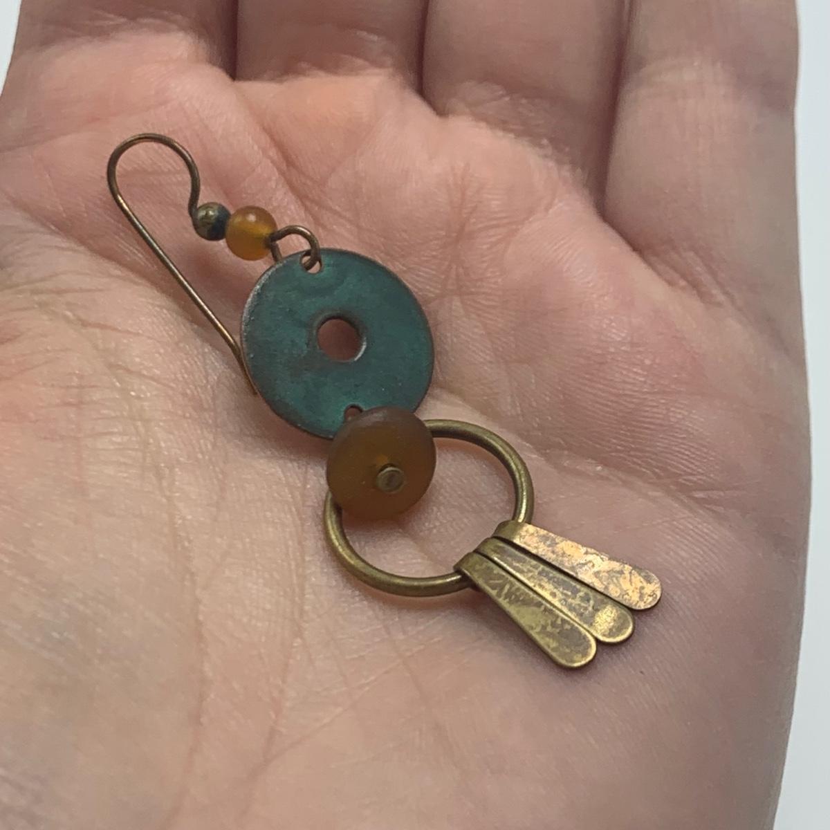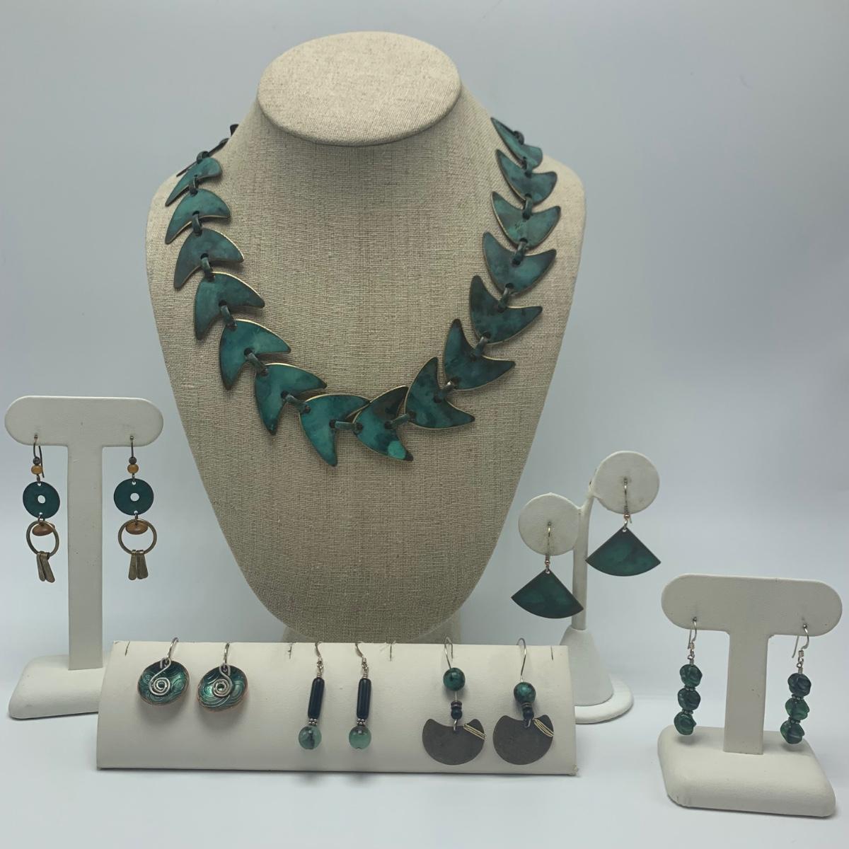 This collection of teal-themed jewelry includes a brass-like metal necklace with a verdigris color patina, as well as six pairs of dangly earrings for pierced ears. The earrings are comprised of mainly metal and stone elements. The necklace is 20“. All sales are final. No returns or refunds. Please bid accordingly.