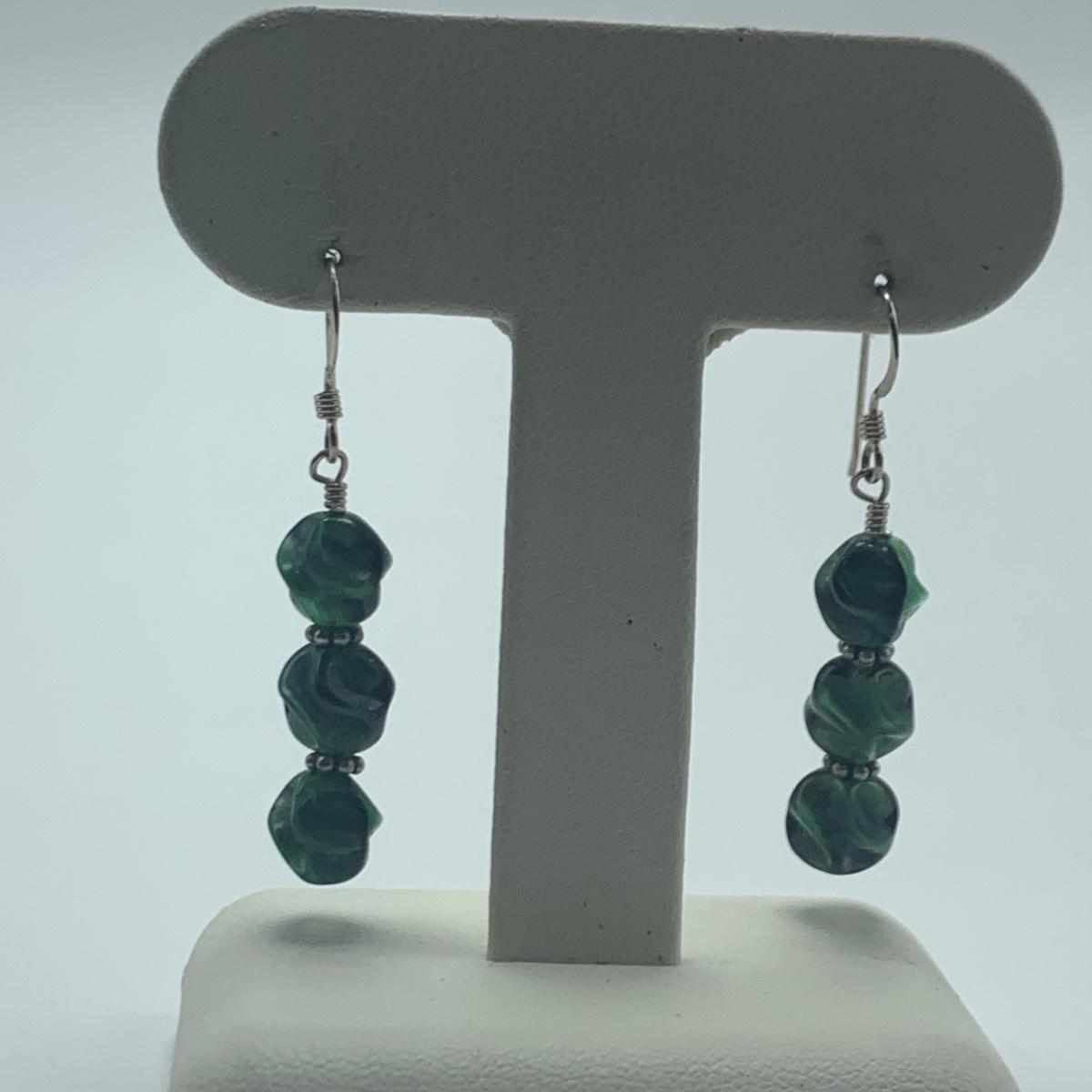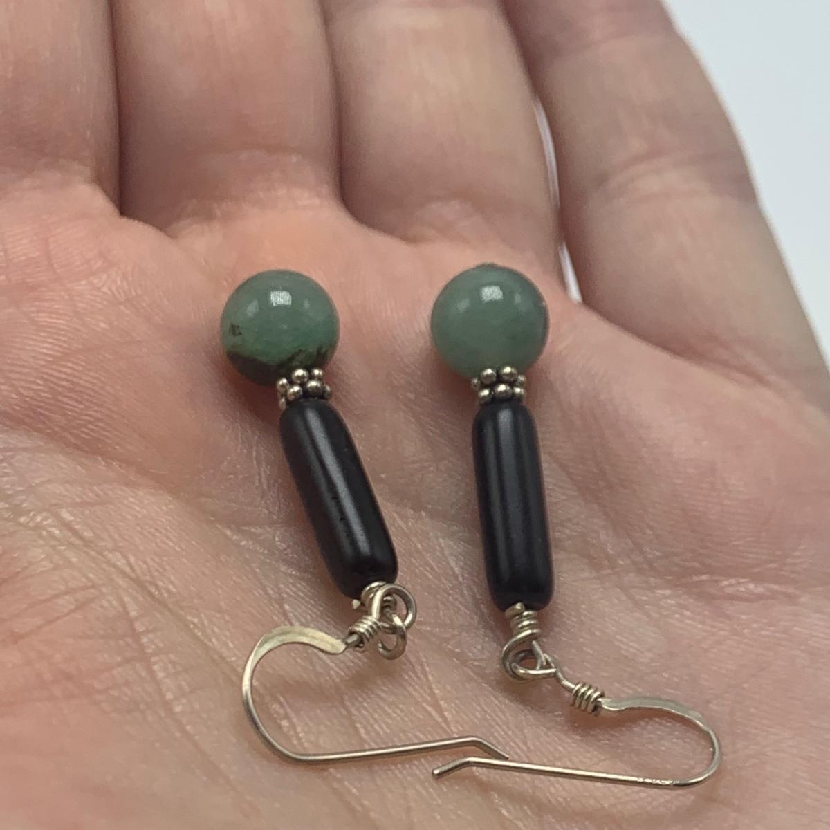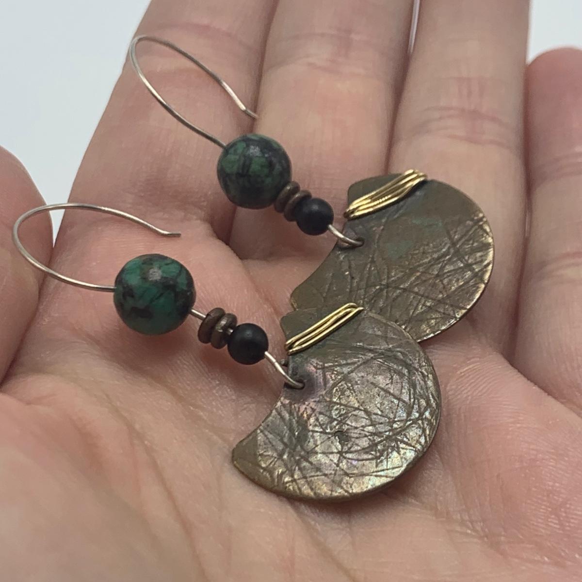 This collection of teal-themed jewelry includes a brass-like metal necklace with a verdigris color patina, as well as six pairs of dangly earrings for pierced ears. The earrings are comprised of mainly metal and stone elements. The necklace is 20“. All sales are final. No returns or refunds. Please bid accordingly.