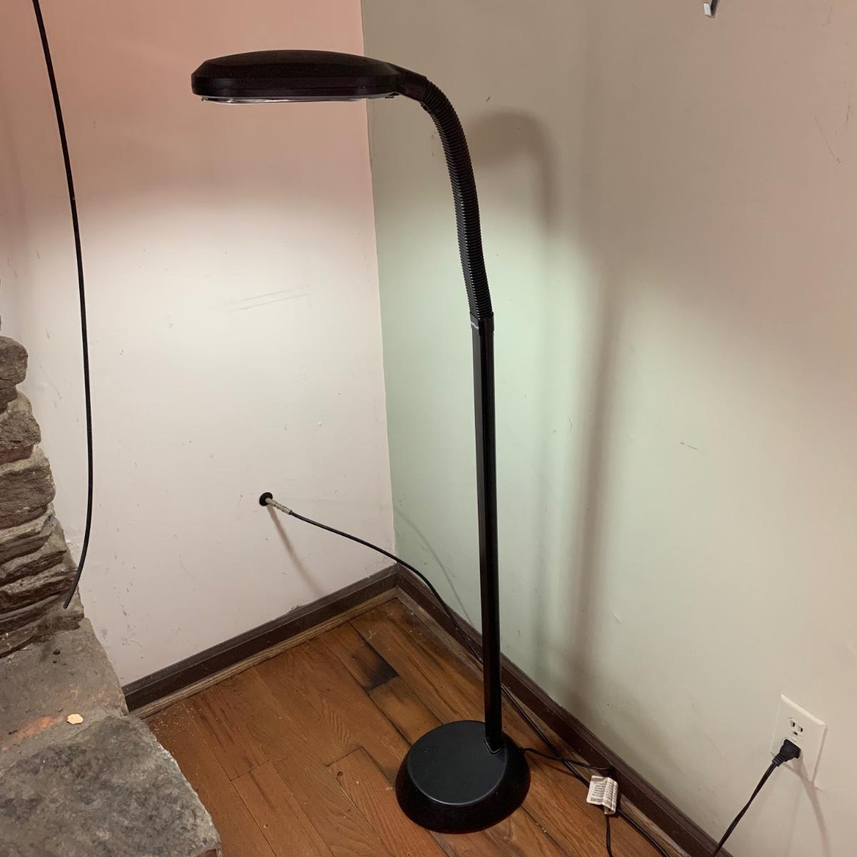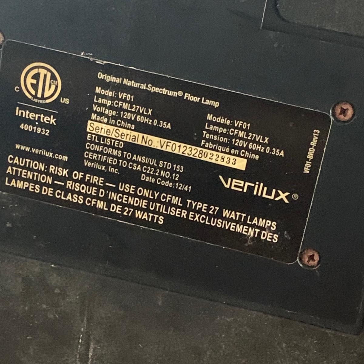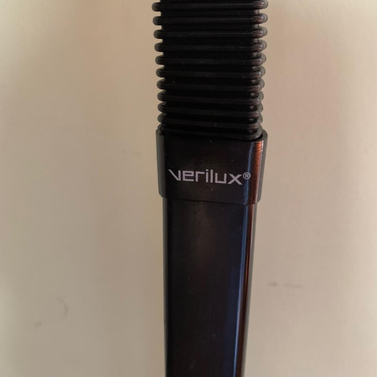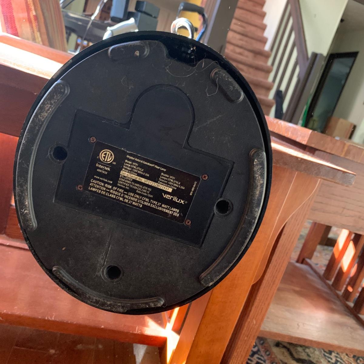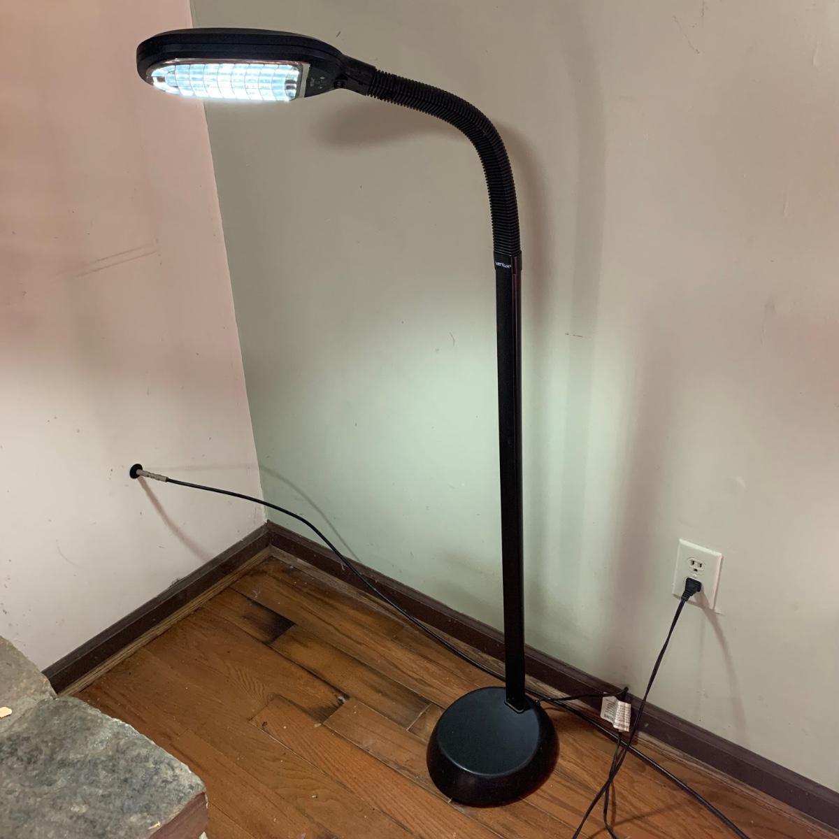 Black Verilux brand ‘Original Natural Spectrum’ floor lamp has an adjustable goose-neck. Lamp has two different strength settings and both worked when switch was pressed. At its tallest height with the neck bent, the lamp is 52”H. Base is approximately 9” x 10”. It is a bit dusty and could use a good wipe down.
