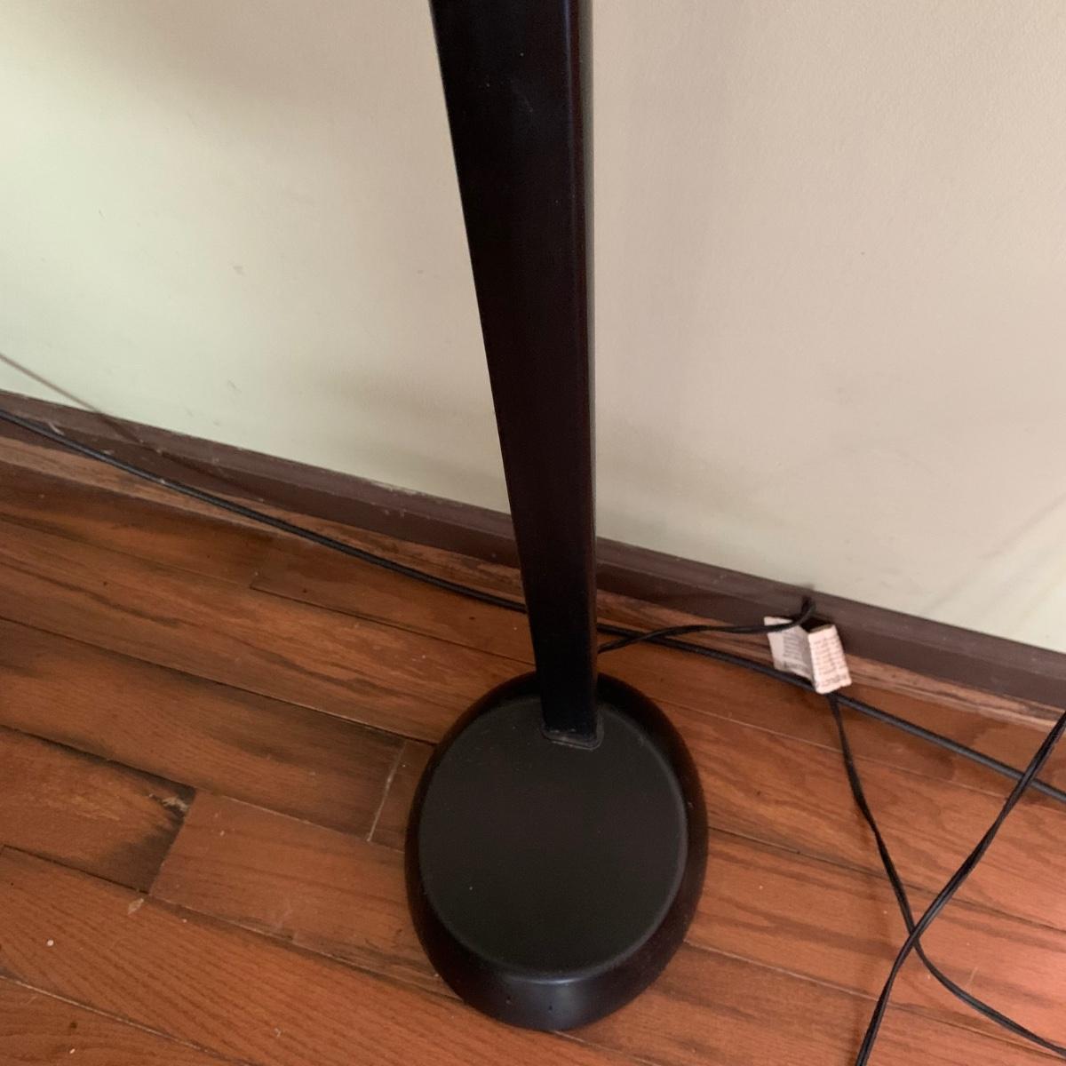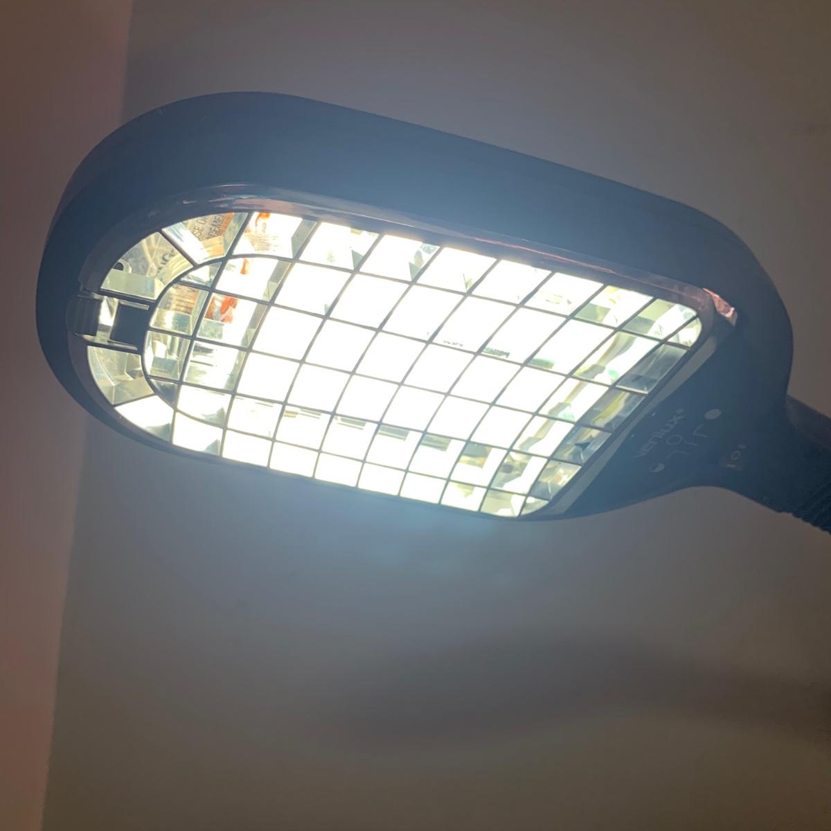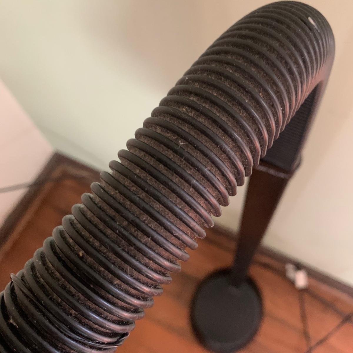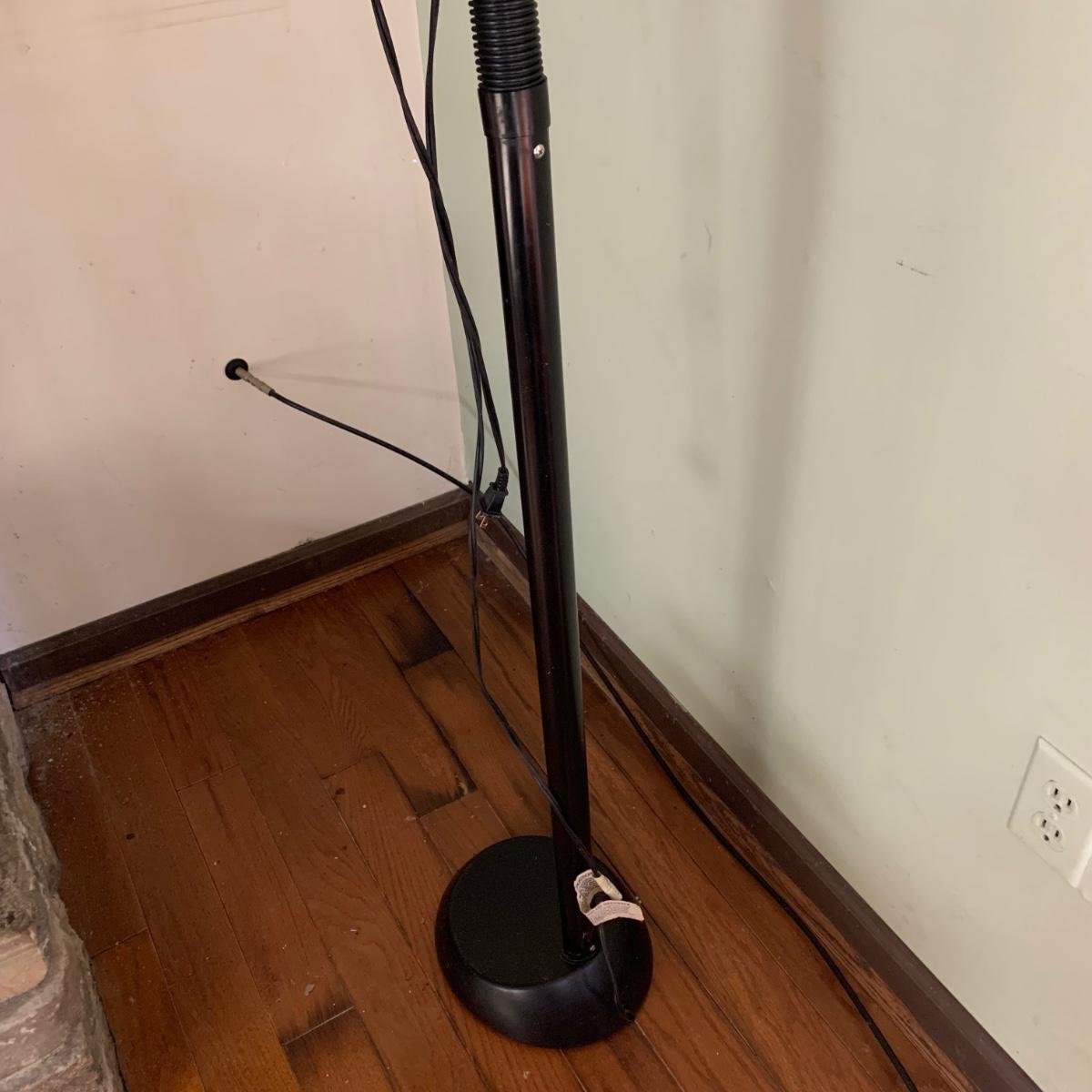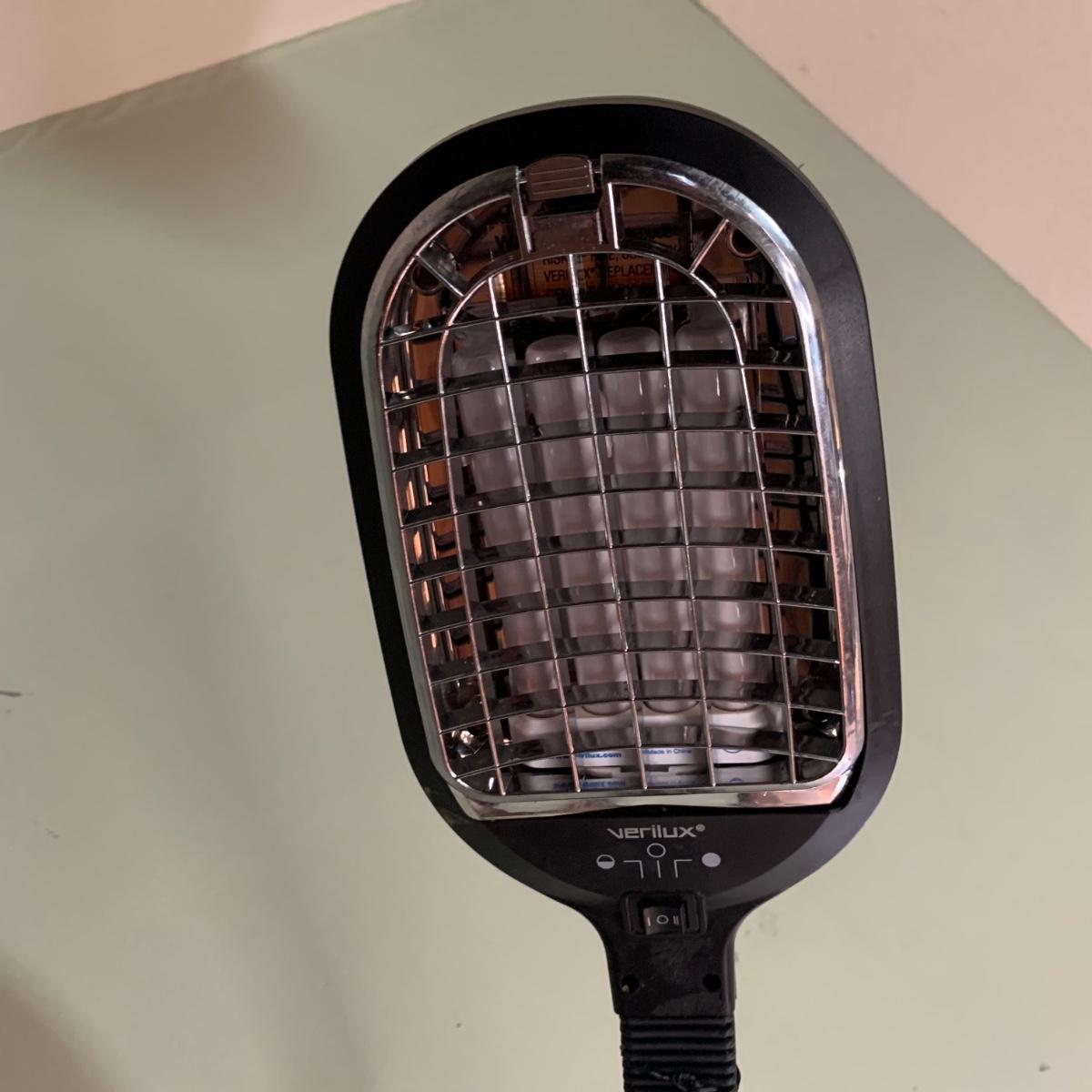 Black Verilux brand ‘Original Natural Spectrum’ floor lamp has an adjustable goose-neck. Lamp has two different strength settings and both worked when switch was pressed. At its tallest height with the neck bent, the lamp is 52”H. Base is approximately 9” x 10”. It is a bit dusty and could use a good wipe down.