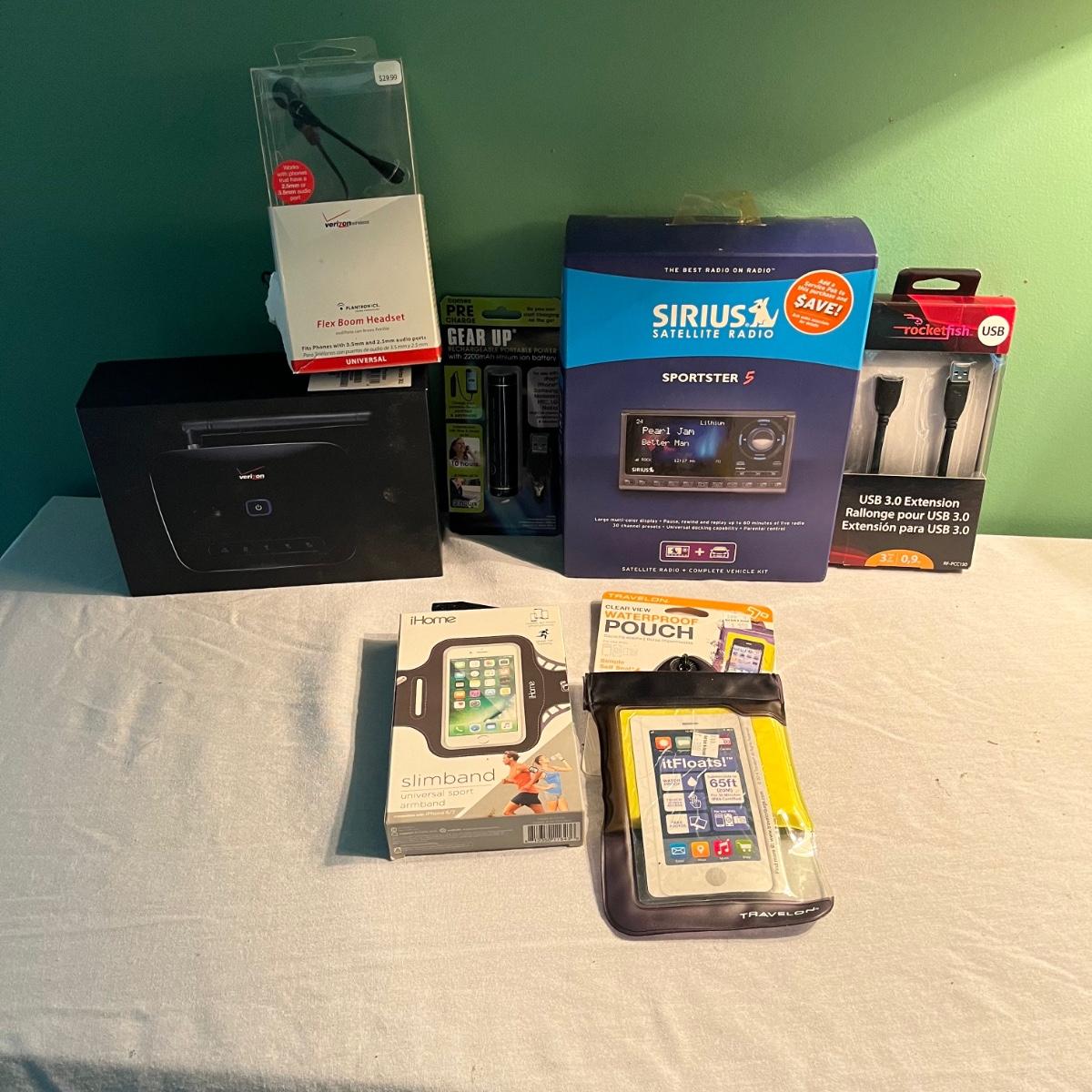 Lot includes a Verizon Home Telephone Connect base, Sirius Sportster 5, Verizon headset, Gear Up battery, IPhone holders and more.