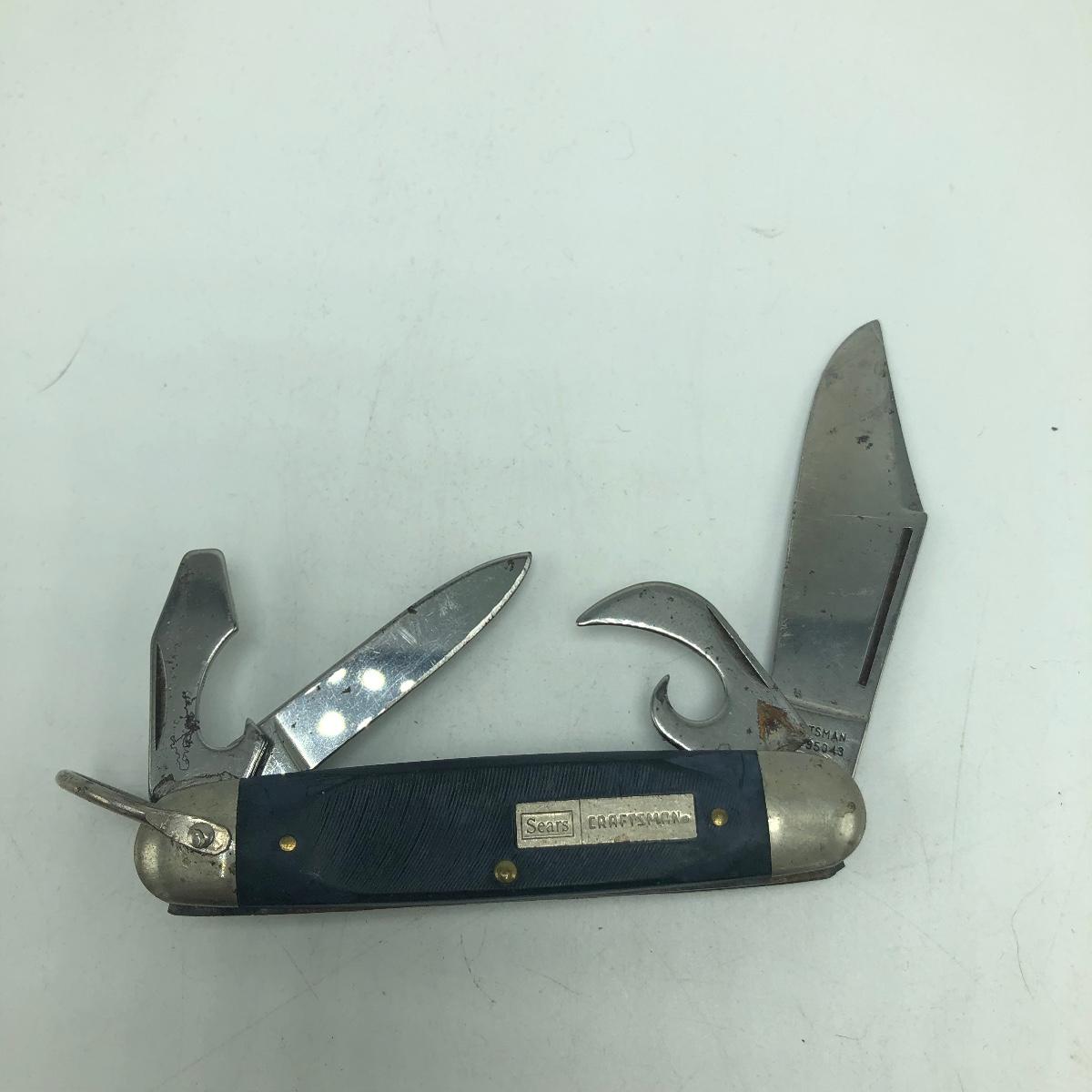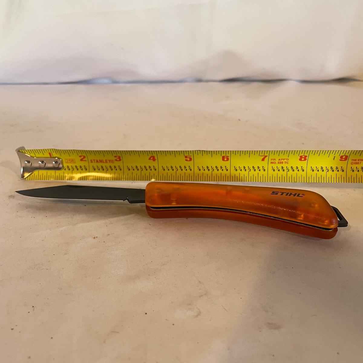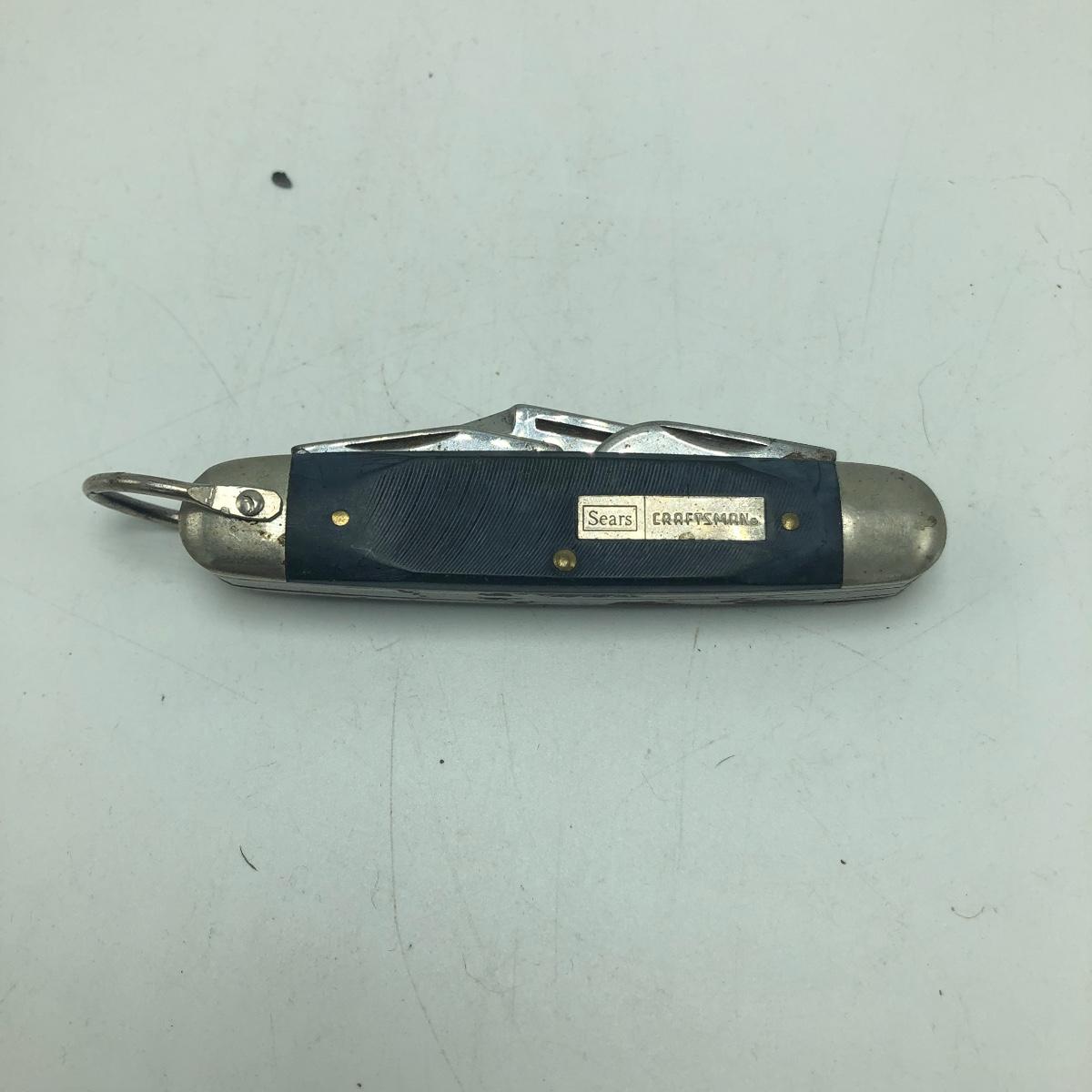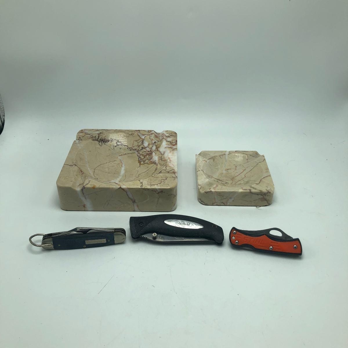Lot includes Marble ashtray marked Vermont Marble Company and a larger matching ashtray with no markings, Sheffield pocketknife, Sears Craftsman vintage pocketknife and a Stihl pocketknife. Largest ashtray measures 6” x 6” x 1.5”.