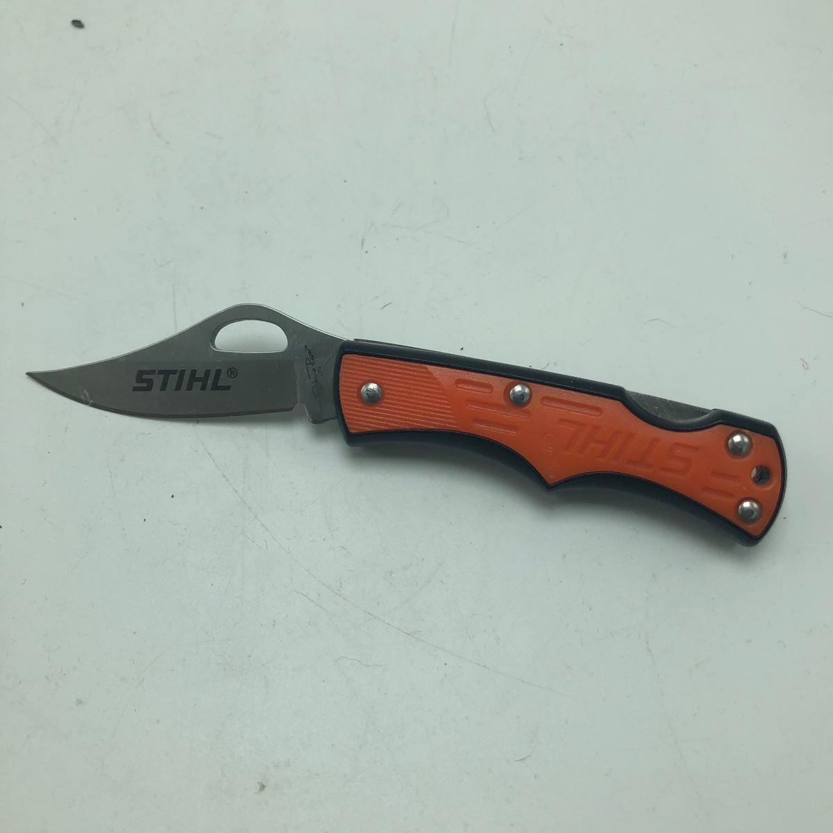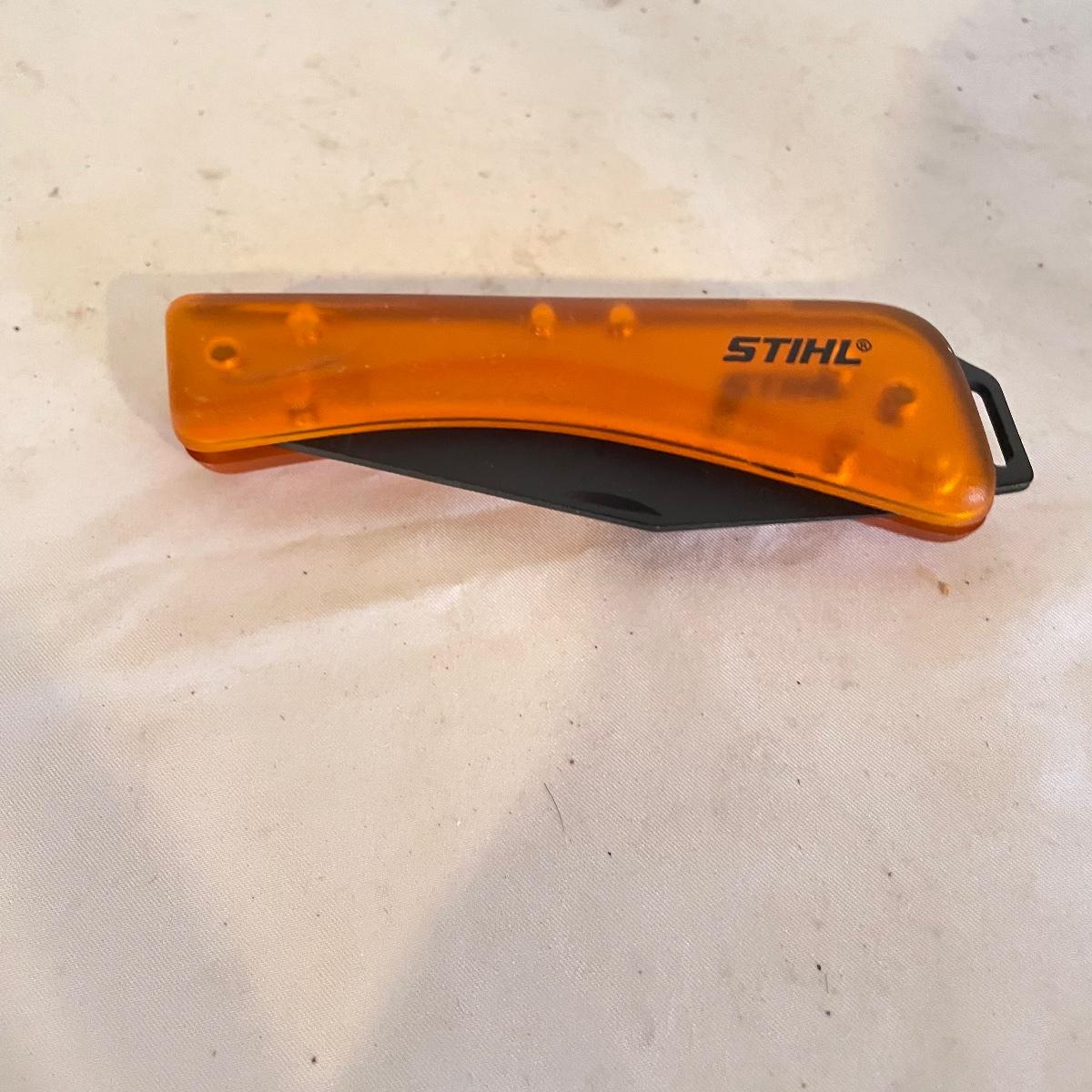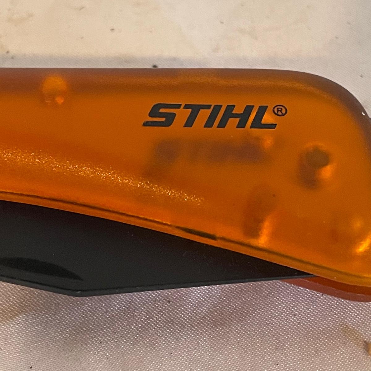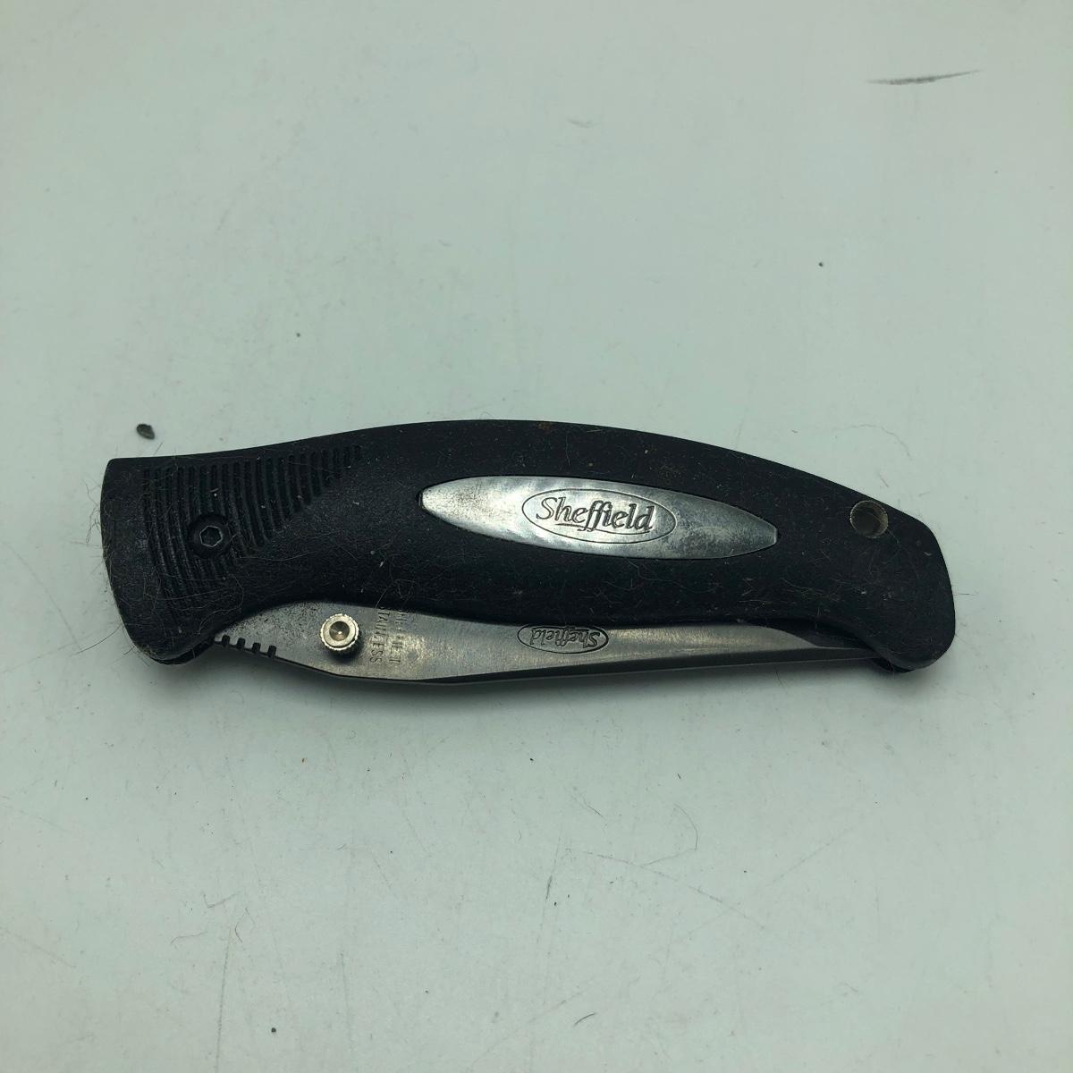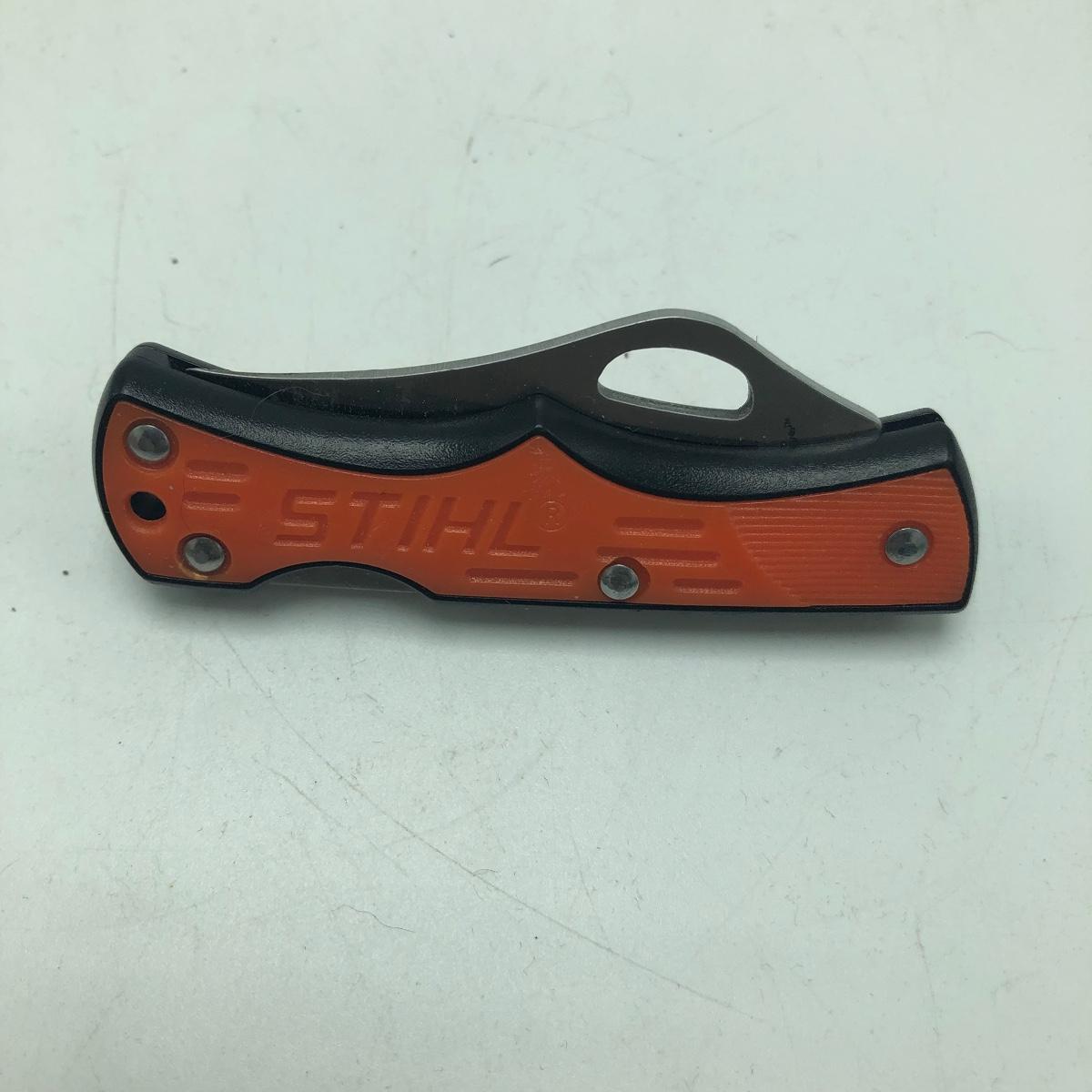 Lot includes Marble ashtray marked Vermont Marble Company and a larger matching ashtray with no markings, Sheffield pocketknife, Sears Craftsman vintage pocketknife and a Stihl pocketknife. Largest ashtray measures 6” x 6” x 1.5”.
