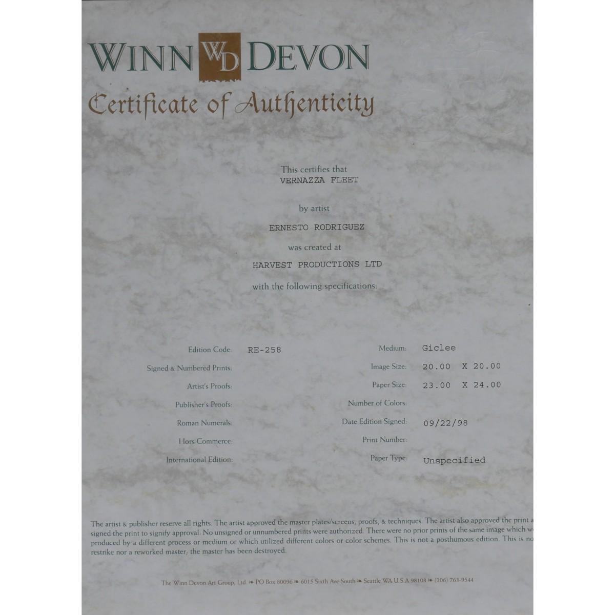 "Vernazza Fleet" by Ernesto Rodriguez limited edition giclee, numbered 261/275. Signed in pencil by artist. Dated 1998. Certificate of authenticity is included. Art measures L 11" x H 11". Frame measures L 19.5" H 20.25" x D 1". Weight is 5 lb 10 oz. (A54)