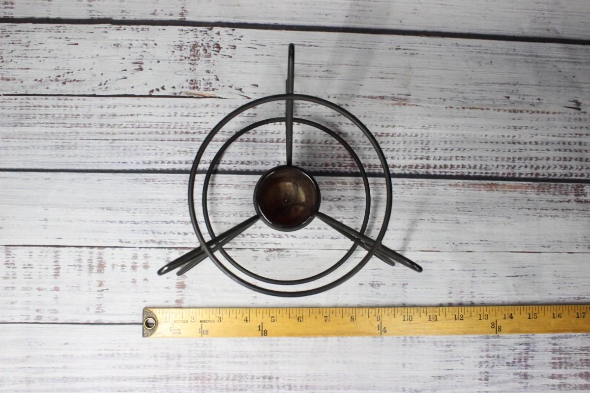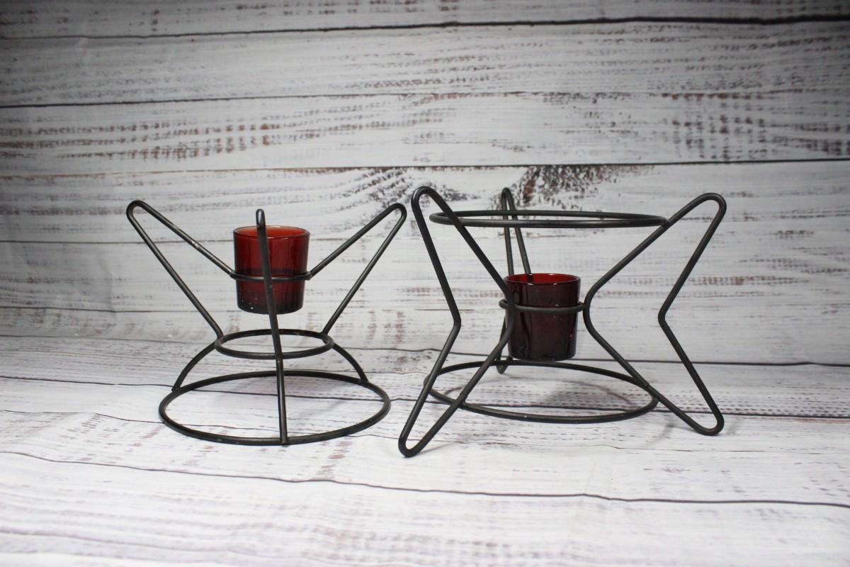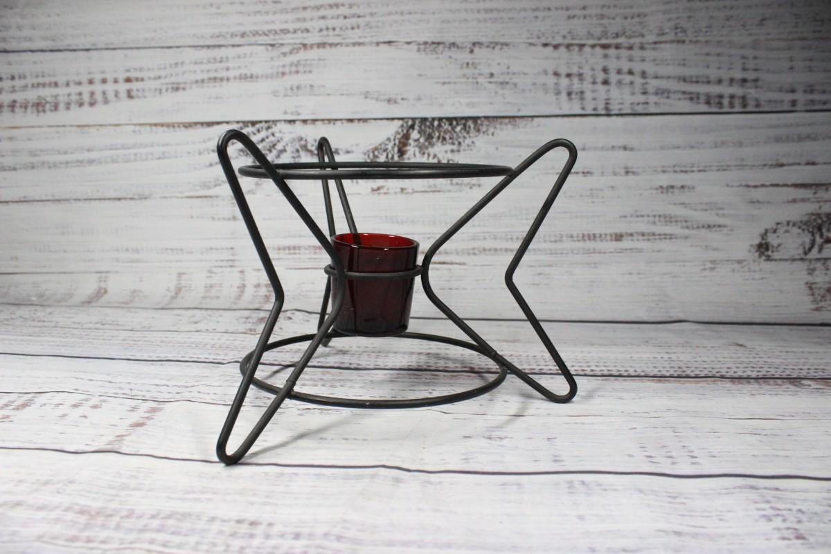 Antique set of Vernon Kilns Vernonware Metlox metal stand coffee server/stand with original dark red glass candle warmer. There is some light use of the candle warmers, but the metal stands are in good condition.