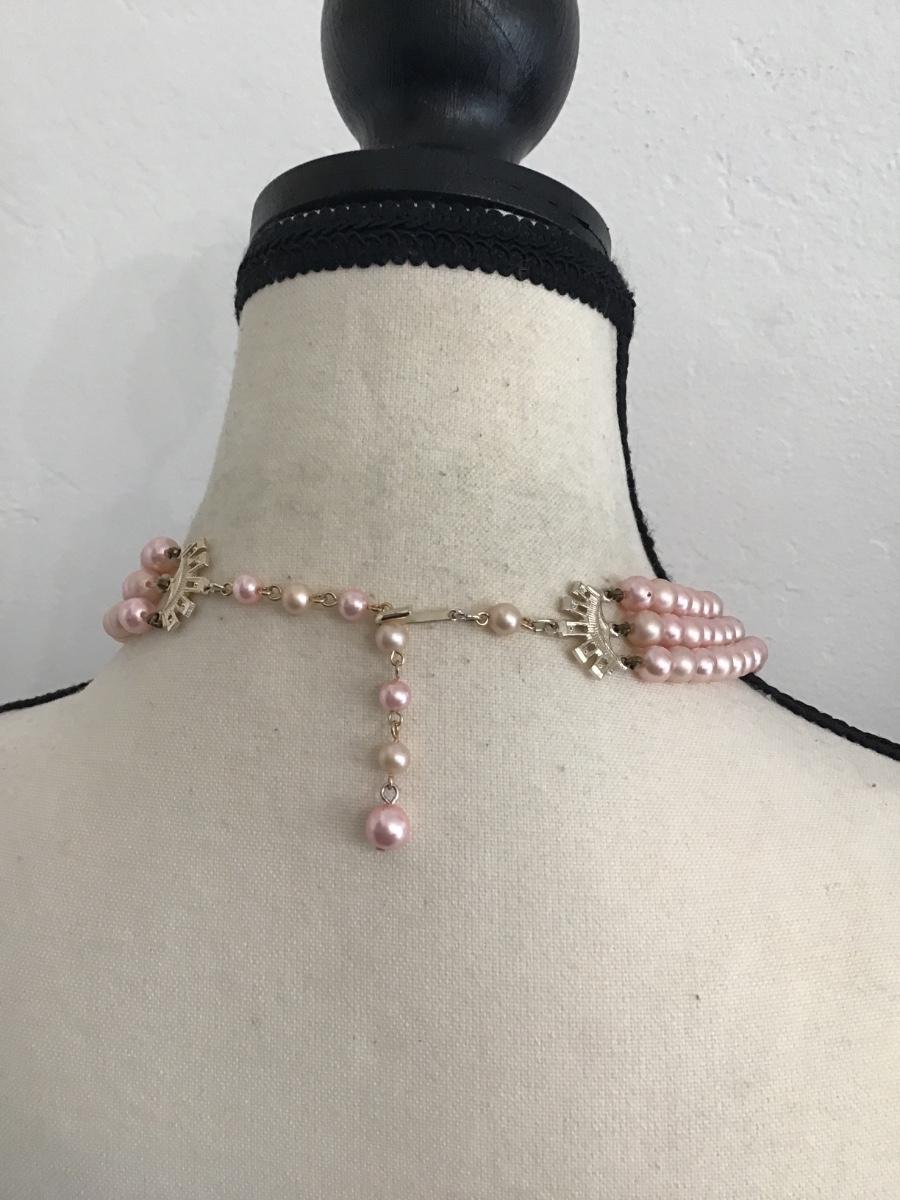 Very beautiful, vintage, multi strand beaded necklace with pink pearlescent beads and aurora borealis crystals. Please see attached photos.