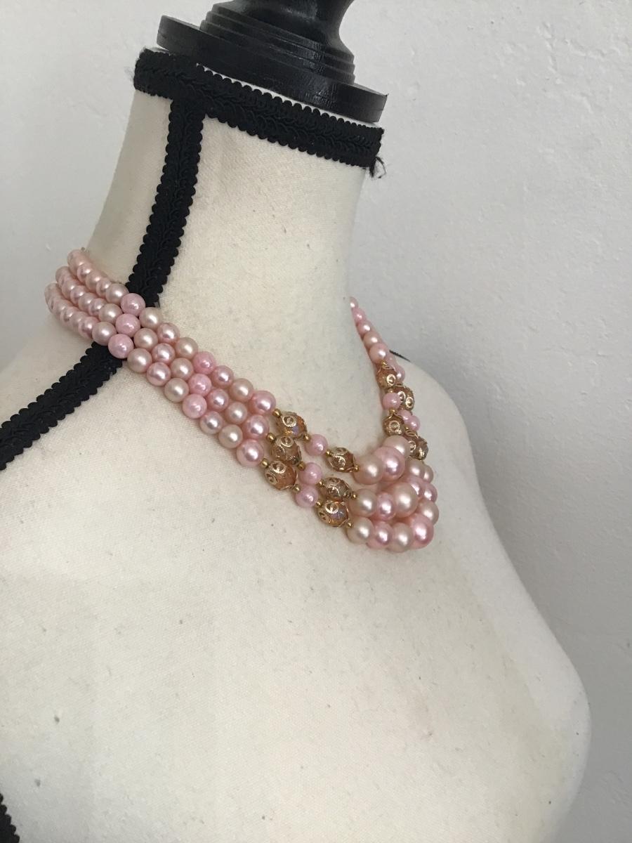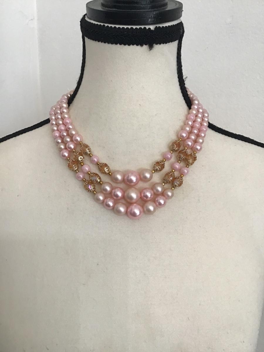 Very beautiful vintage multi strand beaded necklace with a pink pearlescent beads and aurora borealis crystals