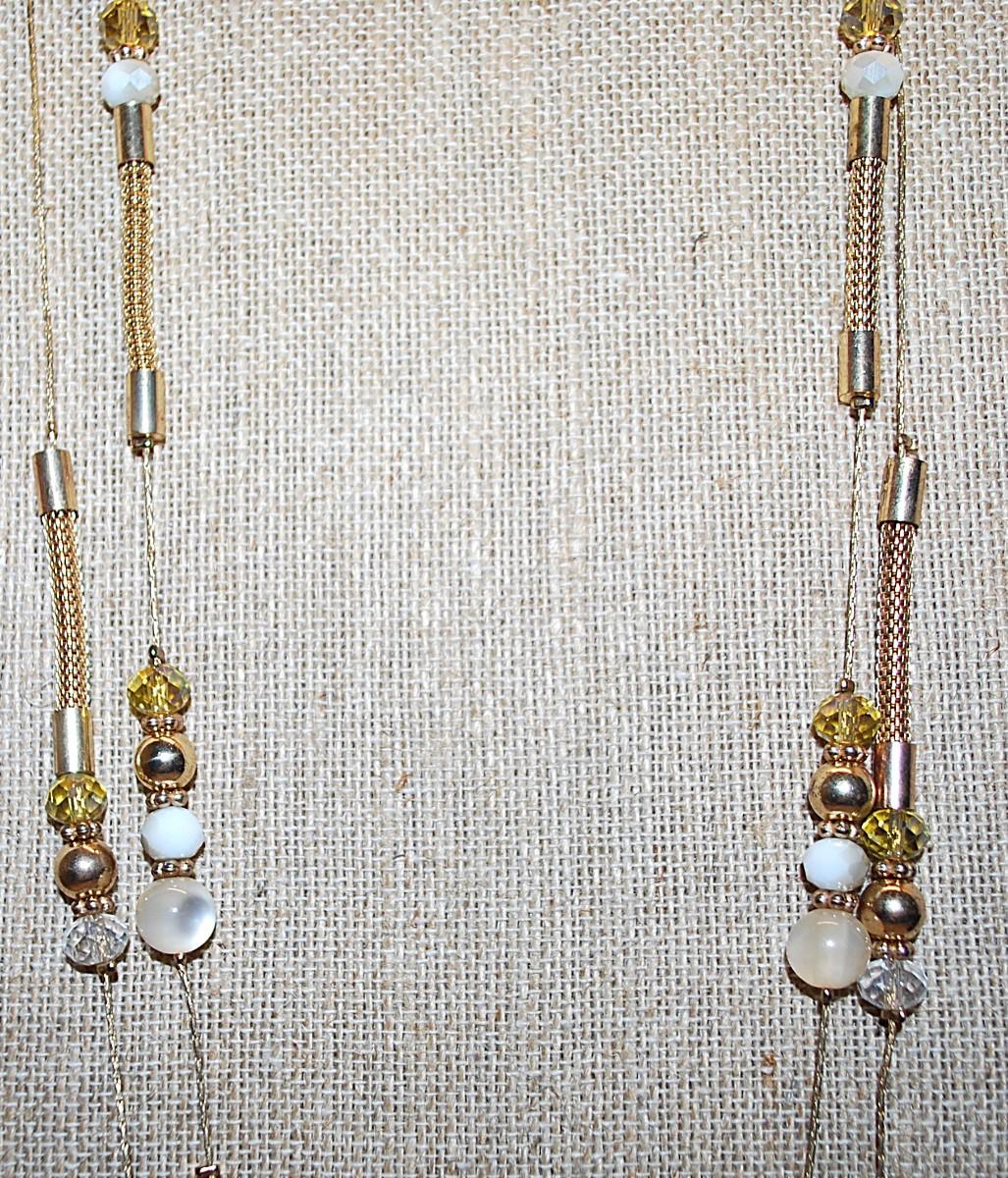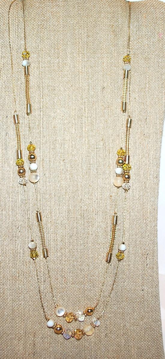 Very Cool Double Strands Gold Tone NECKLACE with Gold, Clear & Taupe Beads and Rope Style Capped Accents with Lobster Clasp