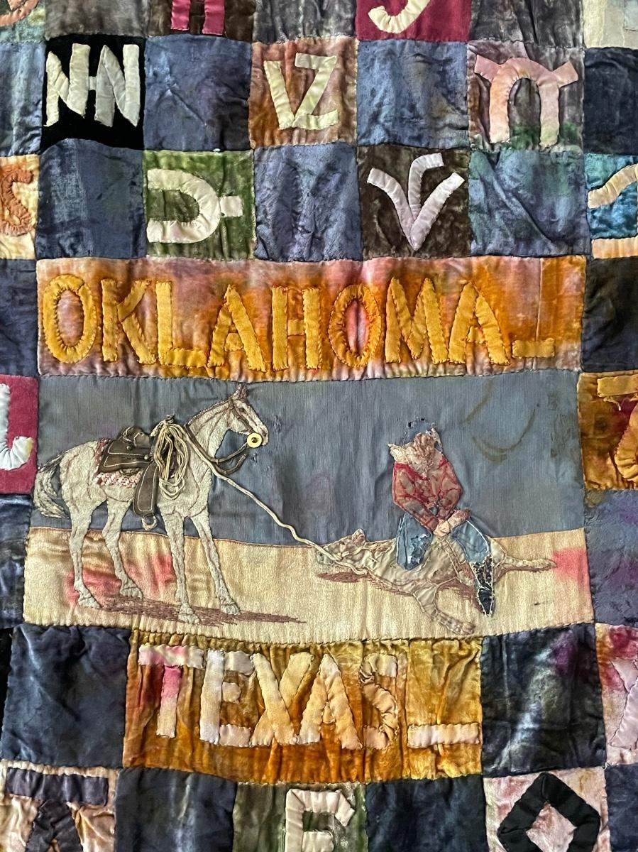 Velvet pieces with embroidered brands of Oklahoma and Texas - center is 3D where the artist used leather -