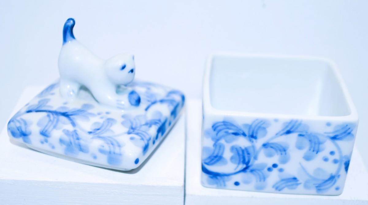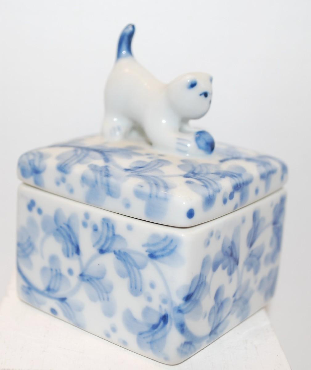 Very Cute "Kitten and Ball" Blue & White Trinket Box 2" x 2" x 3" H