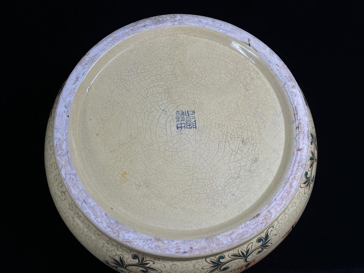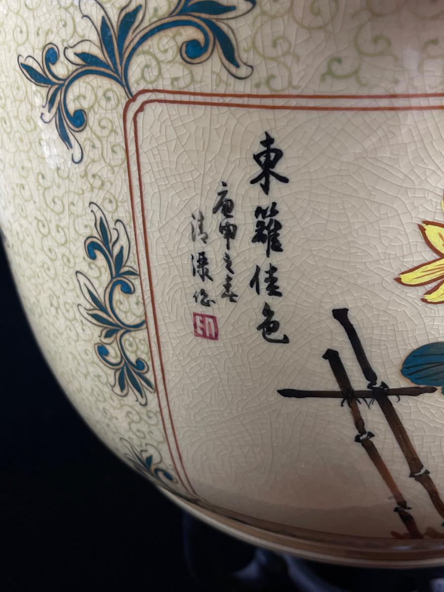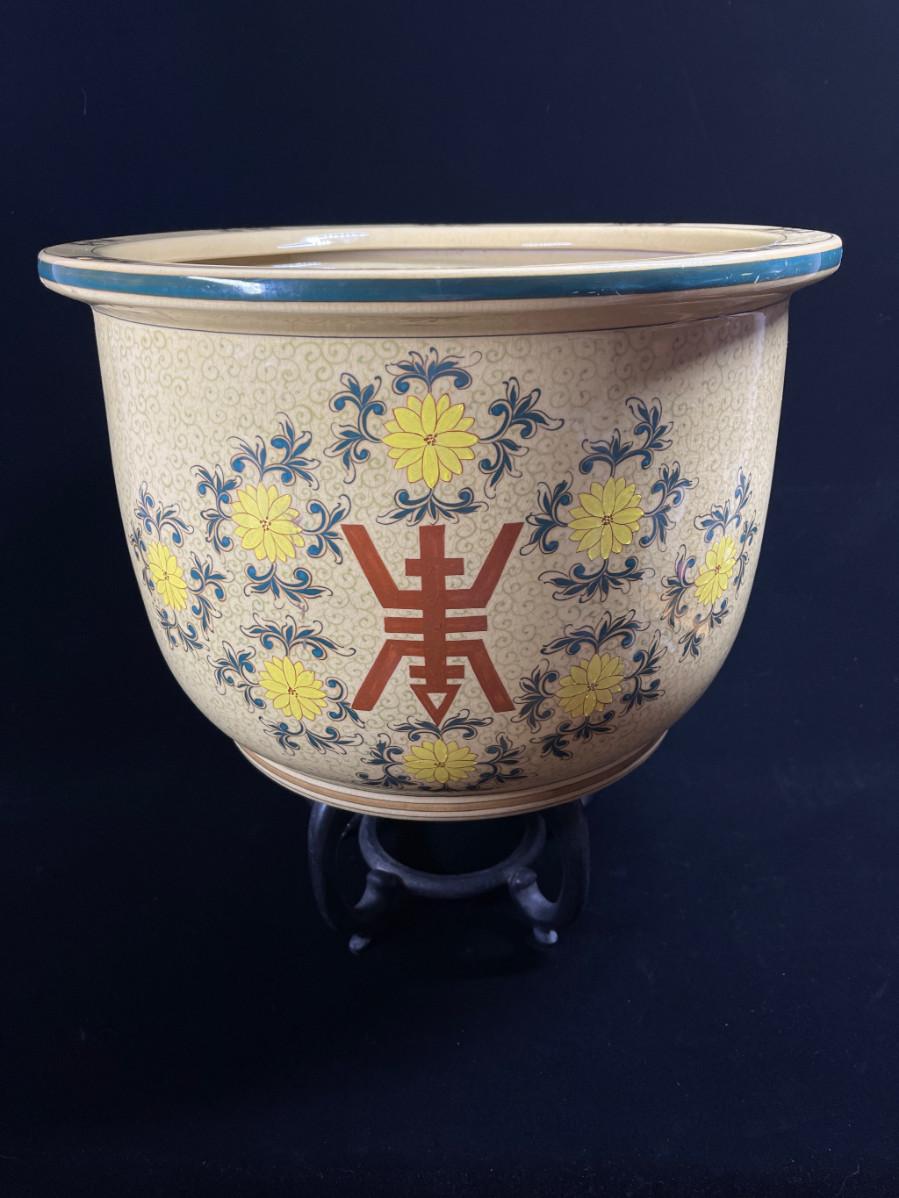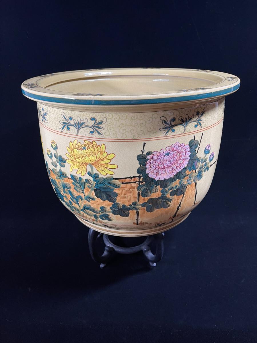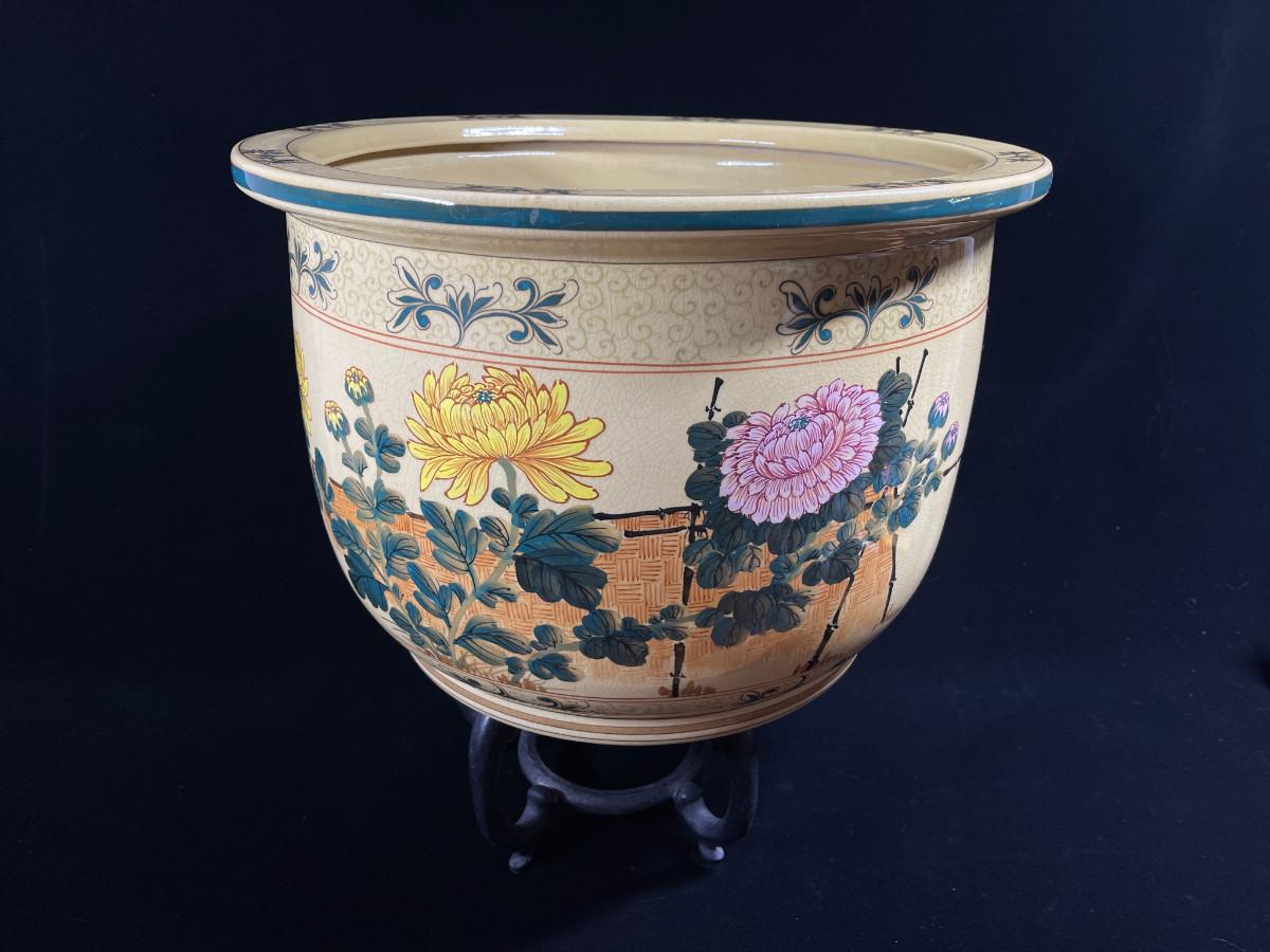 DESCRIPTION: The exterior wall of this large Chinese fish bowl has been hand painted with an arrangement of yellow flowers in full bloom over a finely scrolled background, with an auspicious Chinese calligraphic symbol centering the arrangement. The other side is decorated with large chrysanthemum blossoms planted in a garden setting with vertical lines of poetic script. The interior of the bowl is detailed with colorful koi fish swimming through and hiding under water vegetation. There is a network of craquelure to the bottom glaze, and is all the more beautiful and interesting for it! The reign chop mark should be considered spurious. Stand included. Very good condition. See photos.