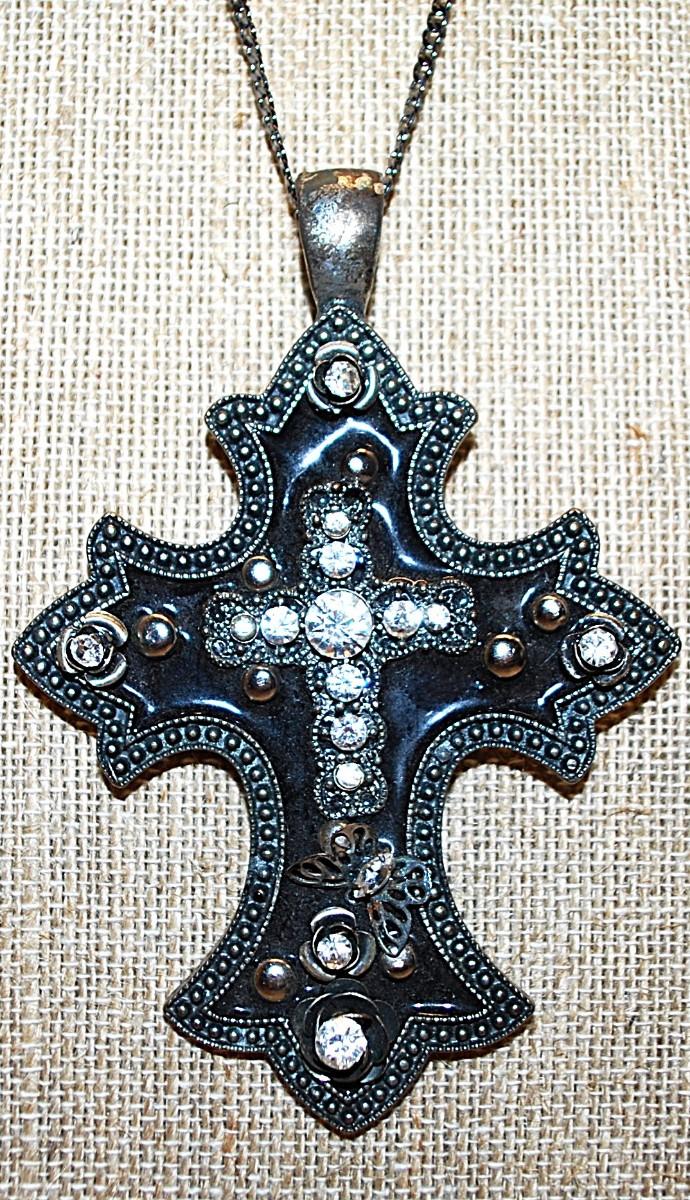 Very Large BLACK Bejeweled CROSS/PENDANT (4" x 2¾") with SNAP HOLDER on a Silver Tone Necklace Chain 17" L