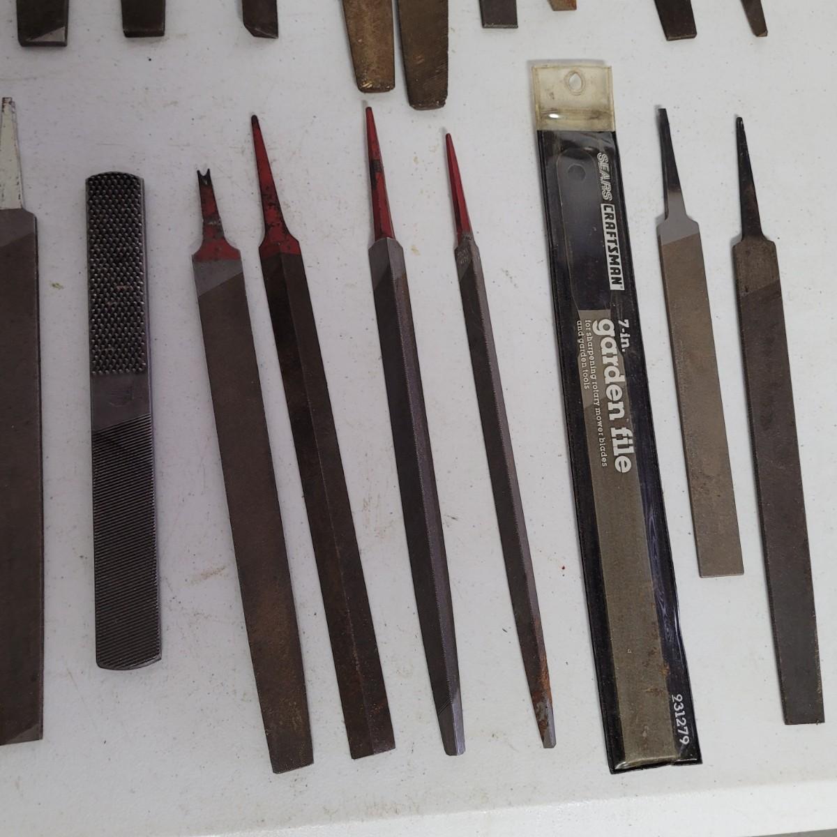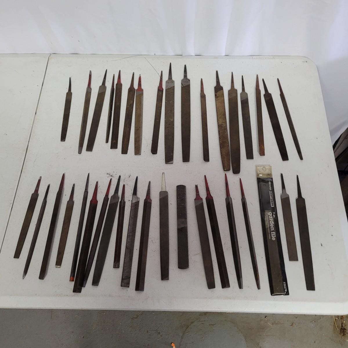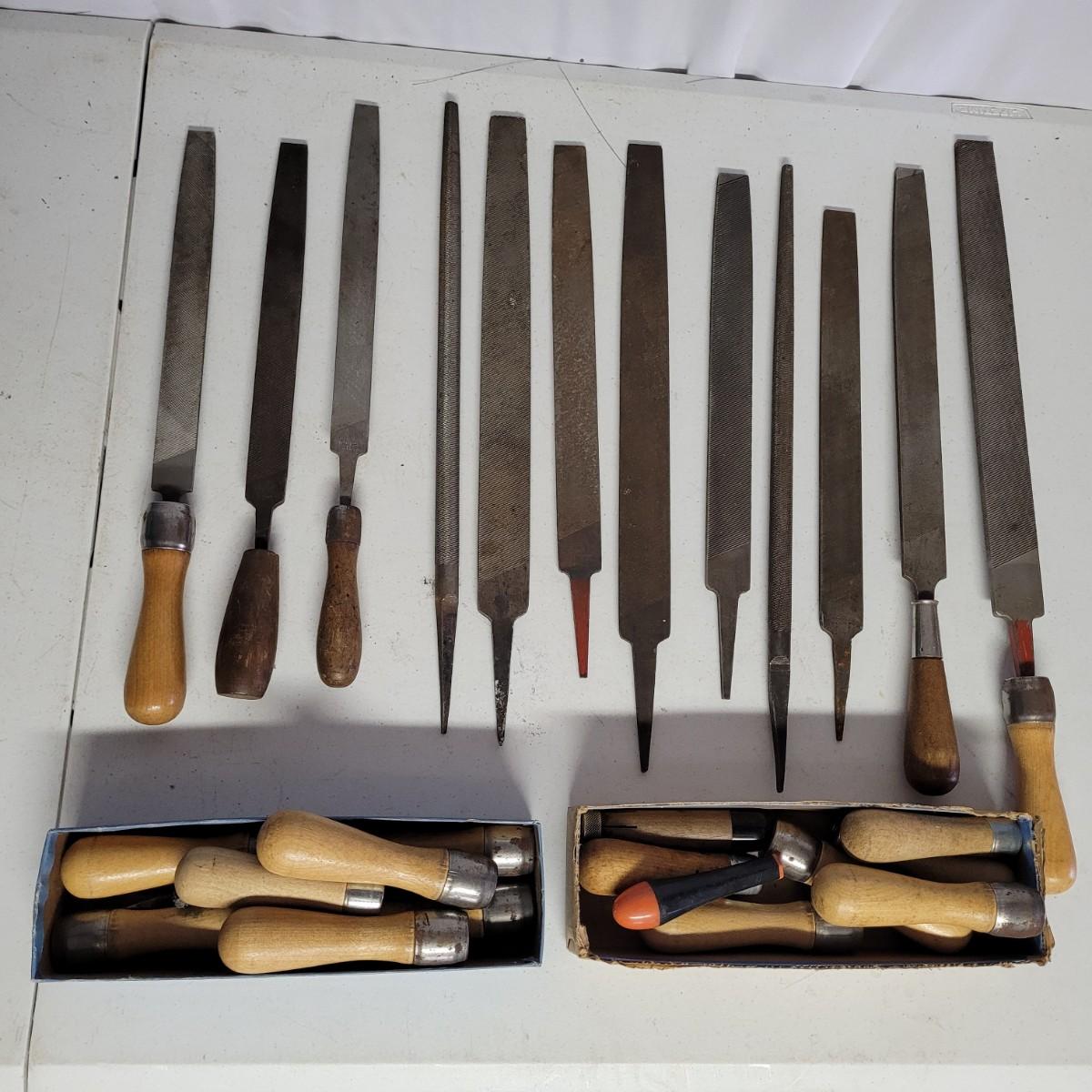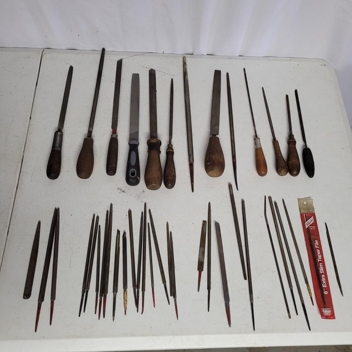 This lot includes a very large assortment of files. Also included are many wood handles for swapping and customizing. Files range in length and style from 21" in length, all the way down to 7" in length. There are about 15 handles, and about 90 files! Also included is a carrying tray and 5 gallon bucket.