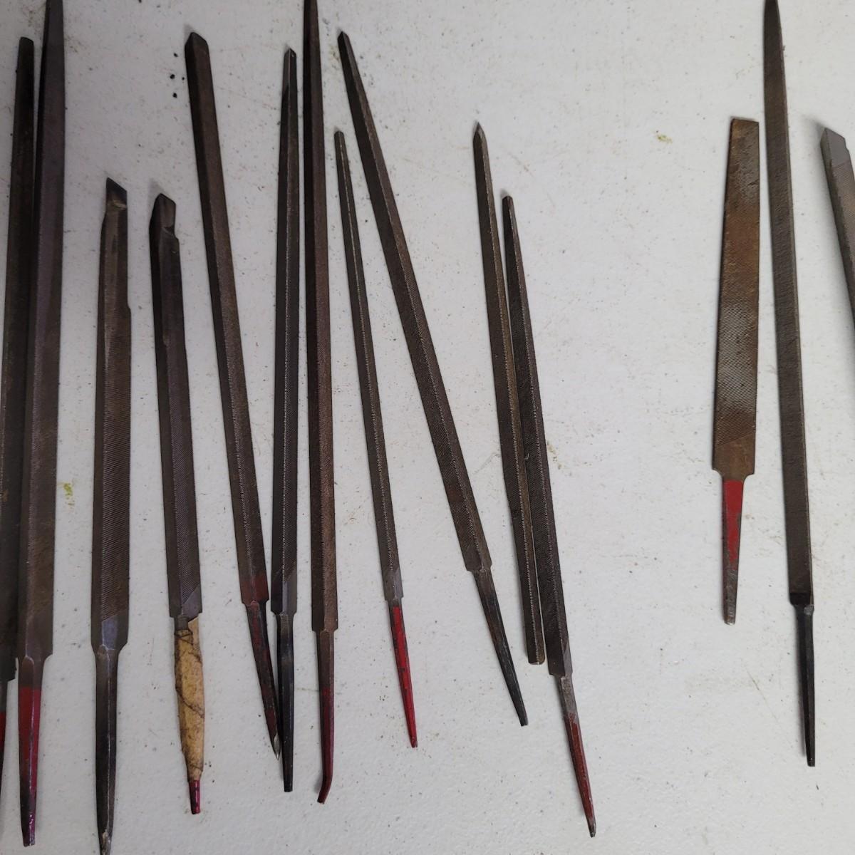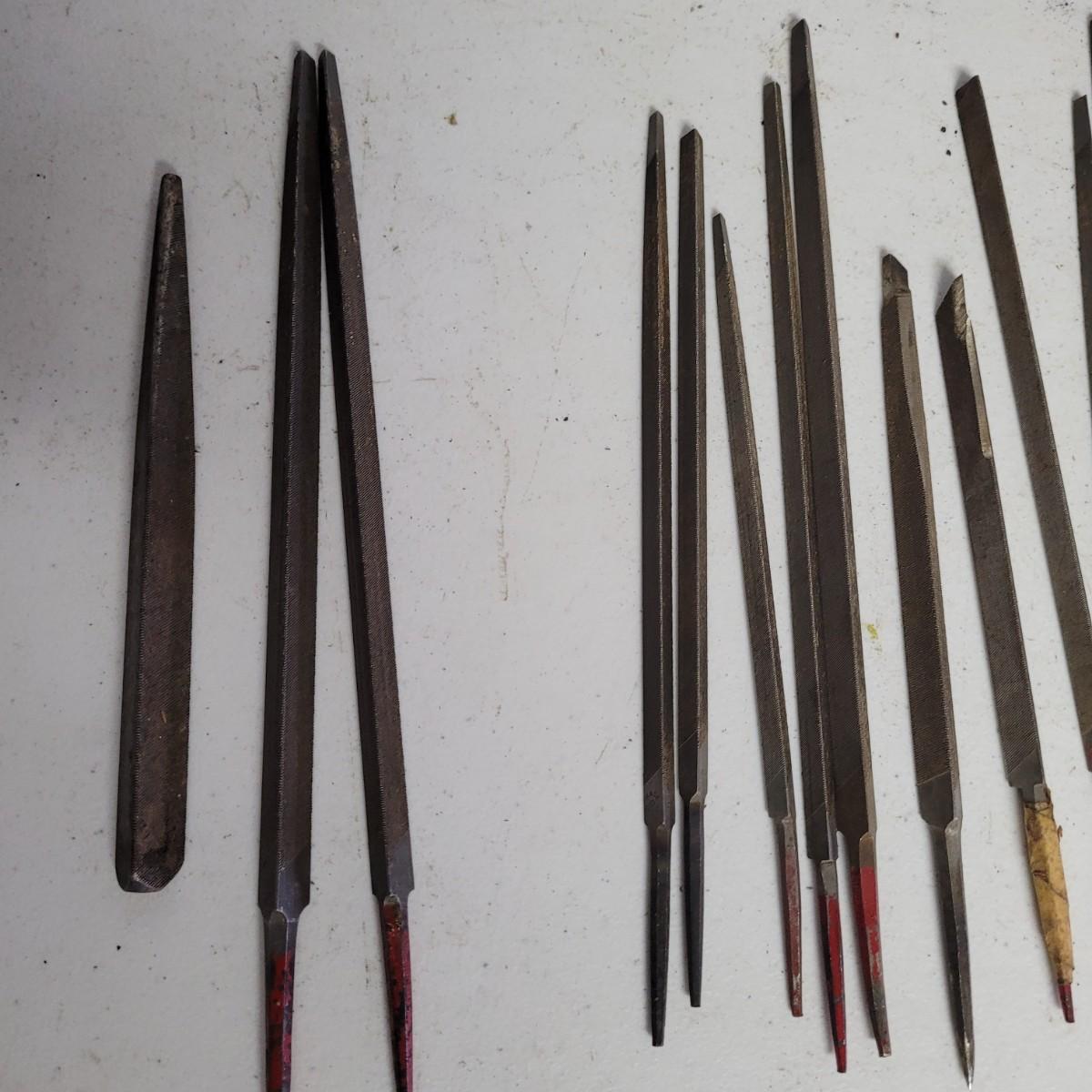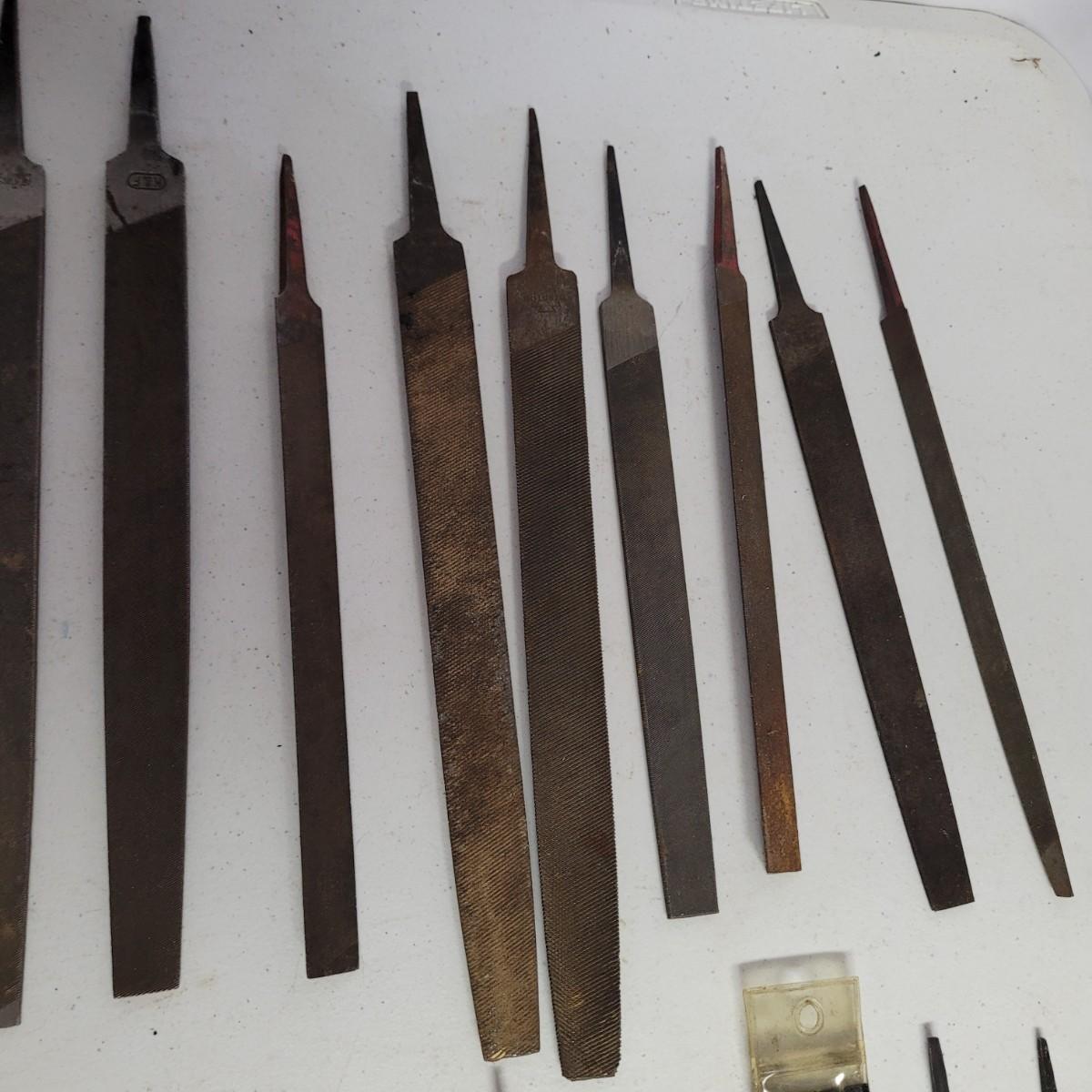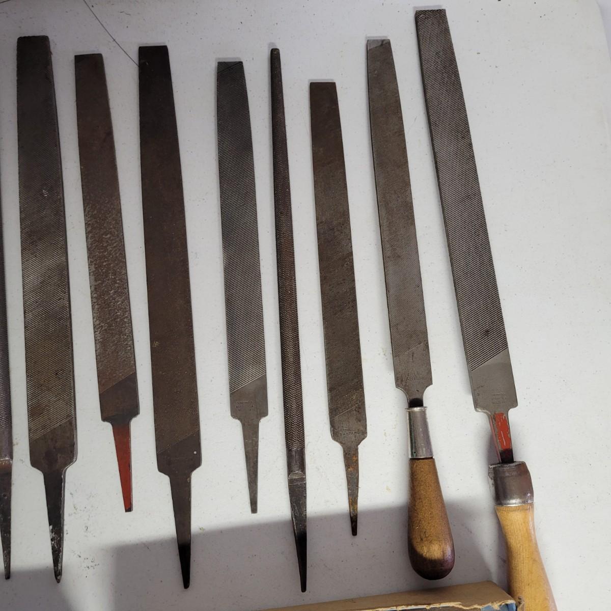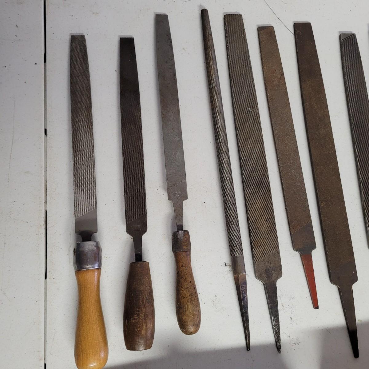 This lot includes a very large assortment of files. Also included are many wood handles for swapping and customizing. Files range in length and style from 21" in length, all the way down to 7" in length. There are about 15 handles, and about 90 files! Also included is a carrying tray and 5 gallon bucket.