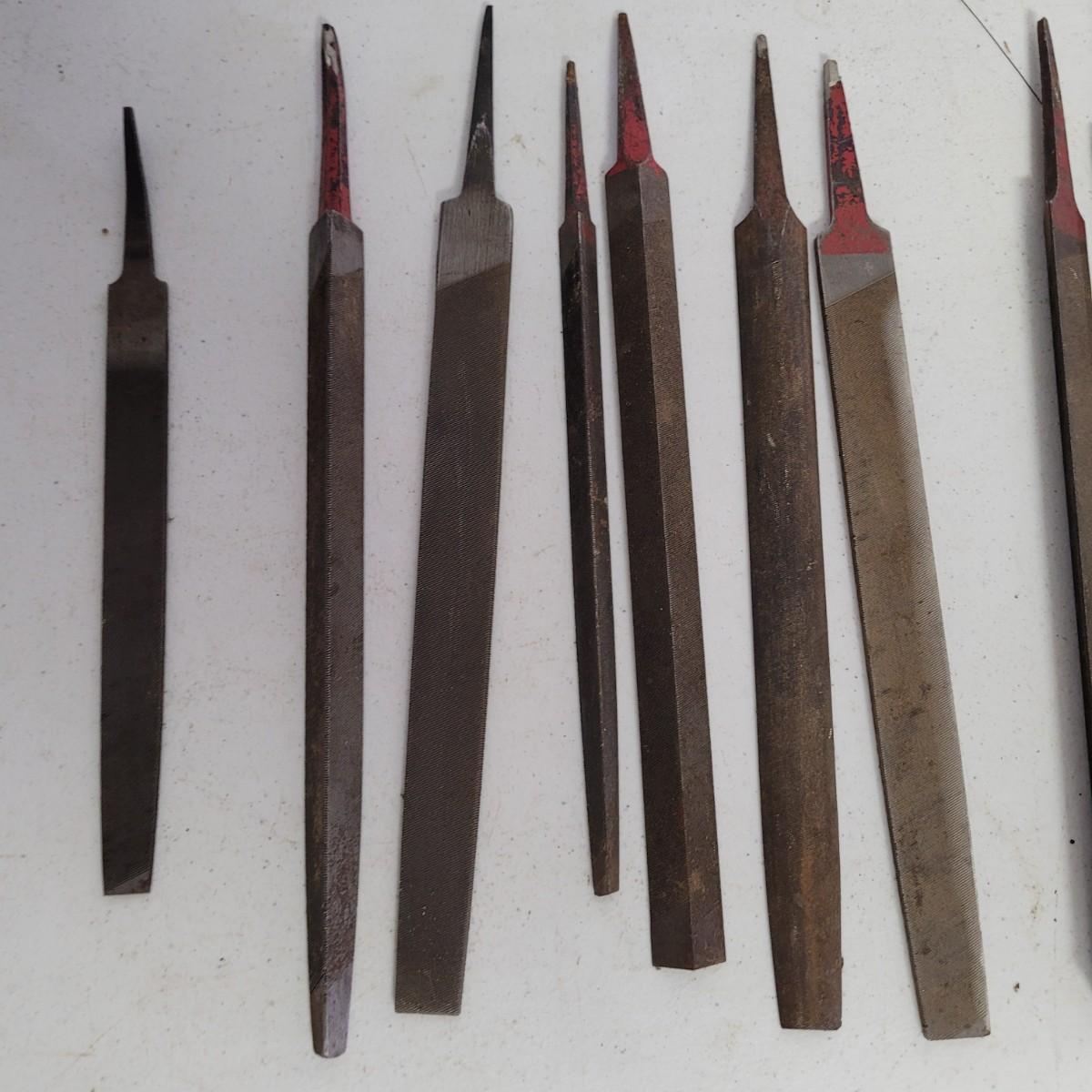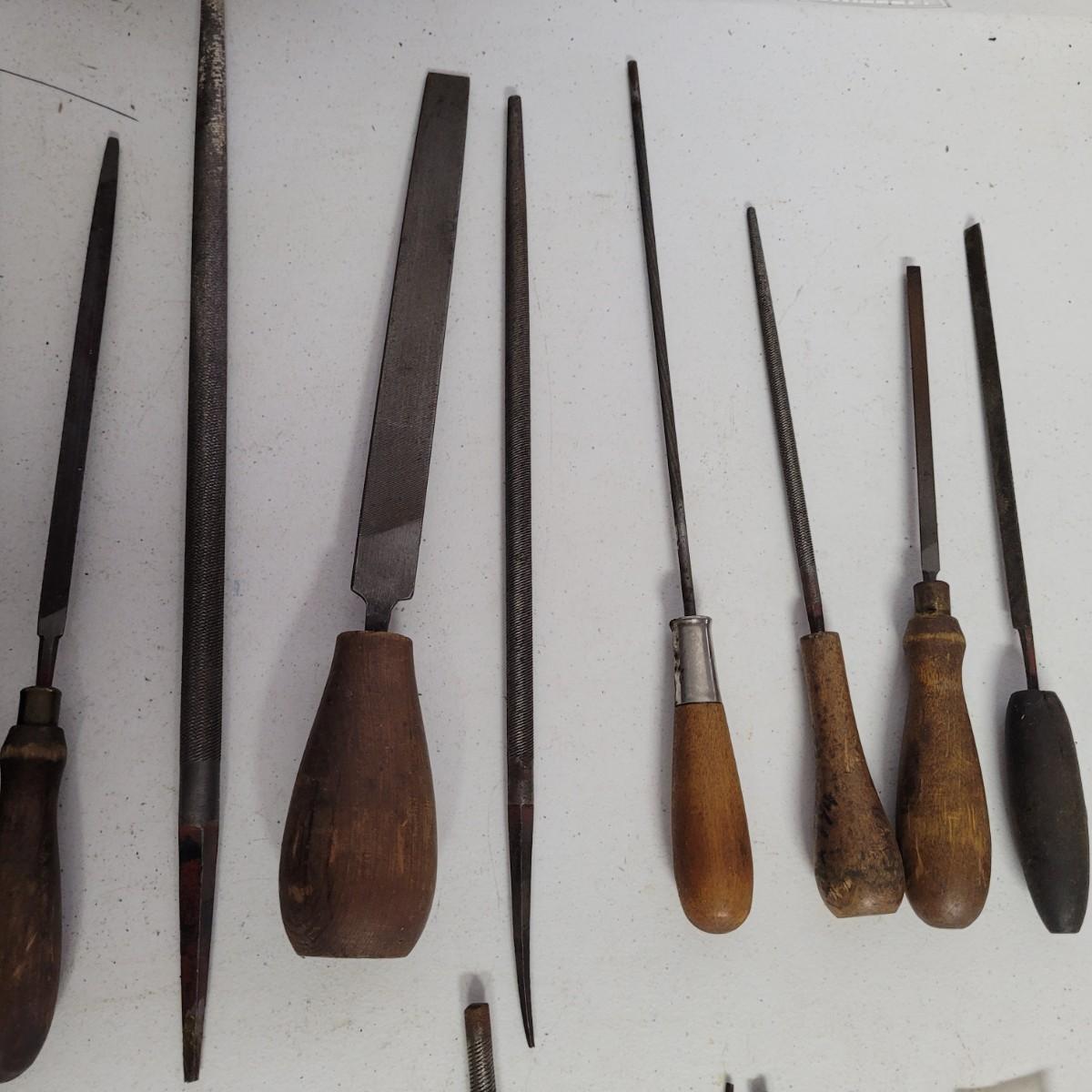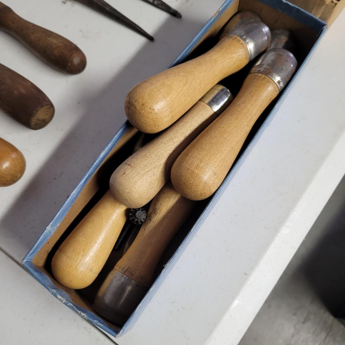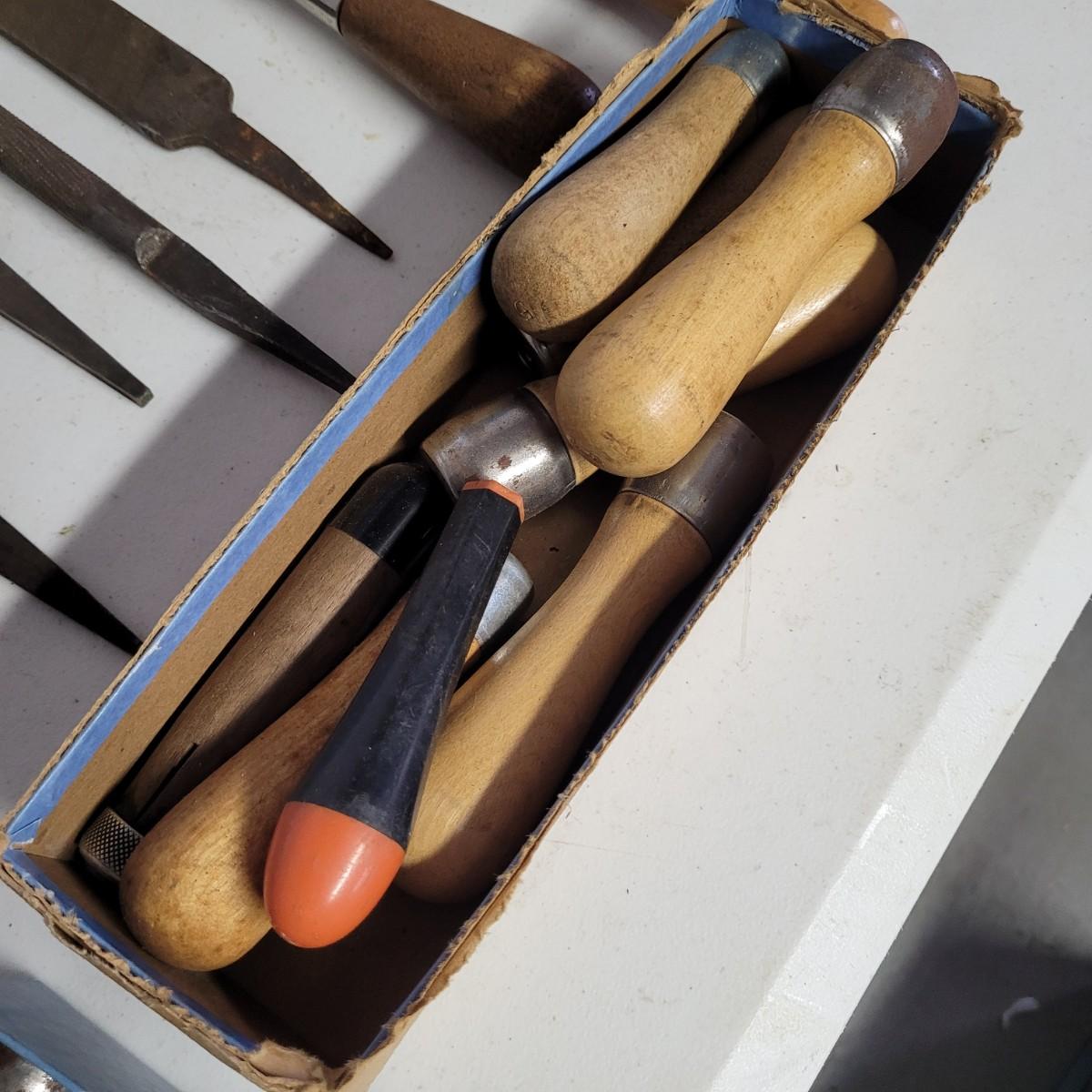 This lot includes a very large assortment of files. Also included are many wood handles for swapping and customizing. Files range in length and style from 21" in length, all the way down to 7" in length. There are about 15 handles, and about 90 files! Also included is a carrying tray and 5 gallon bucket.