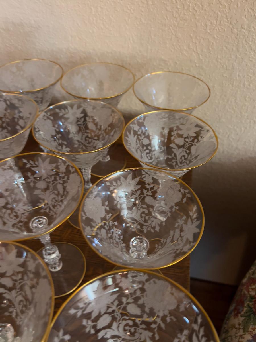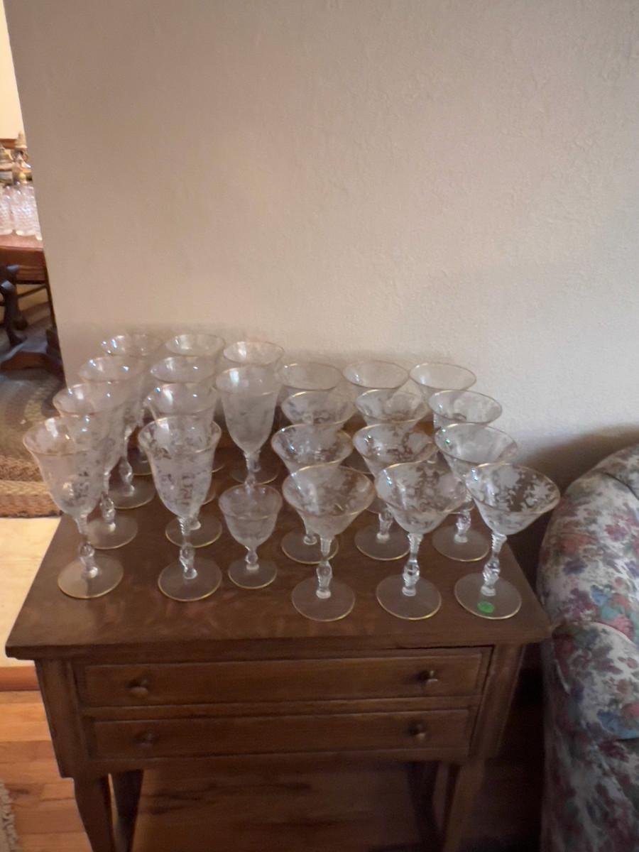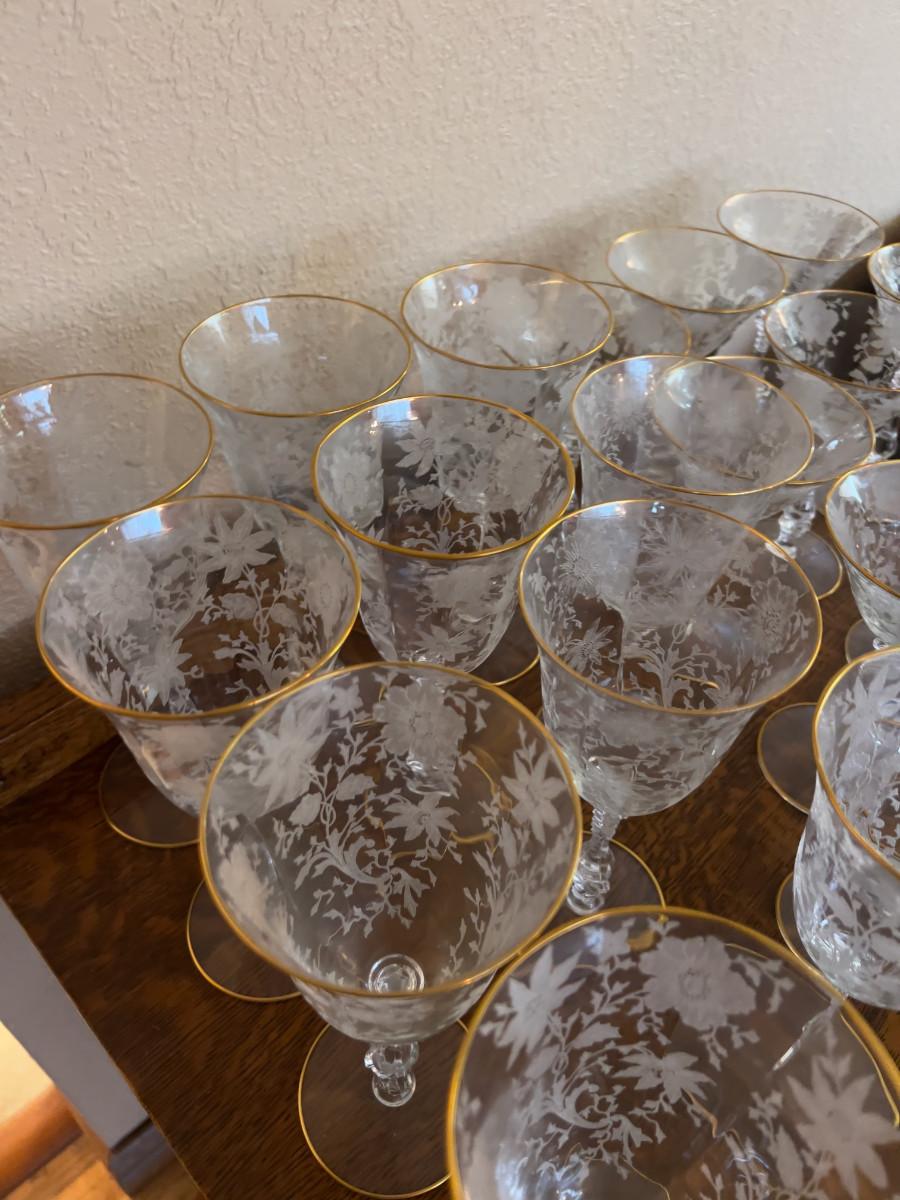Very Large Set of Etched, Gold Rimmed, Crystal Stem Ware