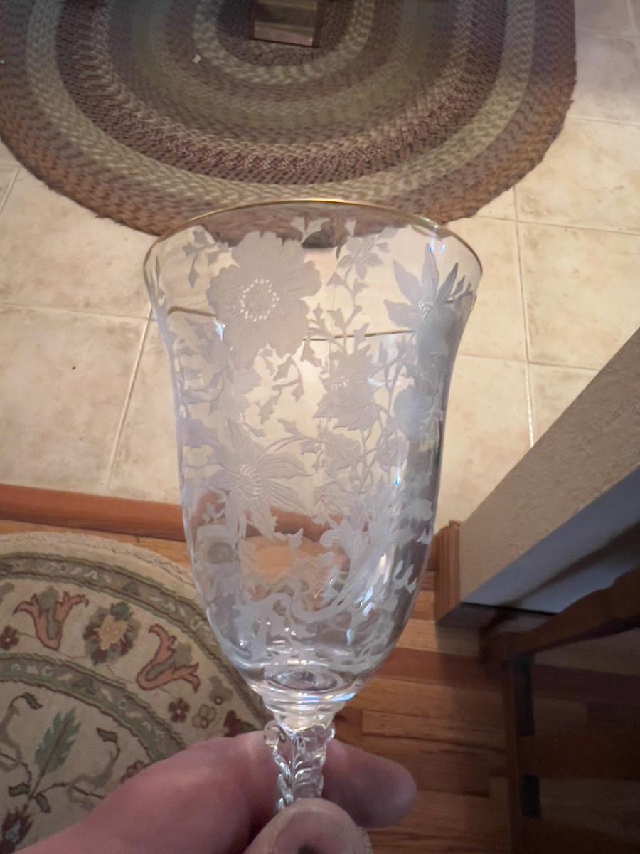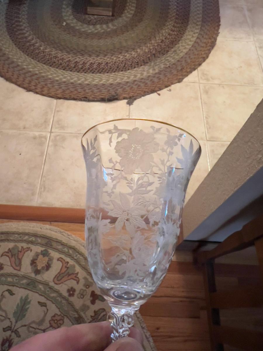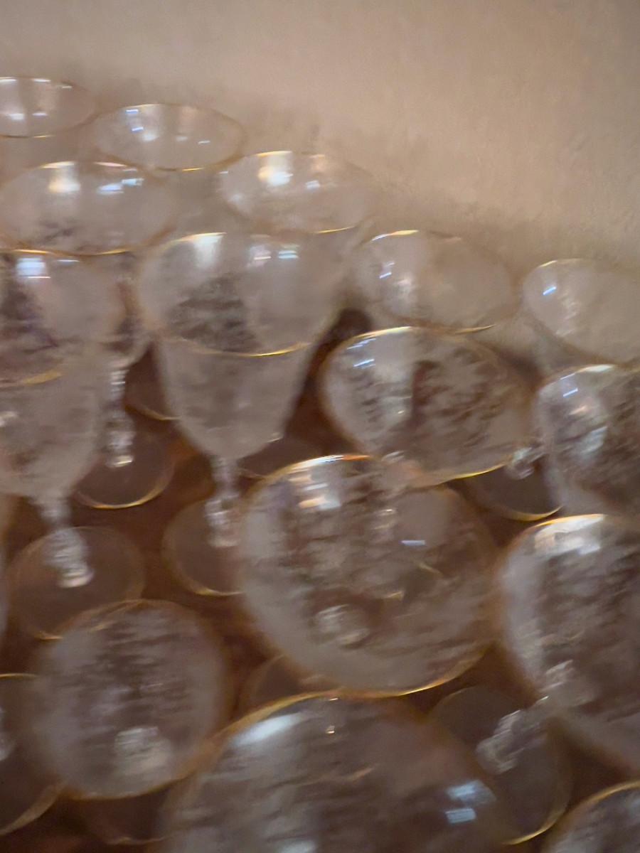 Very Large Set of Etched, Gold Rimmed, Crystal Stem Ware