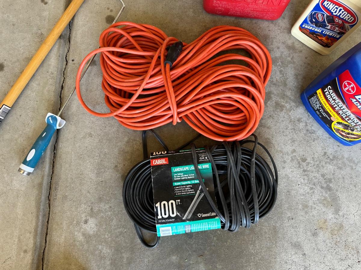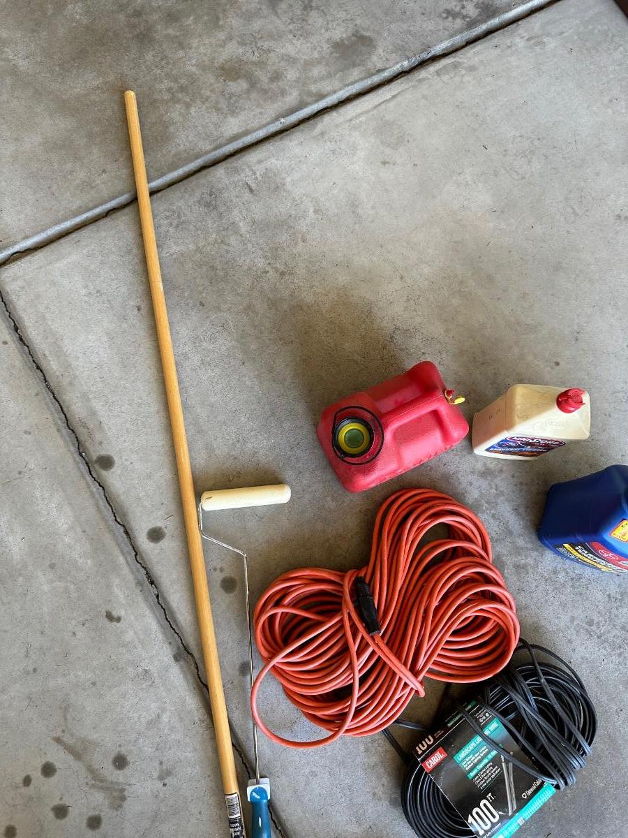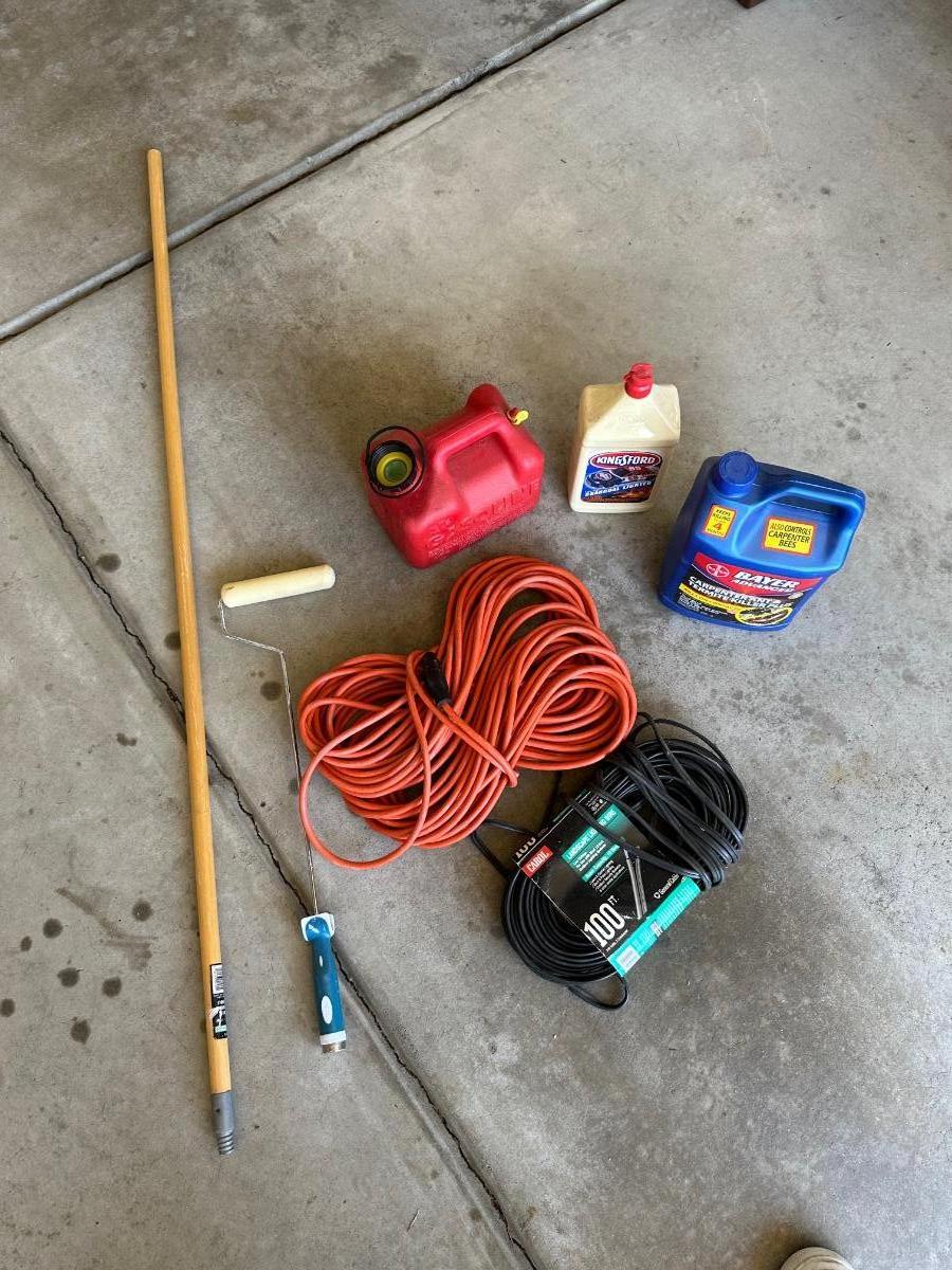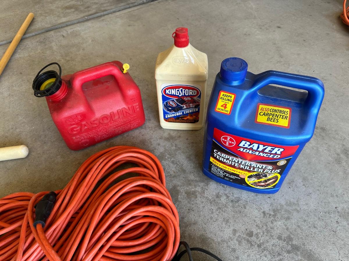 VERY LONG EXTENSION CORD, GAS CAN, ANT KILLER AND MORE