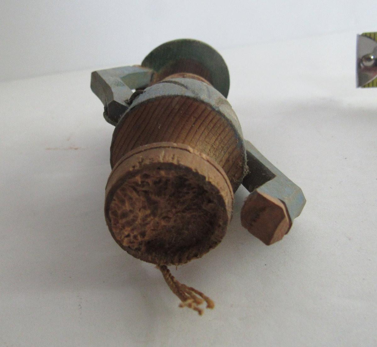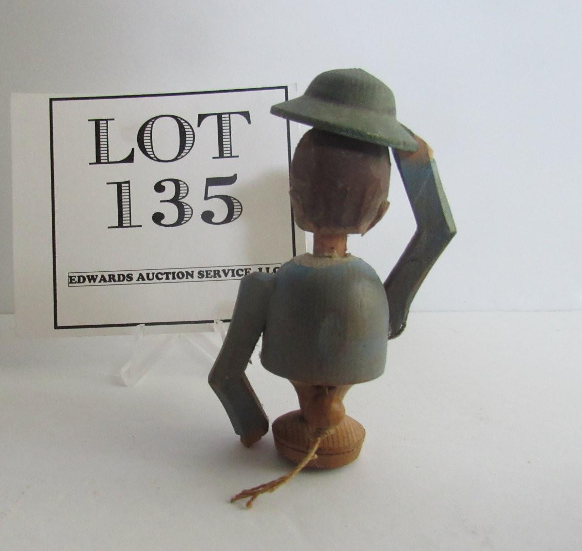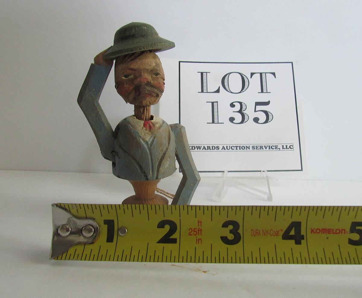 This is a really neat old piece. When you pull the cord on back he tips his hat and nods his head. Minor wear, but super patina. The cork is broken off and needs to be replaced, very easy to fix. Shipping is available on this lot with additional shipping and handling fees. See our terms for details.