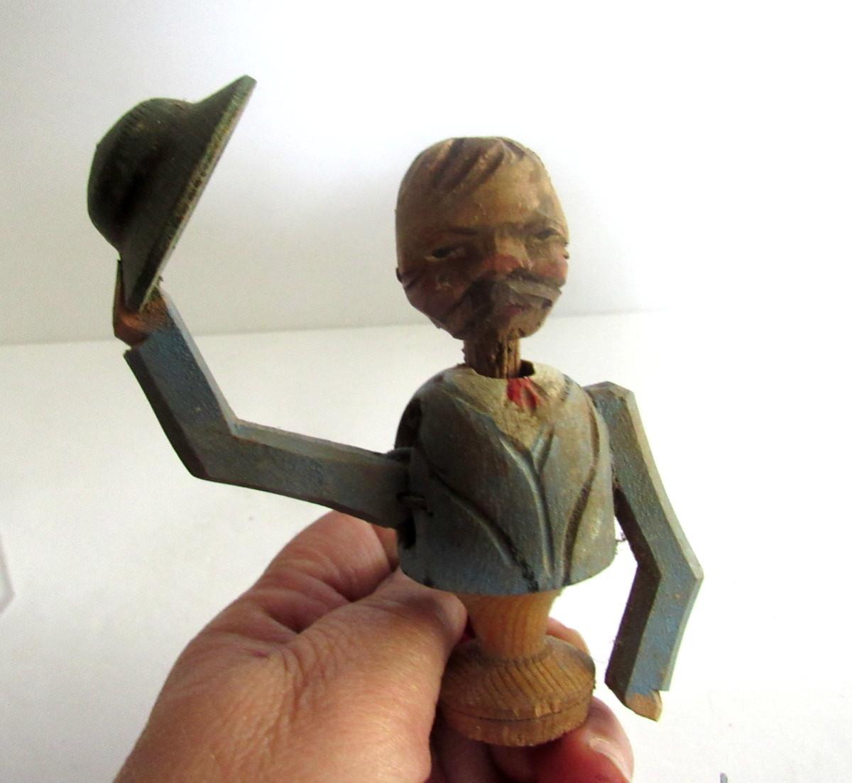 Very Neat Antique Hand Carved Folk Art Bottle Stopper, Pull Cord and Man Tips Hat & Nods Head