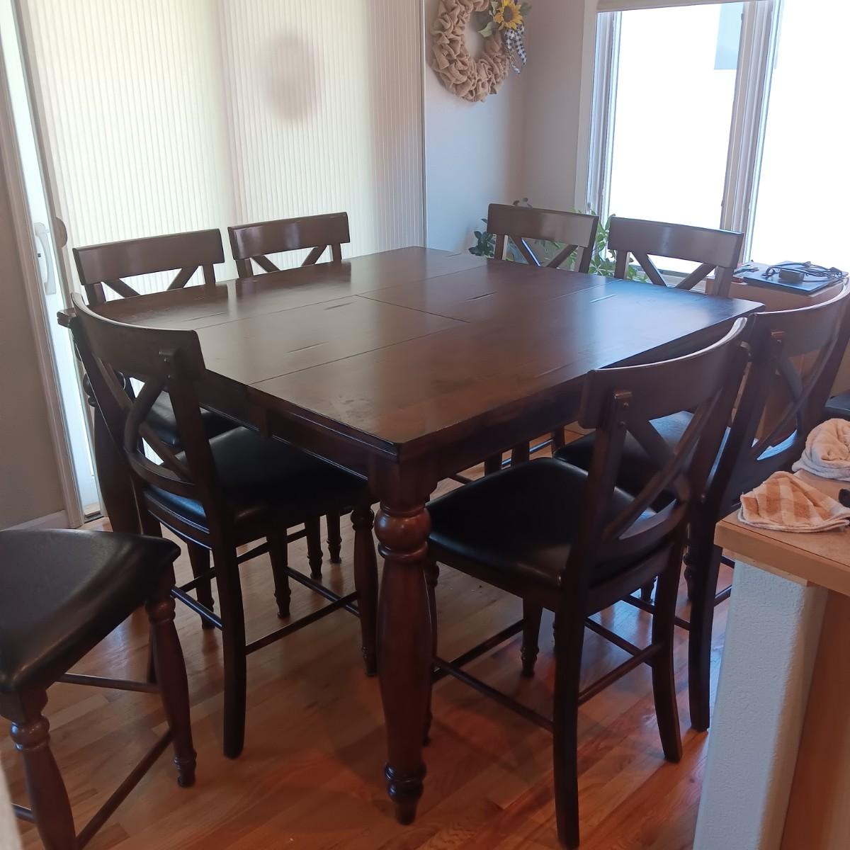 VERY NICE COUNTER HEIGHT DINING TABLE W/BUTTERFLY LEAF AND 8 CHAIRS