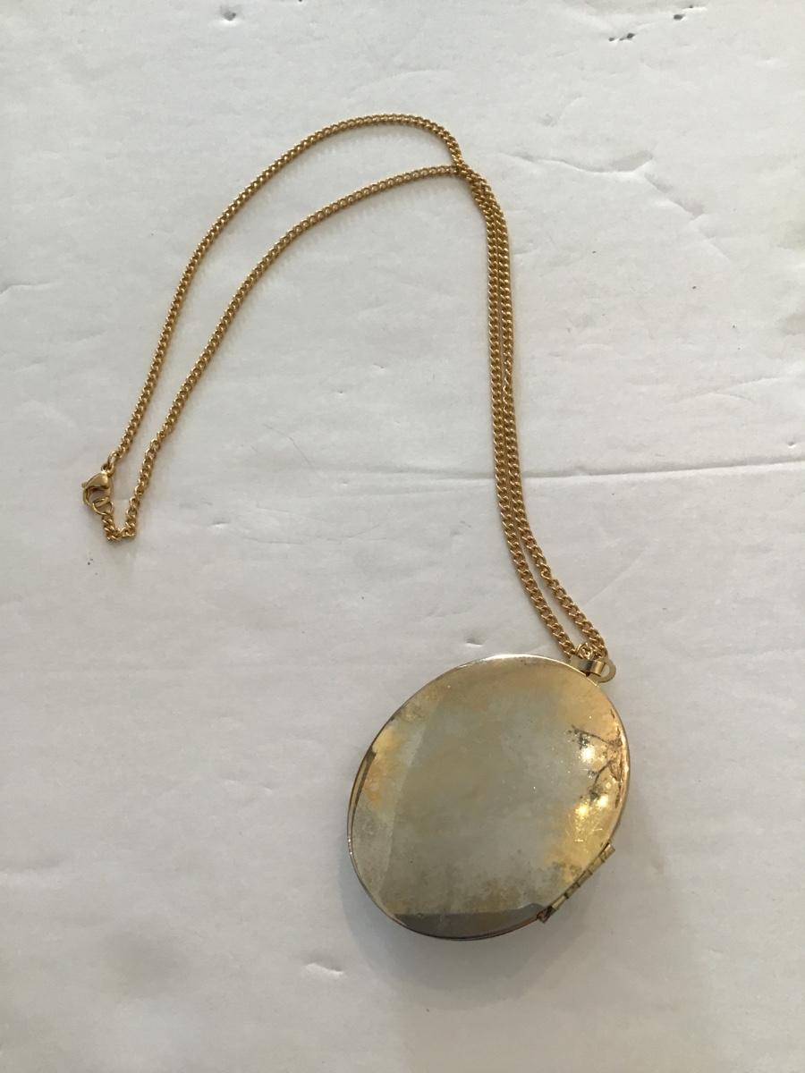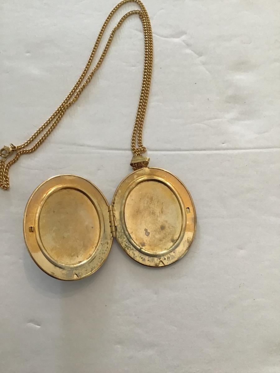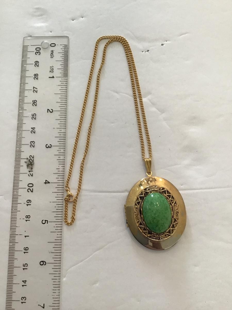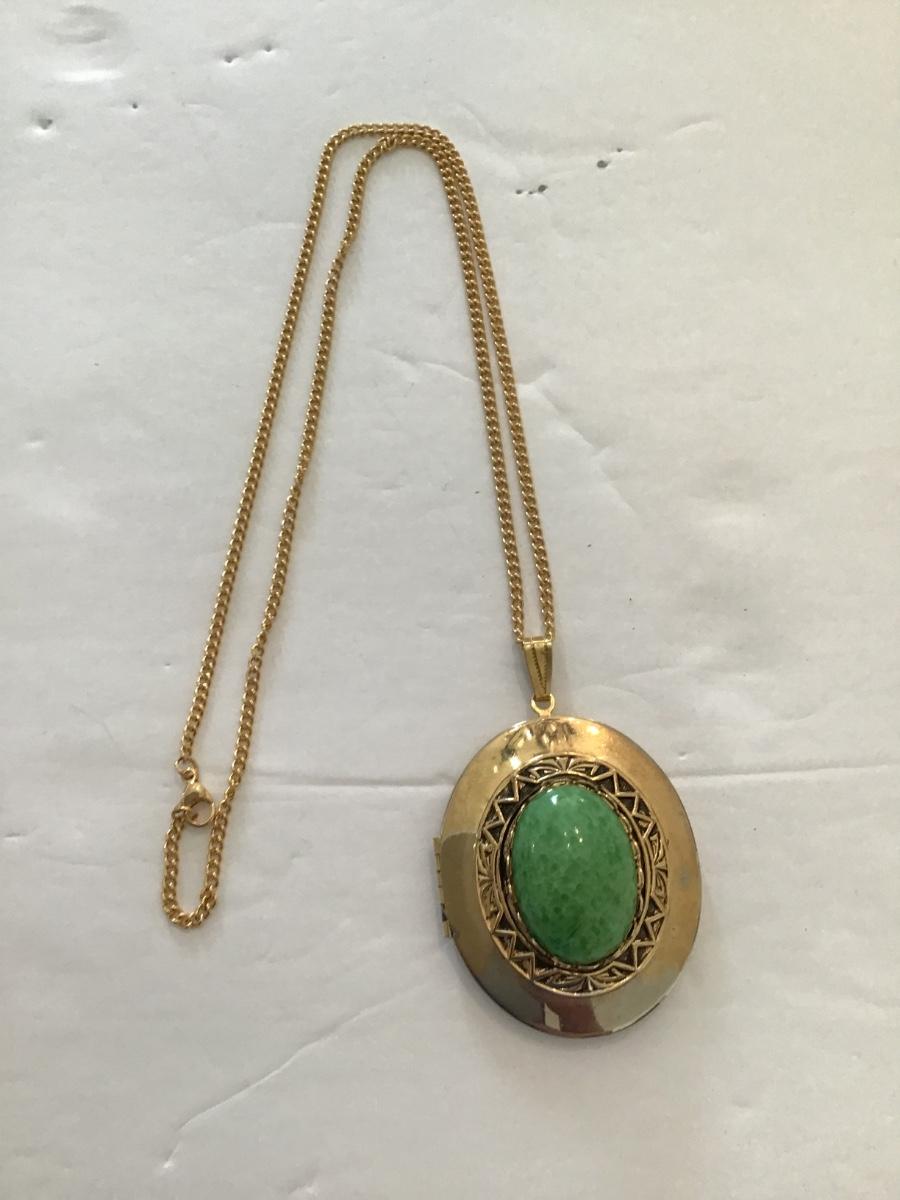 Very nice gold tone, locket with polished green stone. Please see attached photos.