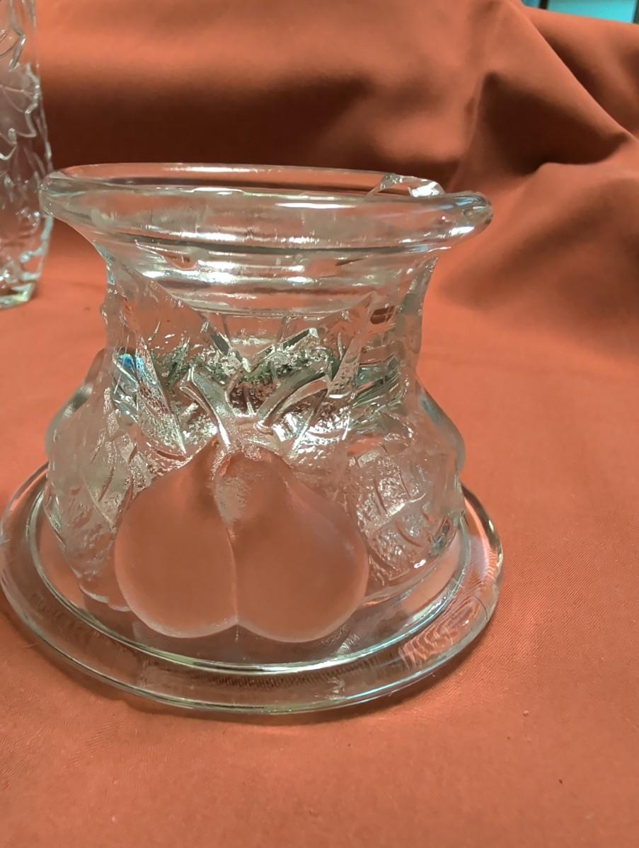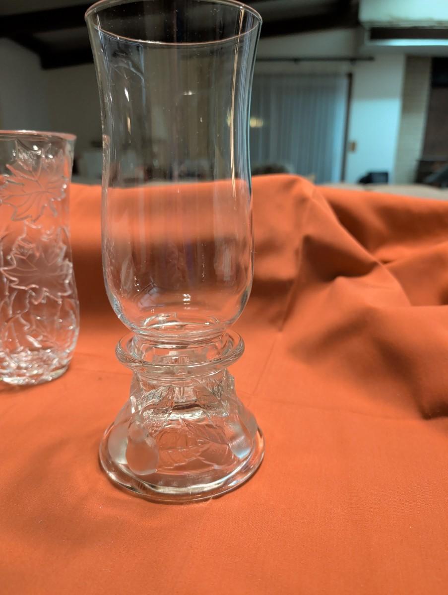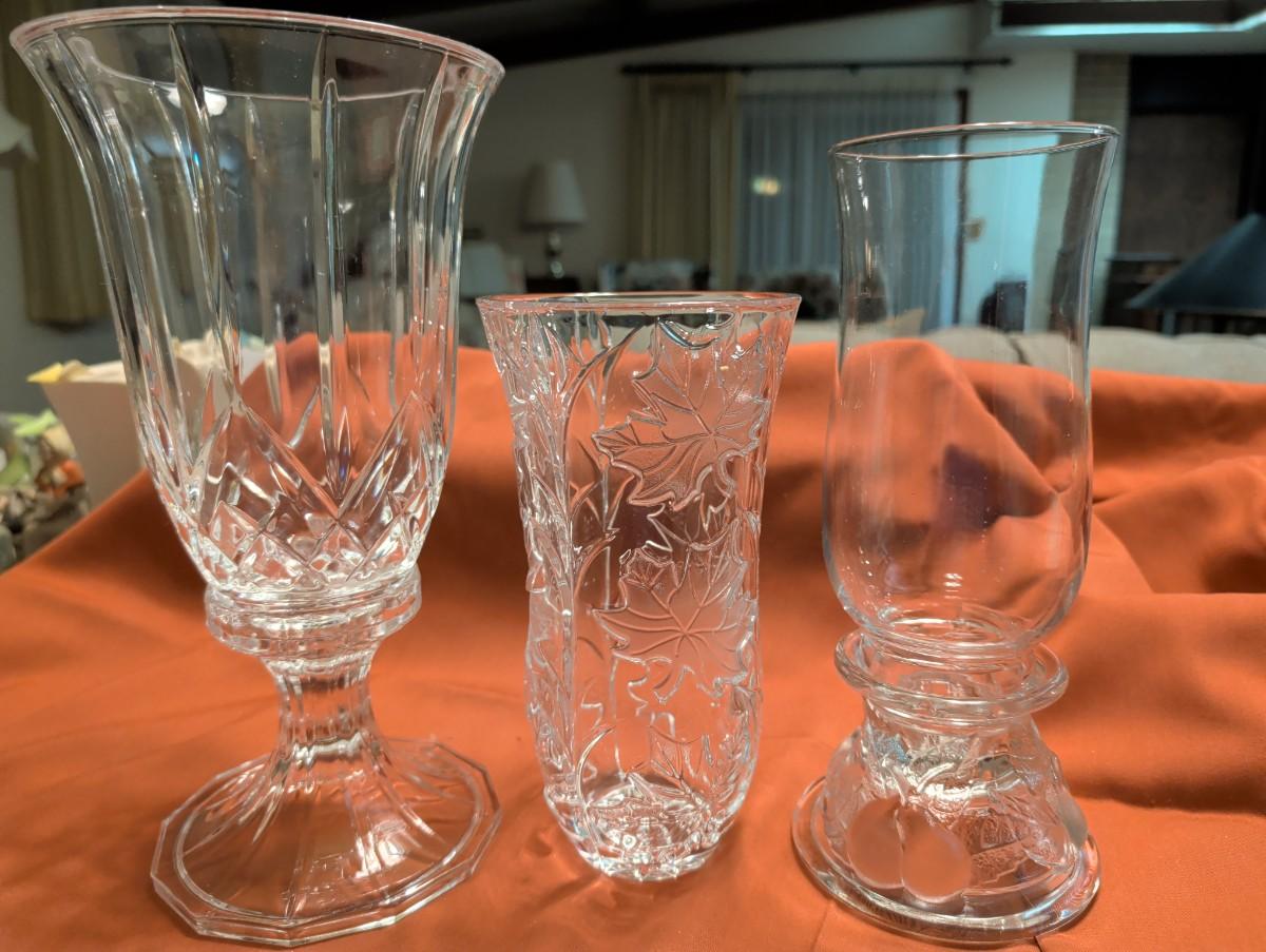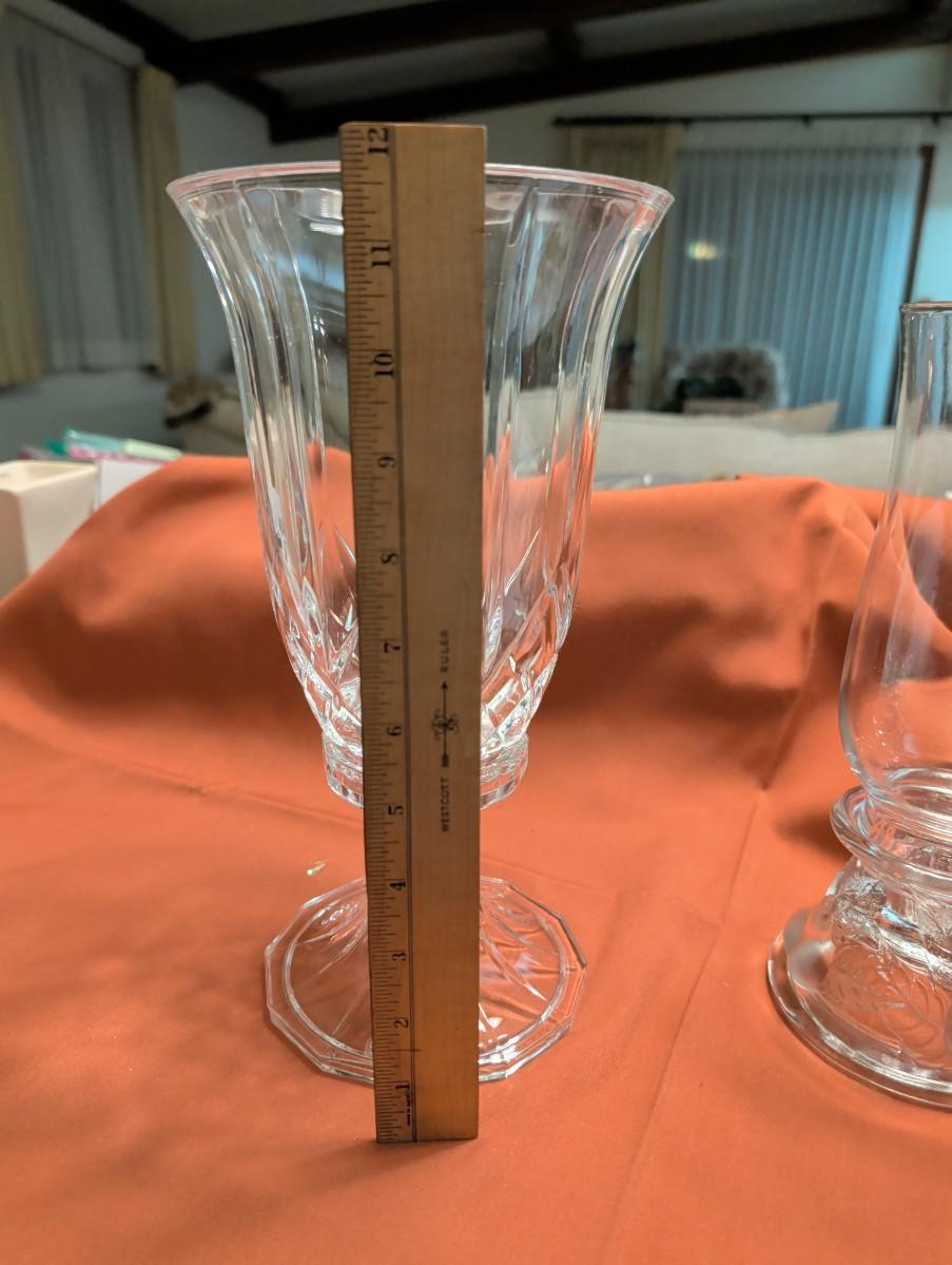 Party lite hurricane candle holder, Teleflora 1985 base, not sure if the globe goes with it. Base is broken fruit design, Vintage DePlomb 24% lead crystal cut vase with leaf design.