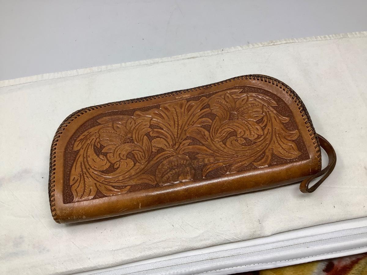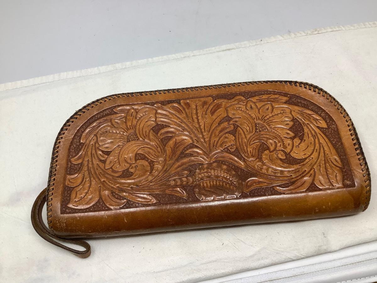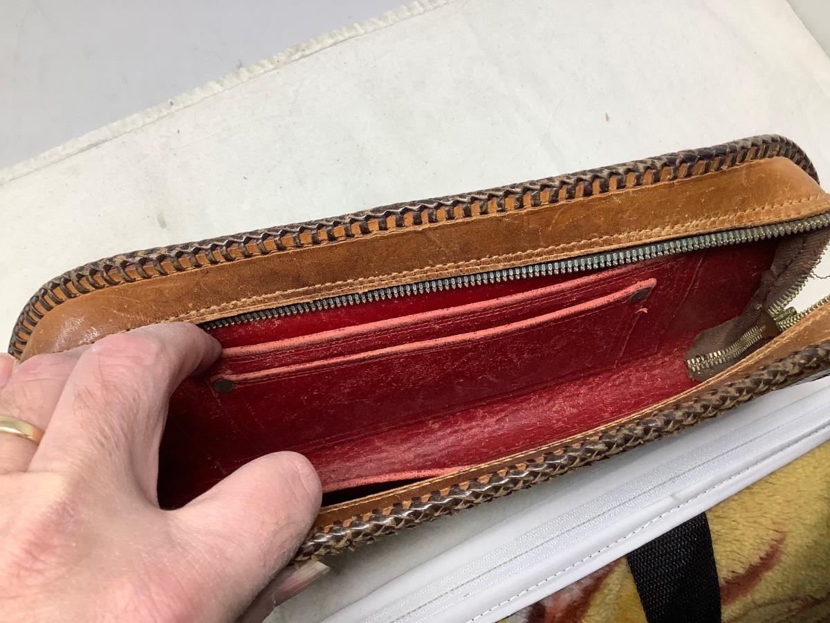 This is a great leather clutch purse. It is in great condition, with pockets inside. It zippers close. Very nice.