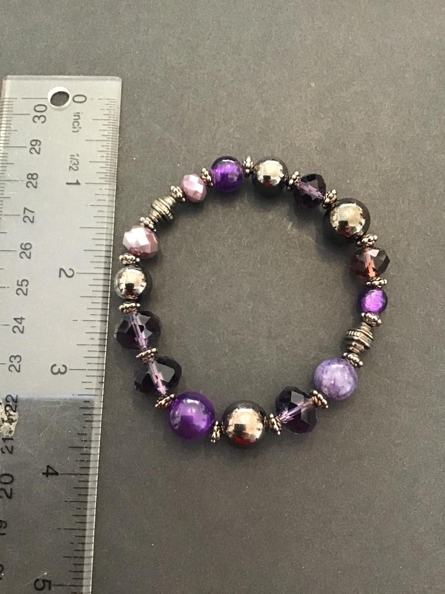 Very nice purple glass beaded and purple Polished stone stretchy bracelet. Please see attached photos.