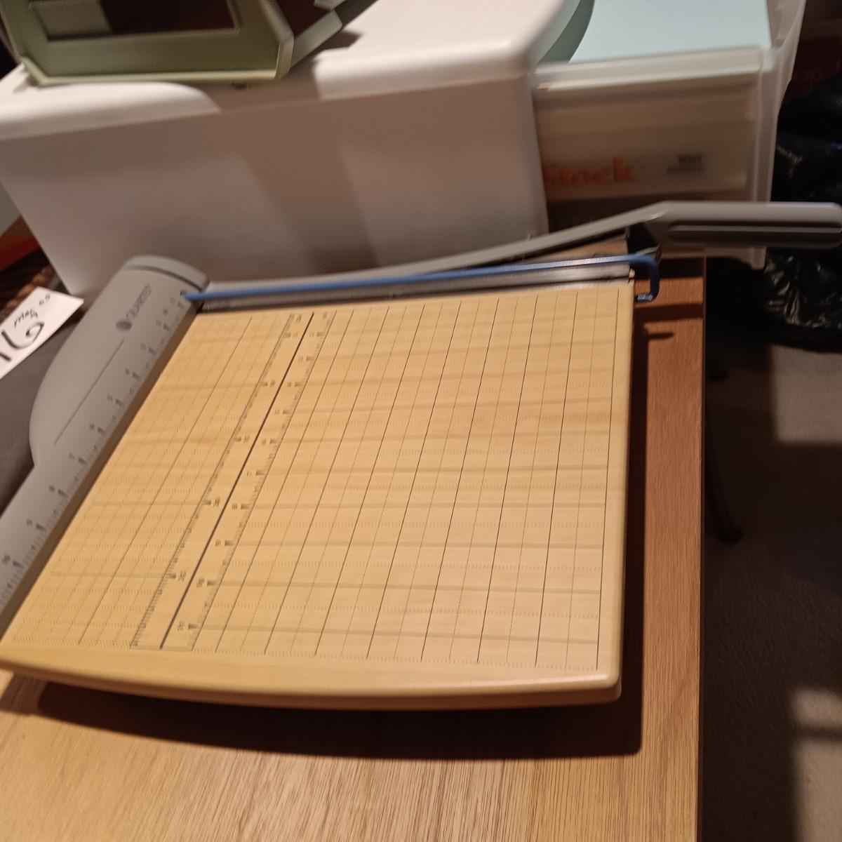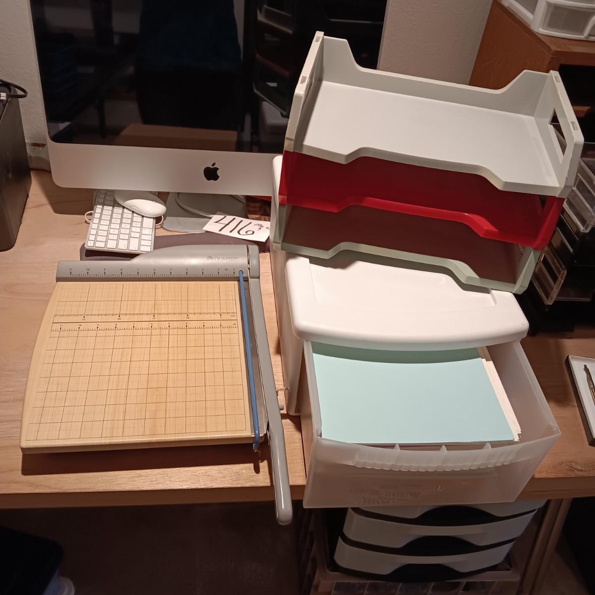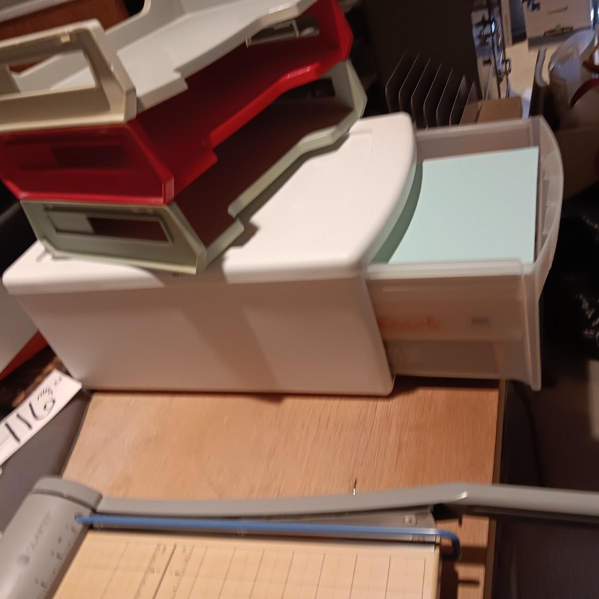 VERY NICE QUARTET PAPER CUTTER, DRAW FULL OF COPY PAPER AND DESK ORGANIZERS