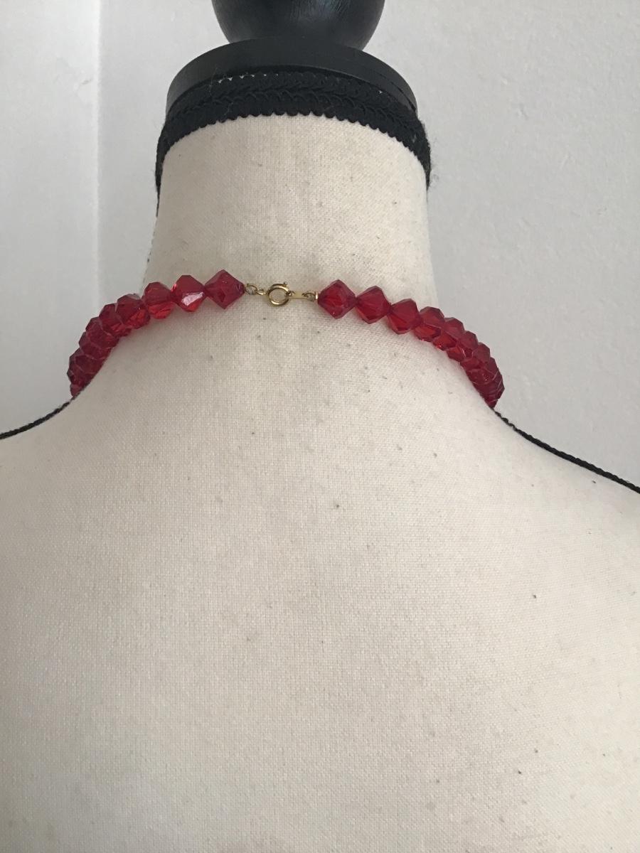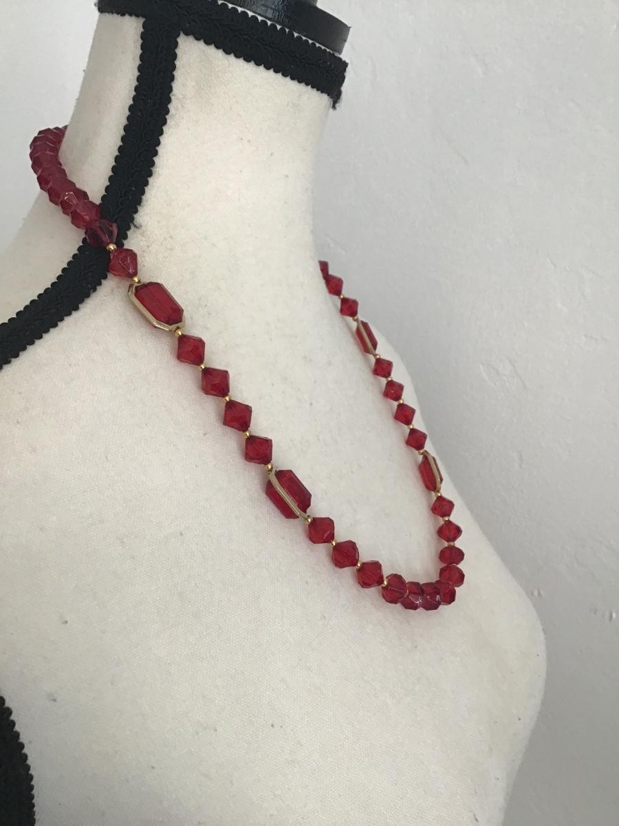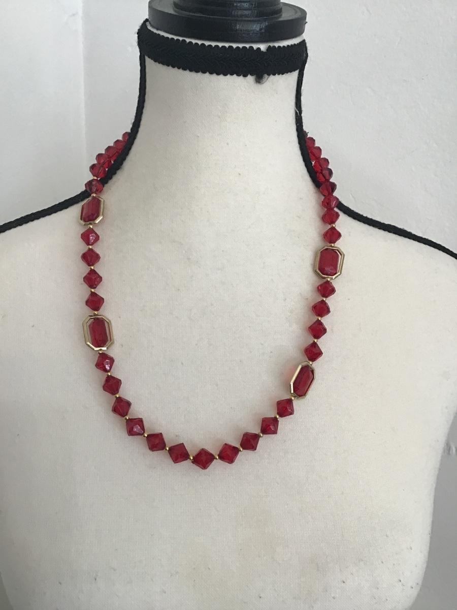 Very nice red faux beaded necklace with gold tone. Please see attached photos.