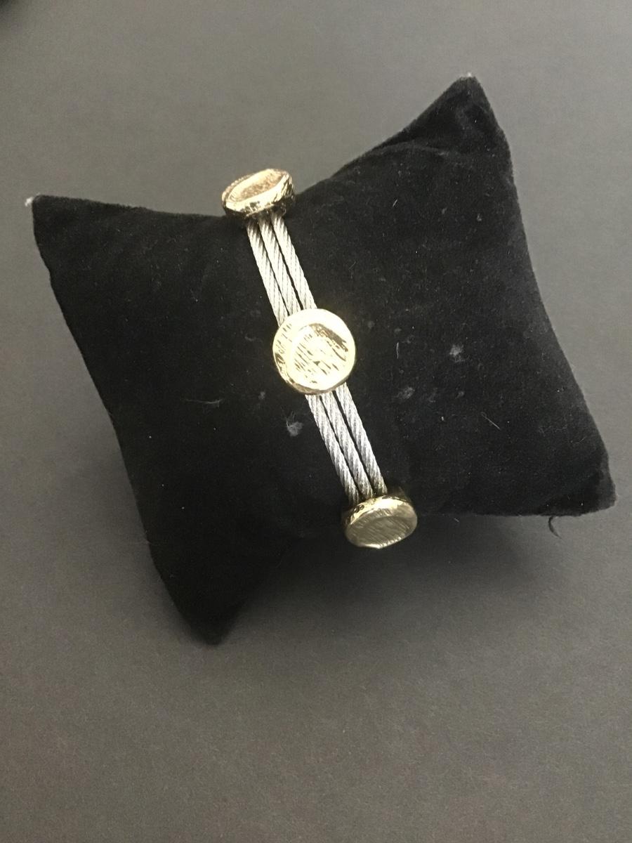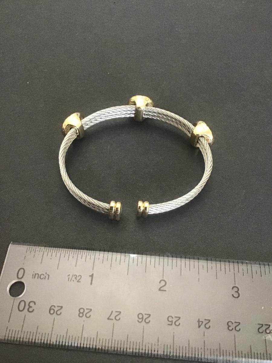 Very nice silver and gold fashion statement bracelet. Please see attached photos.