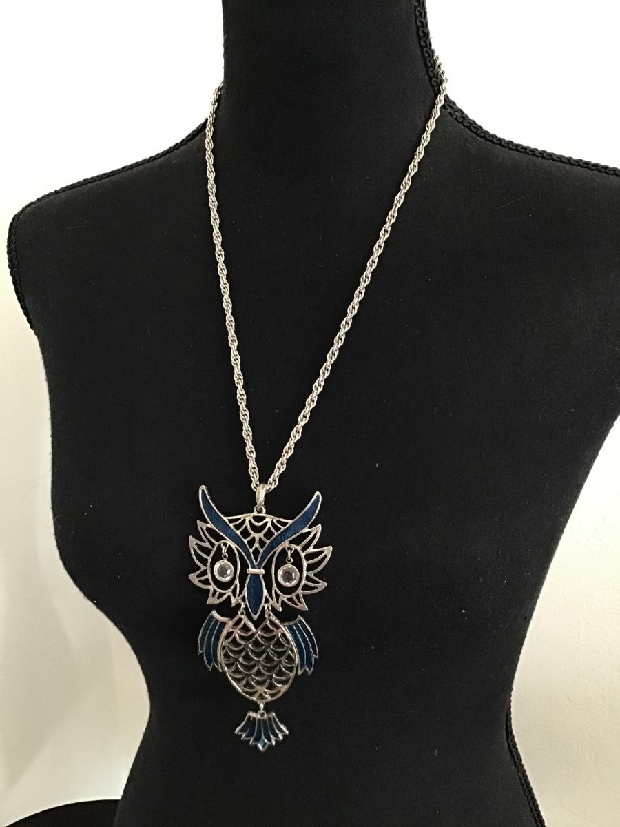 Very nice silver toned, large, retro enamel owl statement necklace, crystal eyes