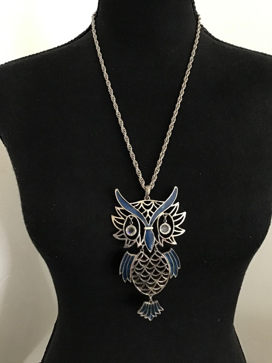 Very nice silver toned, large, retro enamel owl statement necklace, crystal eyes