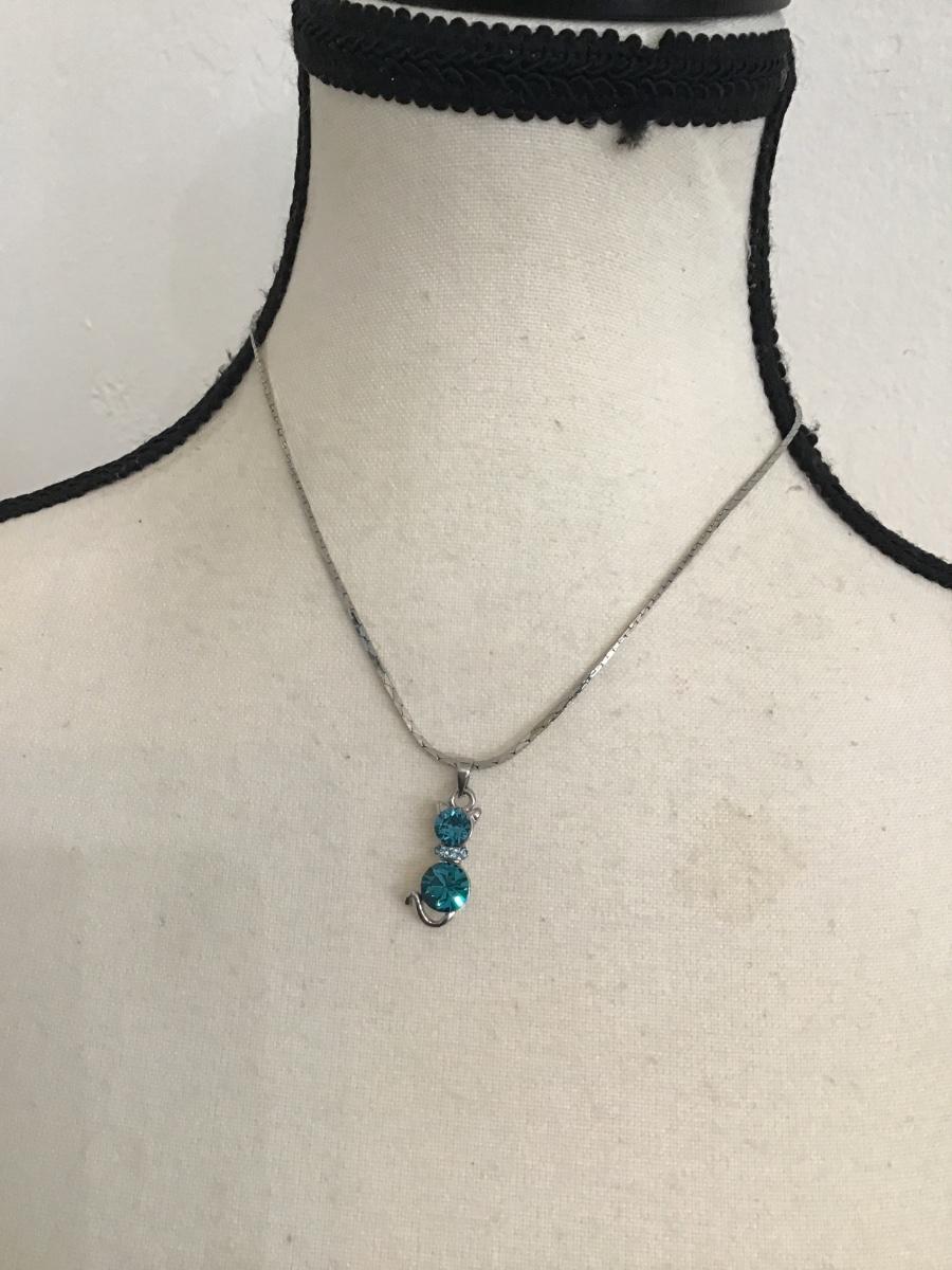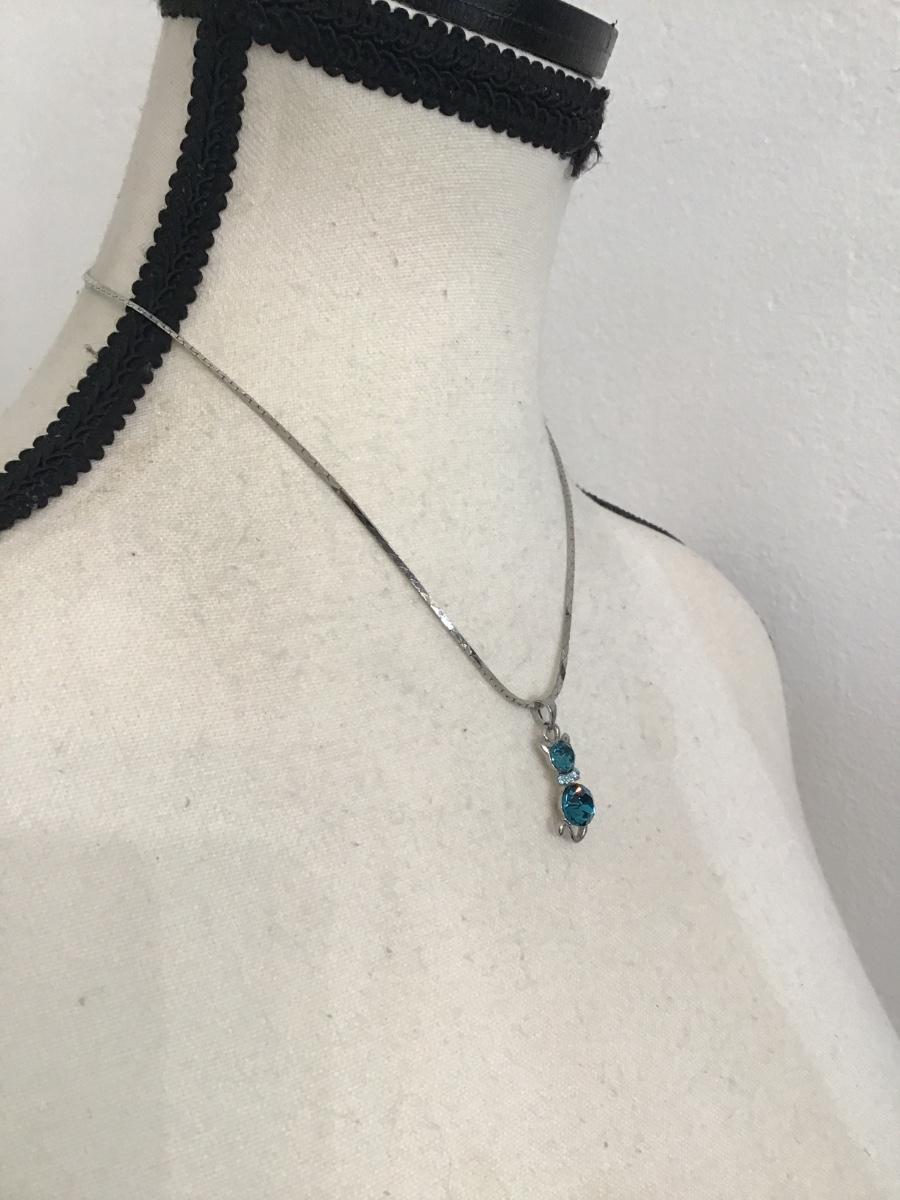 Very nice Silvertone necklace with blue rhinestone cat pendant. Please see attached photos.