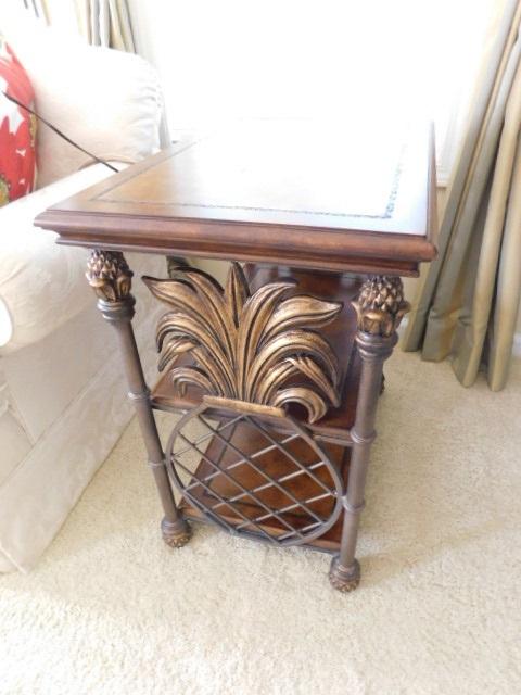 Very Nice Tiered Wood Finish Side Table with Beautiful Hospitality Accents
