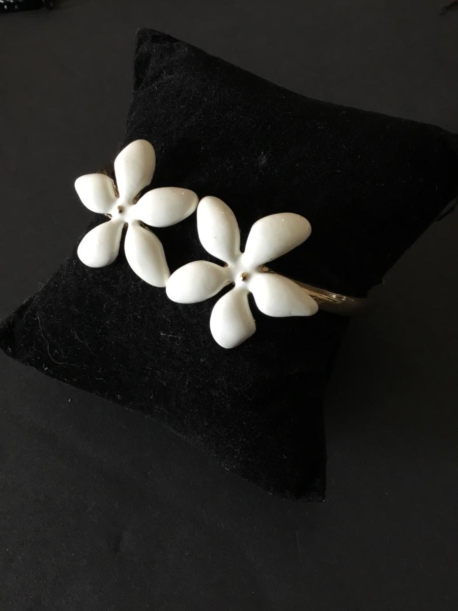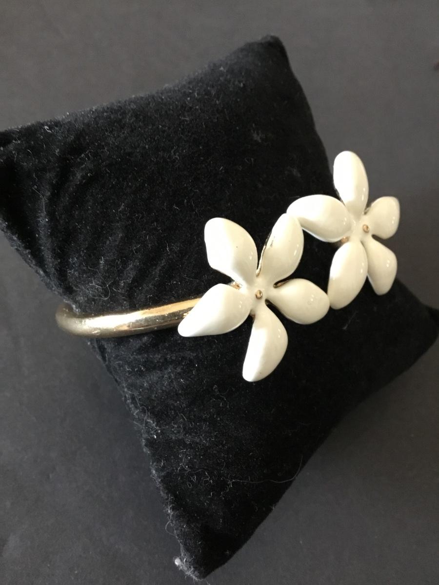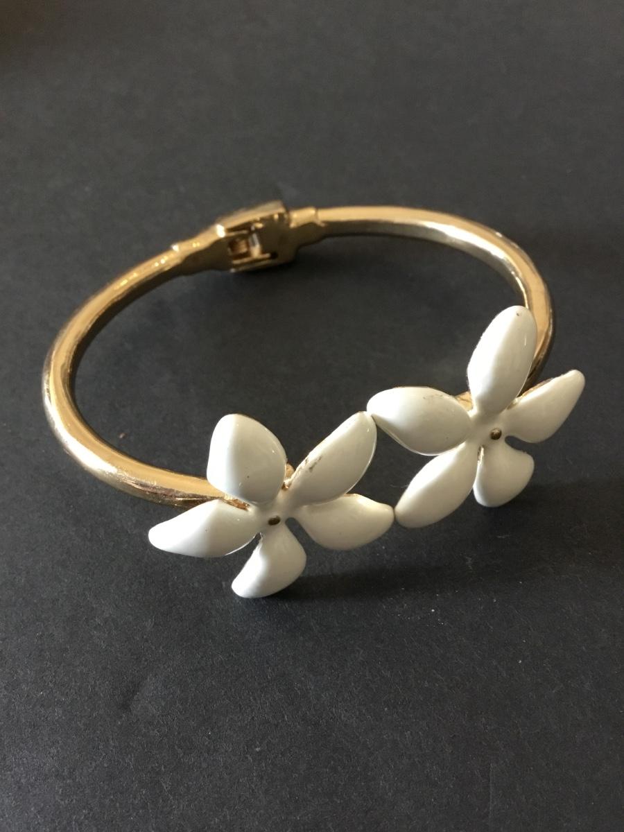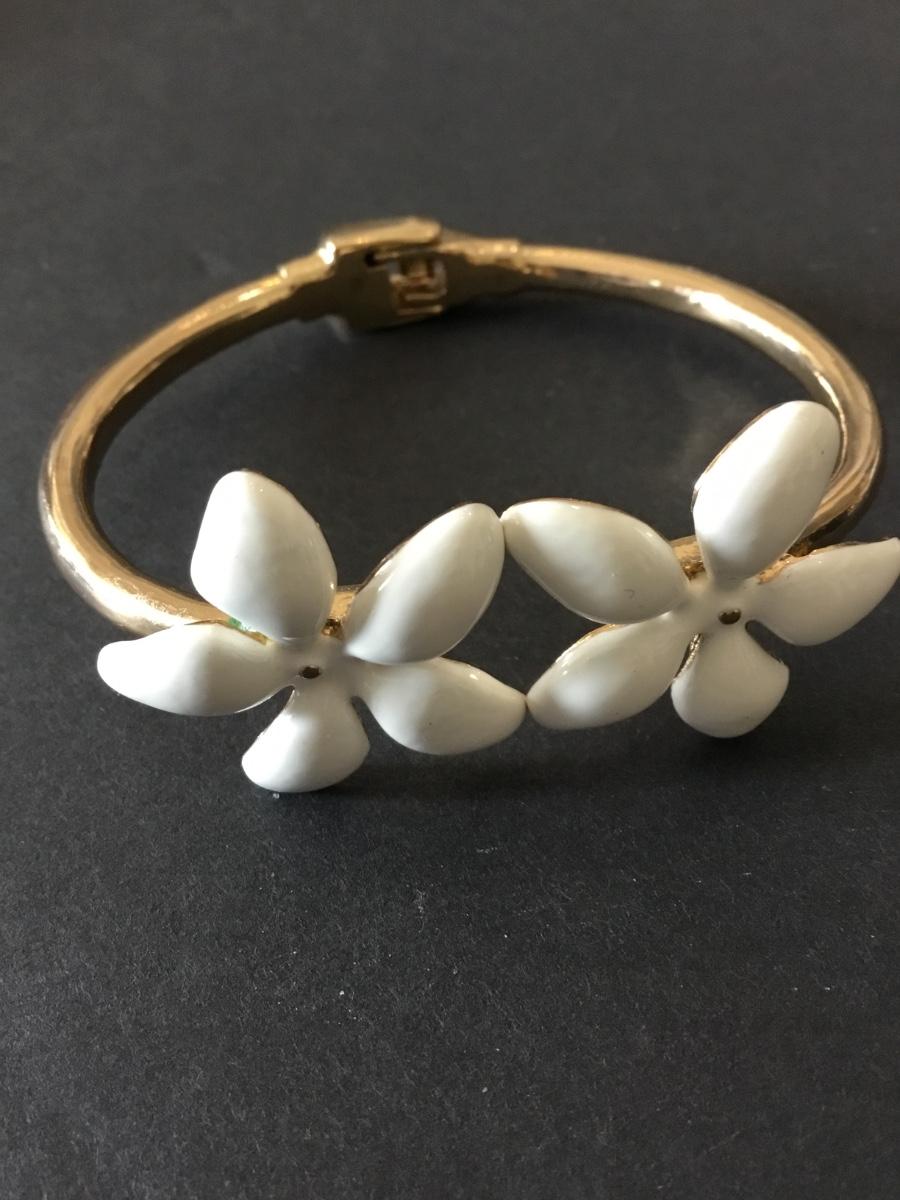 Very nice vintage, gold tone, white cream enamel flower, hinged bracelet