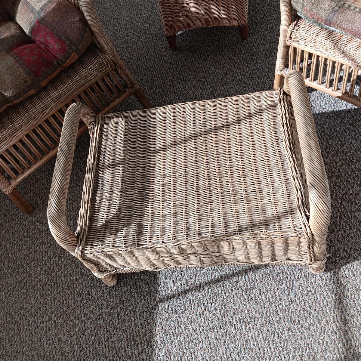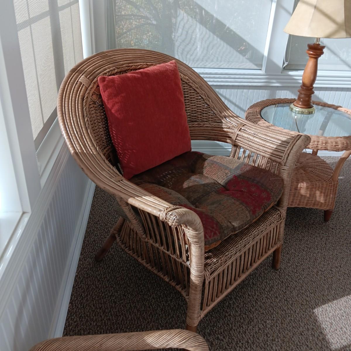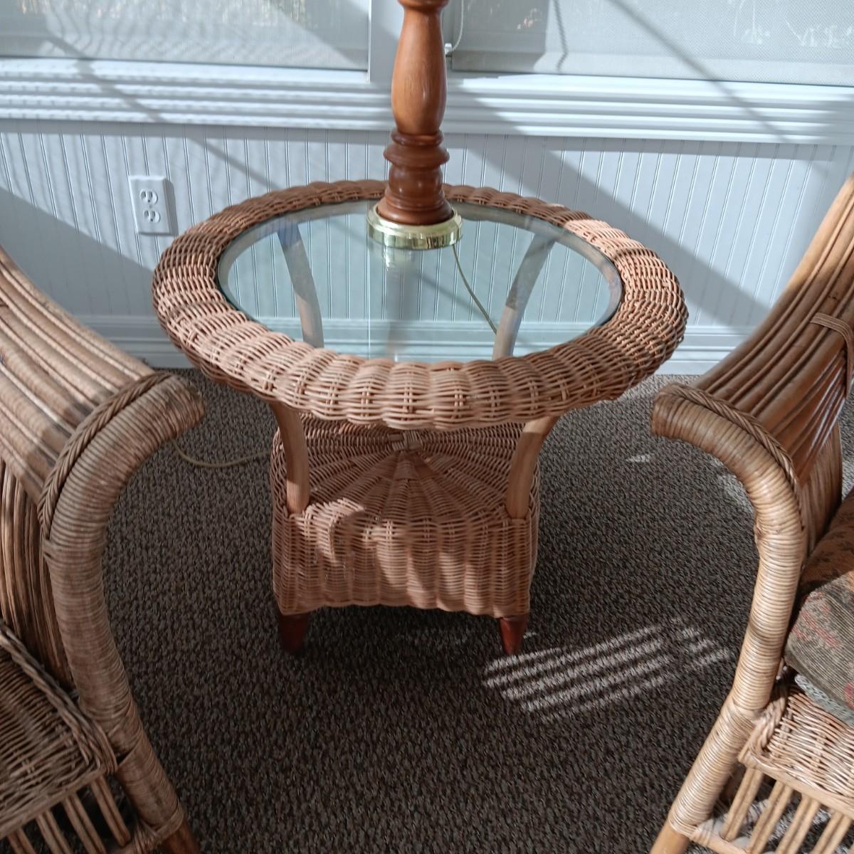 VERY NICE WICKER CHAIRS, SIDE TABLE, FOOT REST AND LAMP