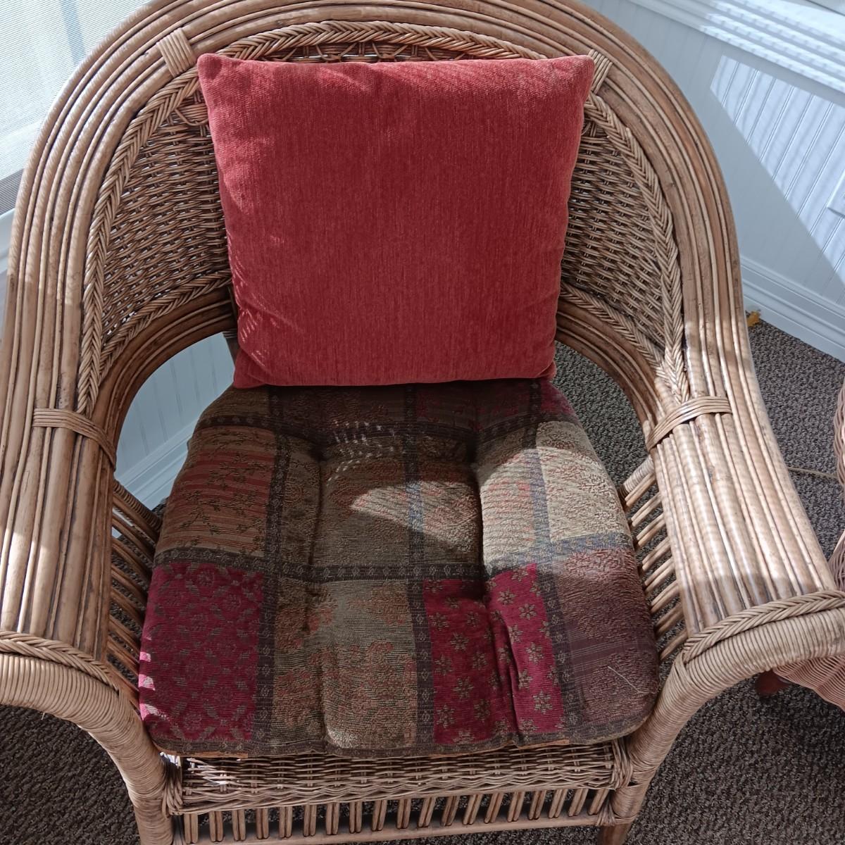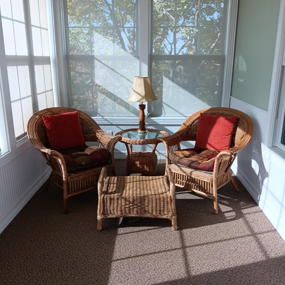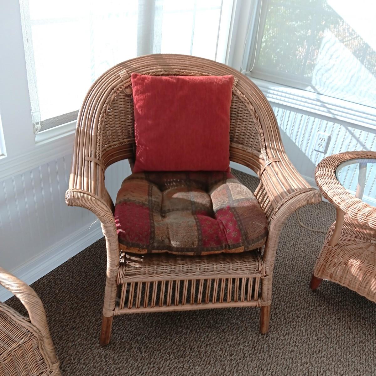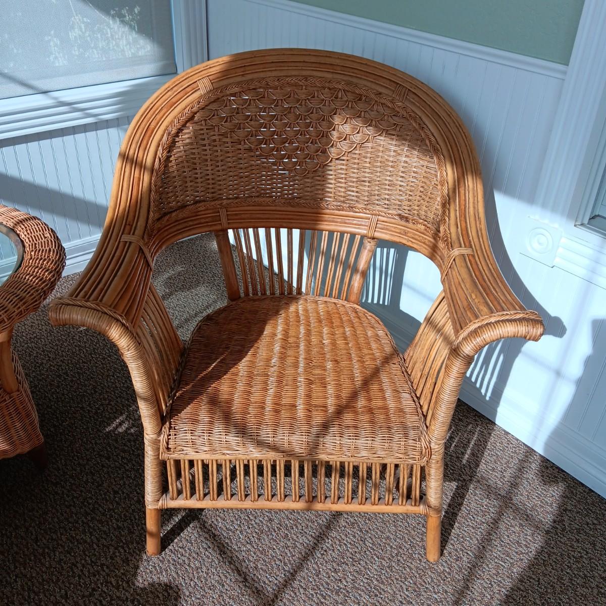 VERY NICE WICKER CHAIRS, SIDE TABLE, FOOT REST AND LAMP