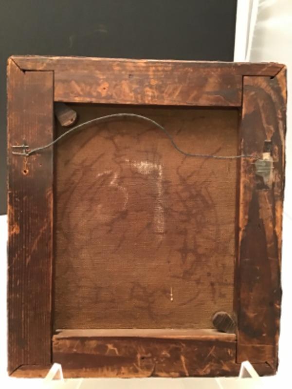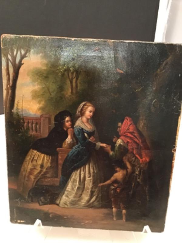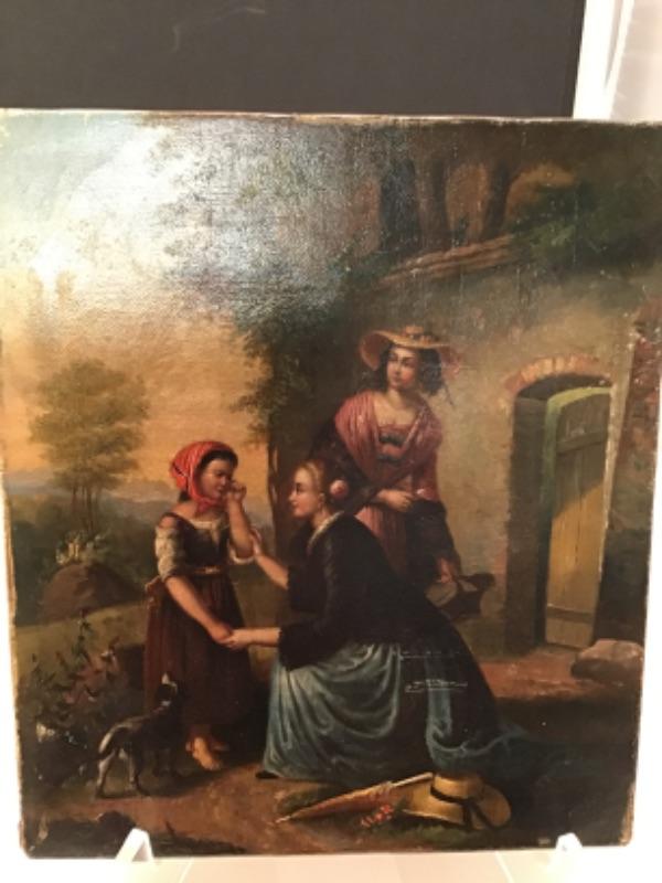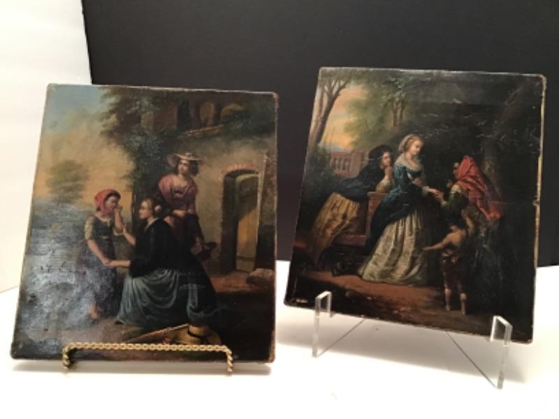 A pair of antique very old oil paintings. No signature discerned. Fortune teller and other painting is woman comforting child