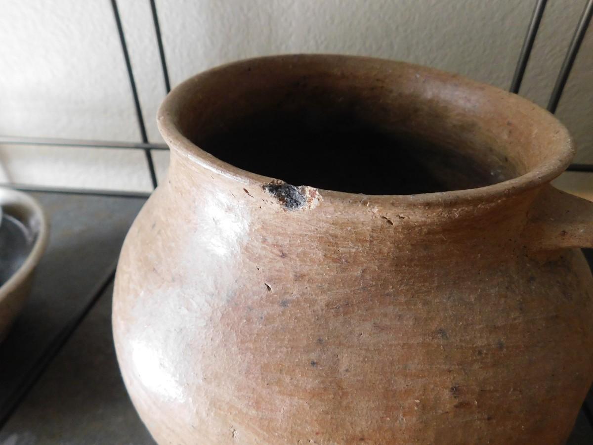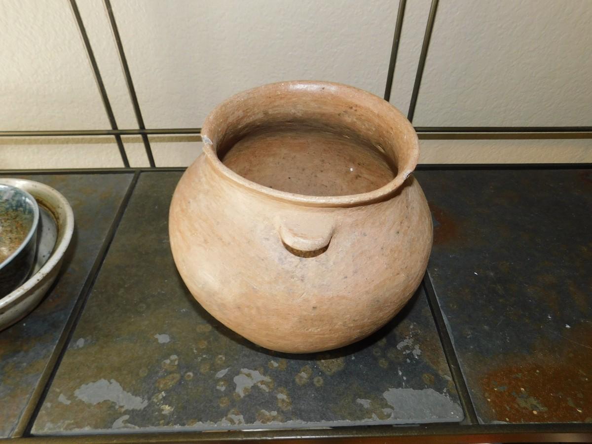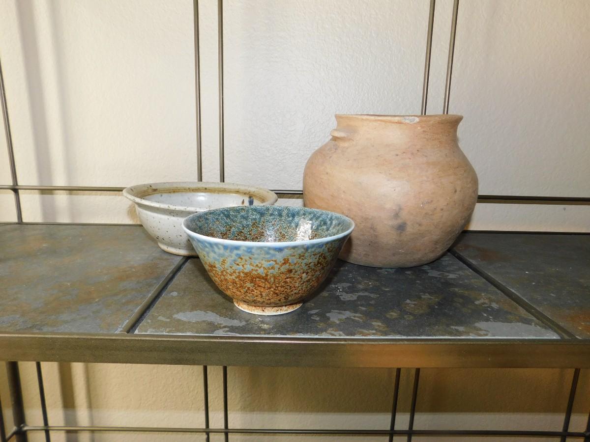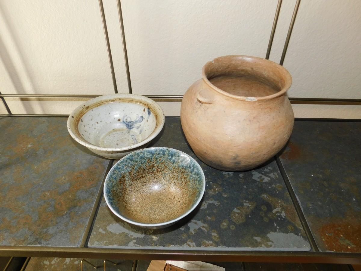 THE LARGE OLD CLAY POT DOES HAVE A COUPLE CHIPS AND CRACK LINES IT MEASURES APPROX 5" AT THE OPENING 8" ACROSS THE CENTER AND 6-1/2" TALL. THE BOWLS ARE 5" AND 7"