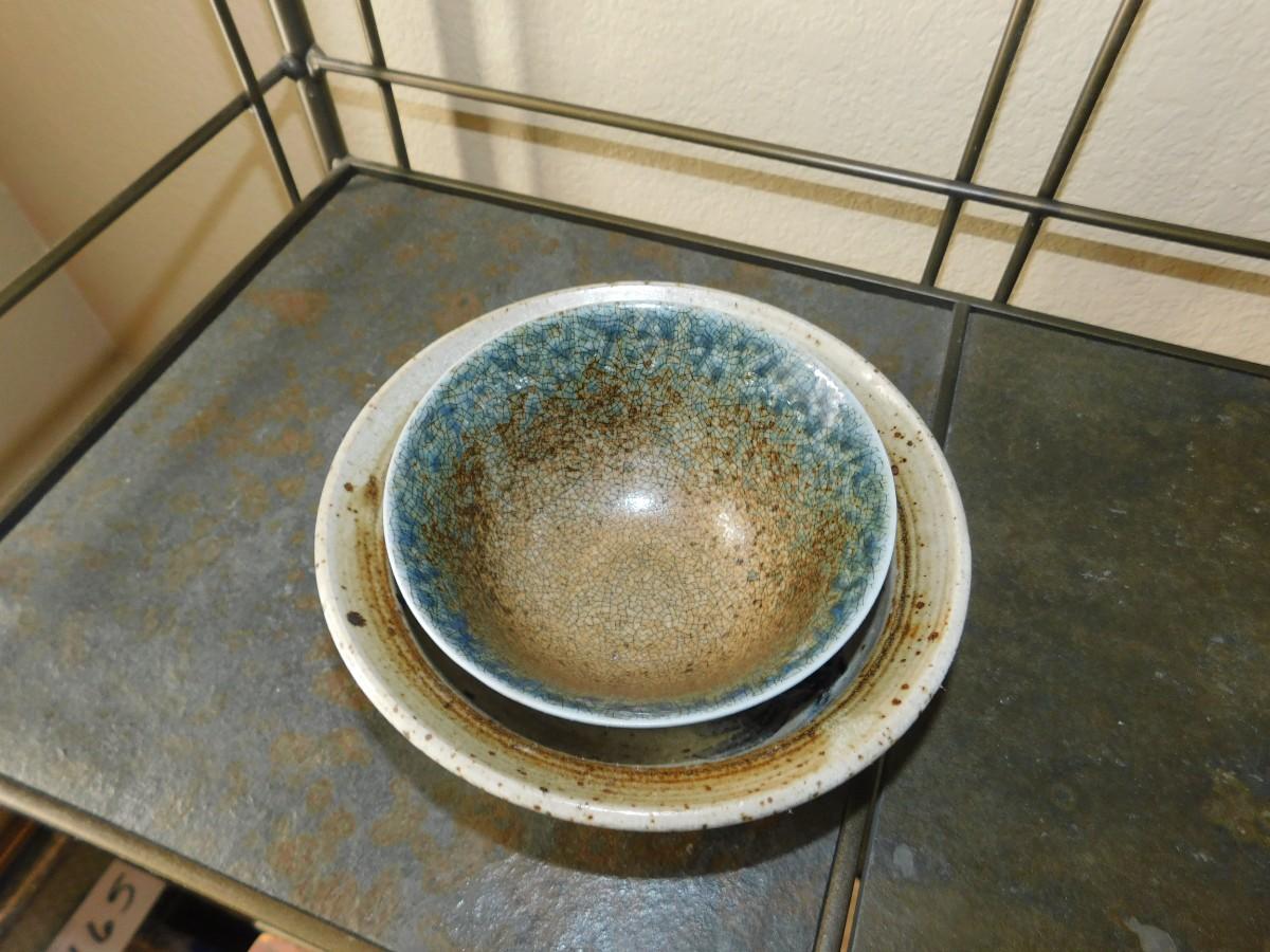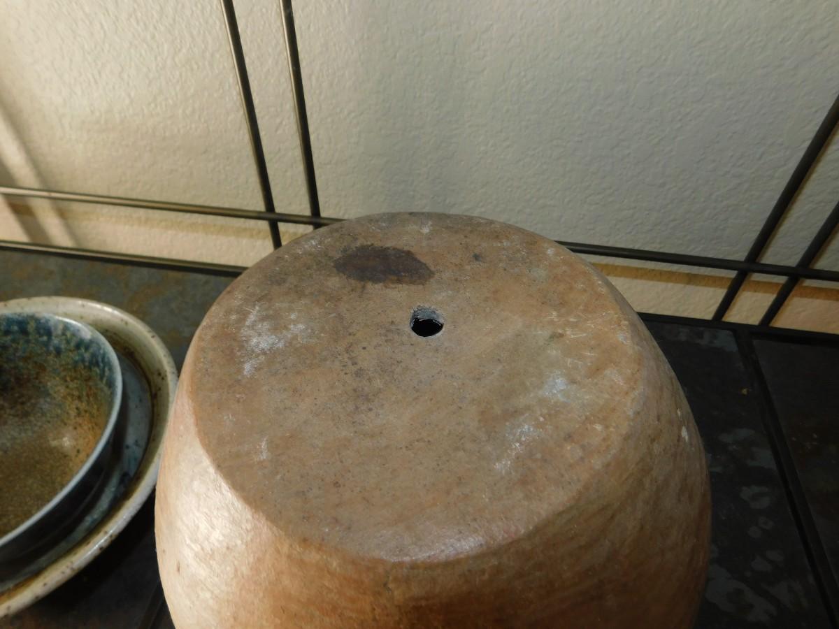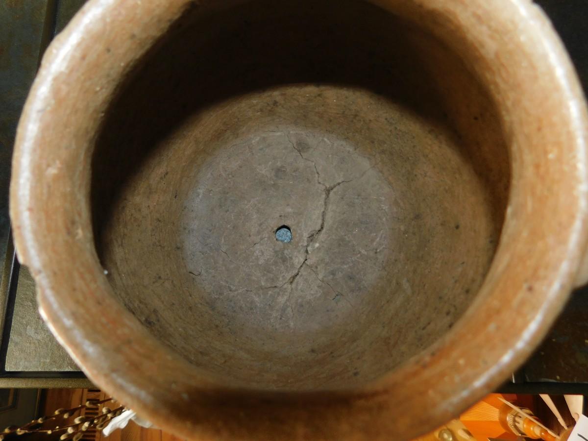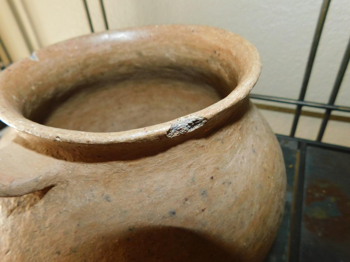 THE LARGE OLD CLAY POT DOES HAVE A COUPLE CHIPS AND CRACK LINES IT MEASURES APPROX 5" AT THE OPENING 8" ACROSS THE CENTER AND 6-1/2" TALL. THE BOWLS ARE 5" AND 7"