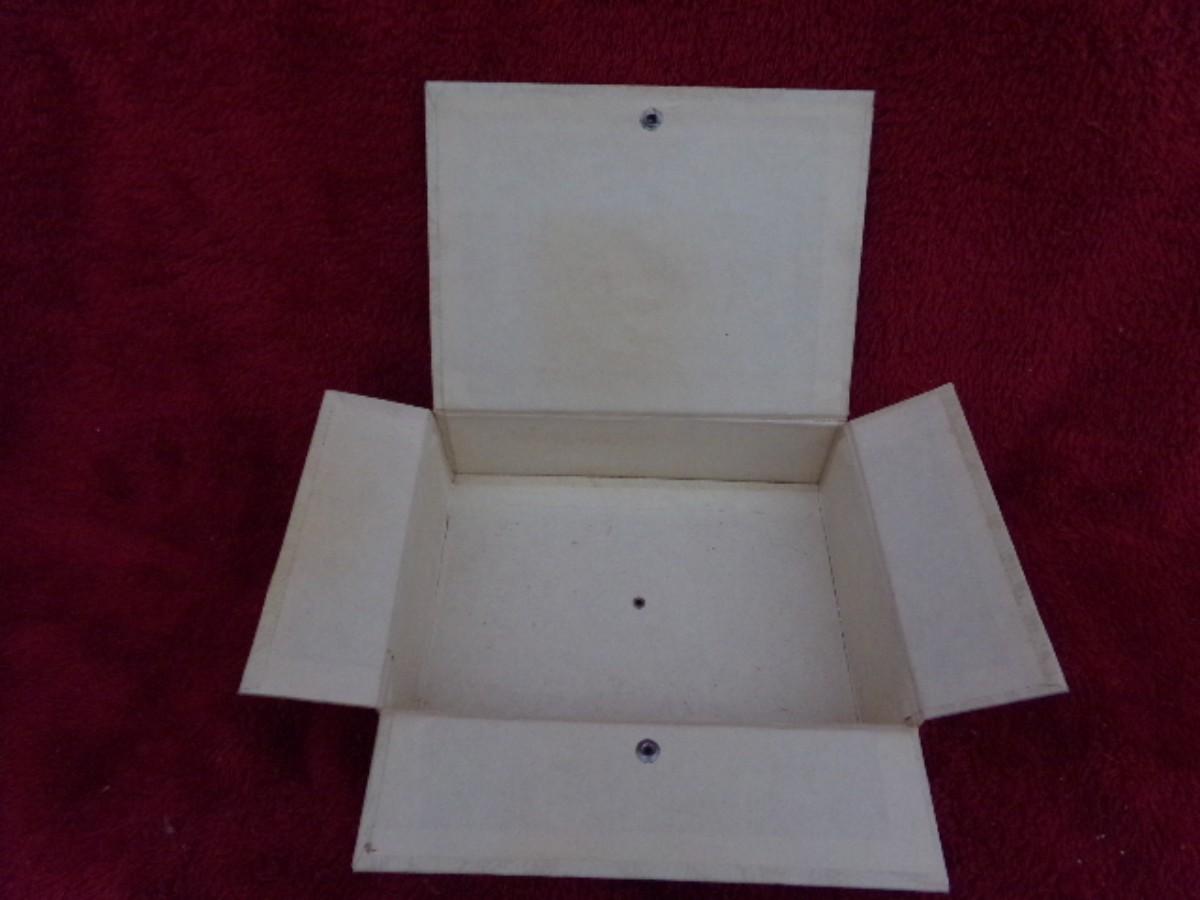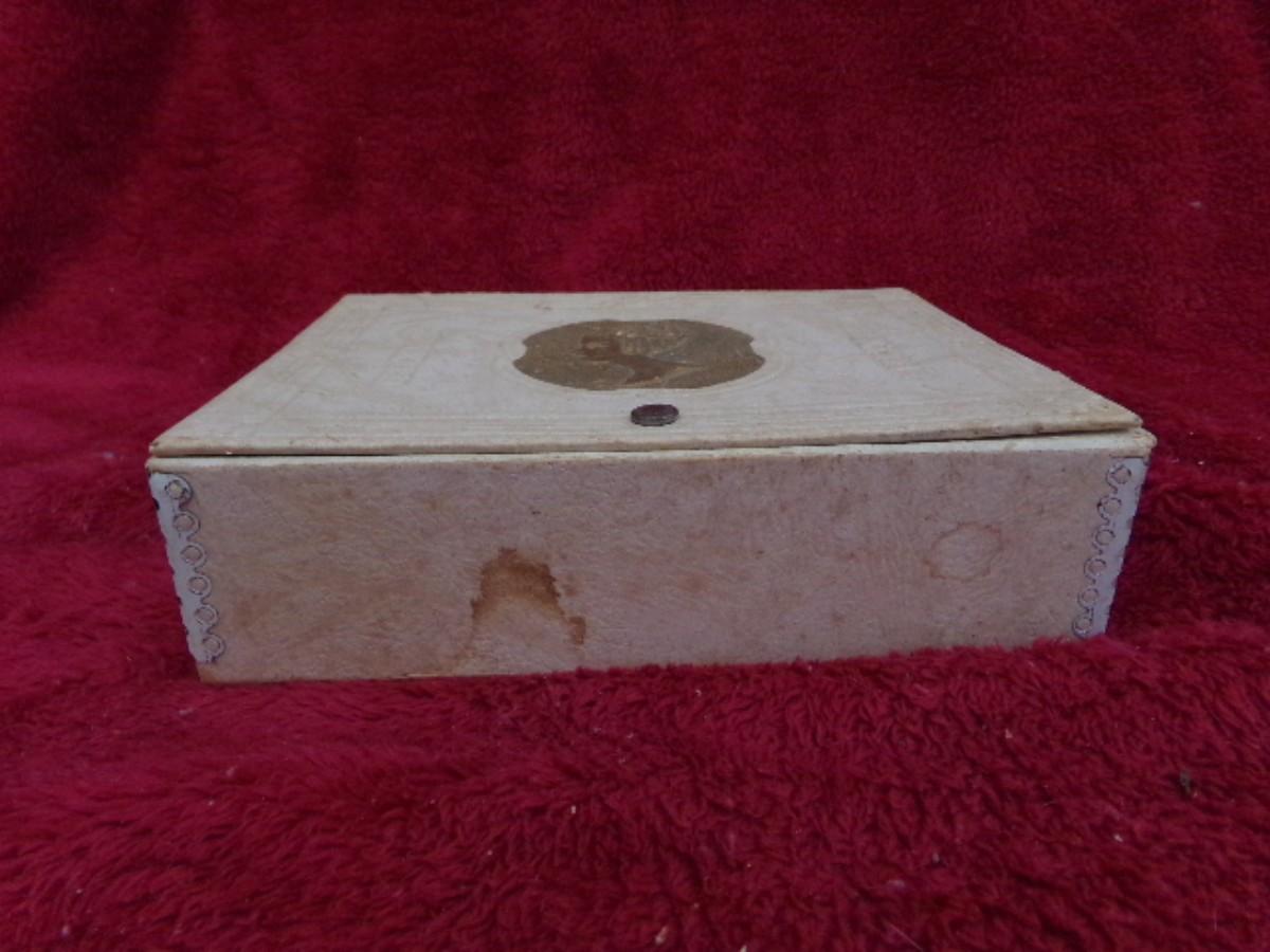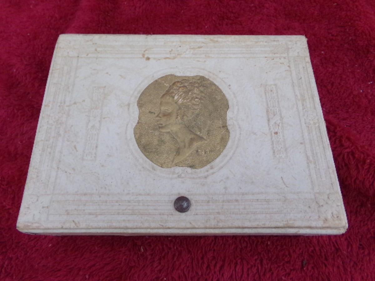 VERY OLD Keepsake box with a gold tone cameo on the lid. Lid snaps shut. Reinforced corners. About 8"x6"x2".